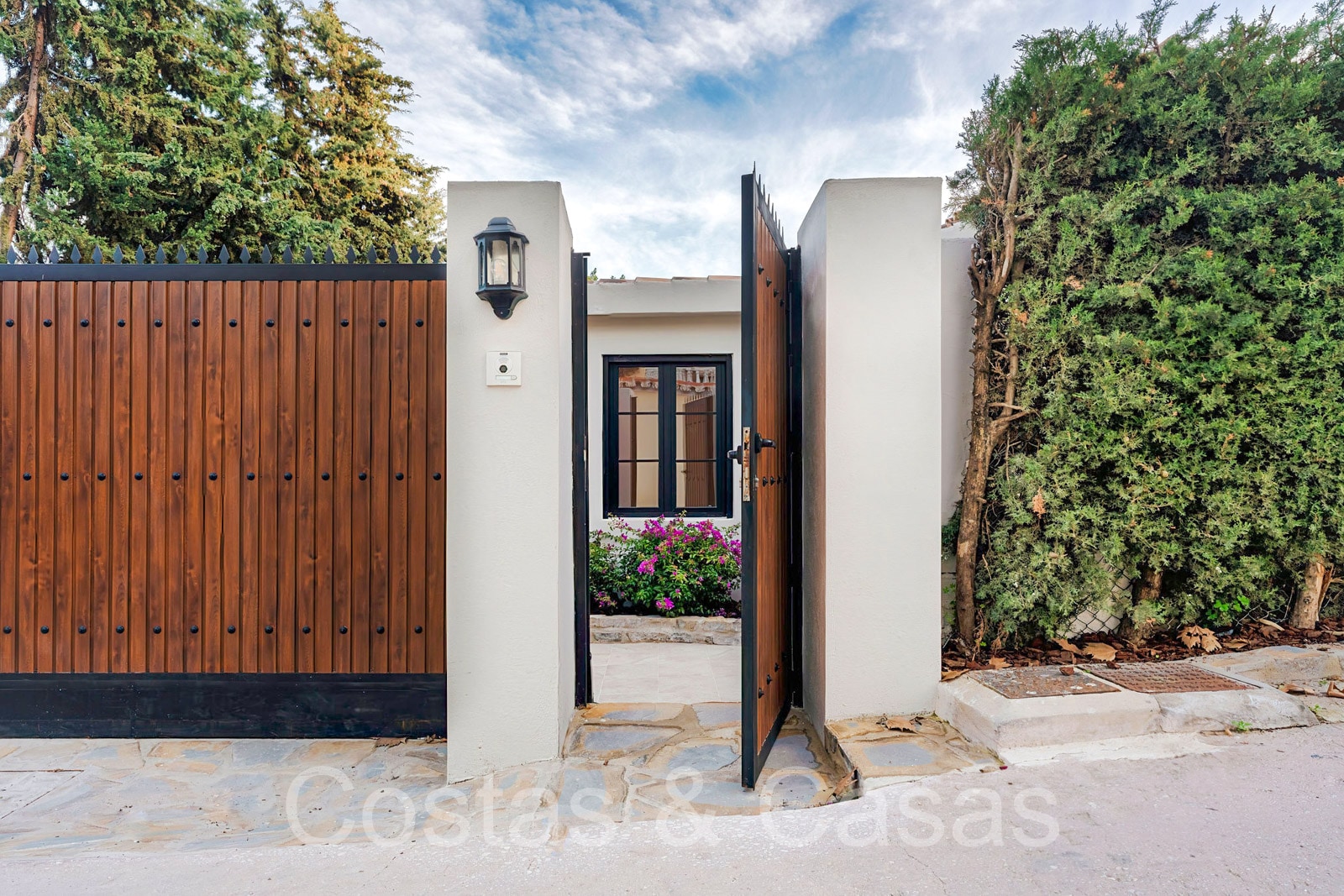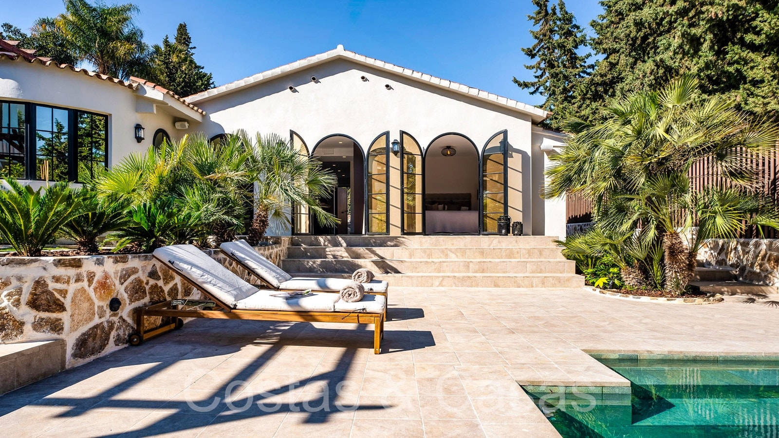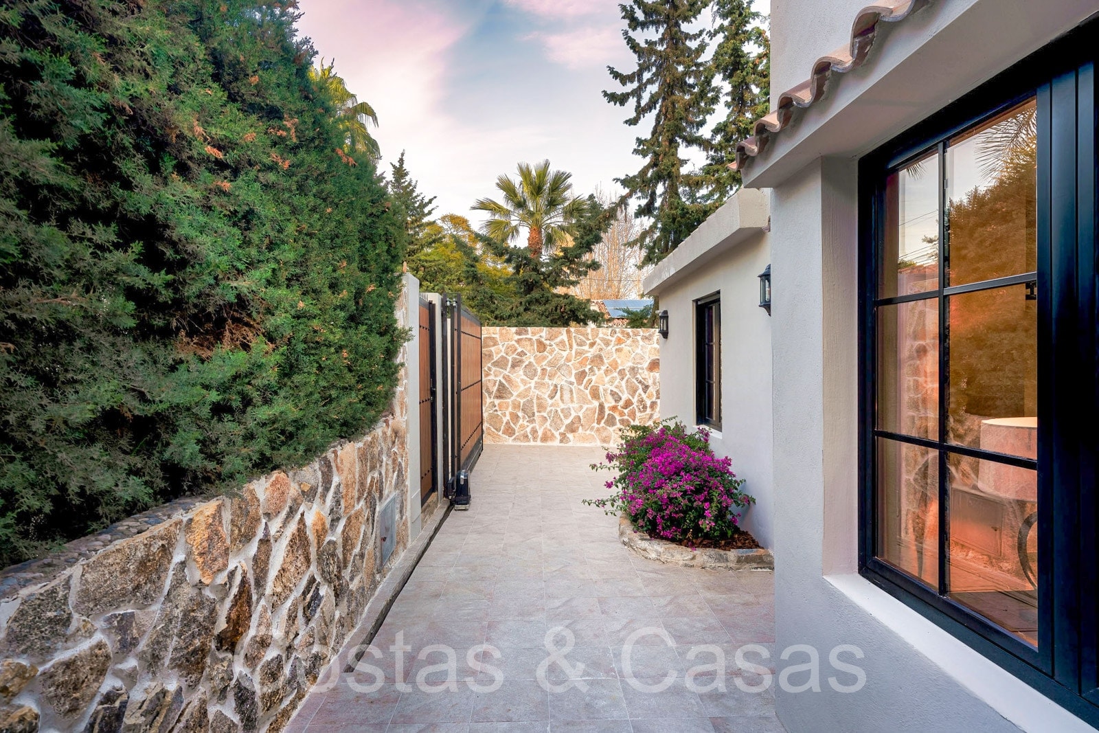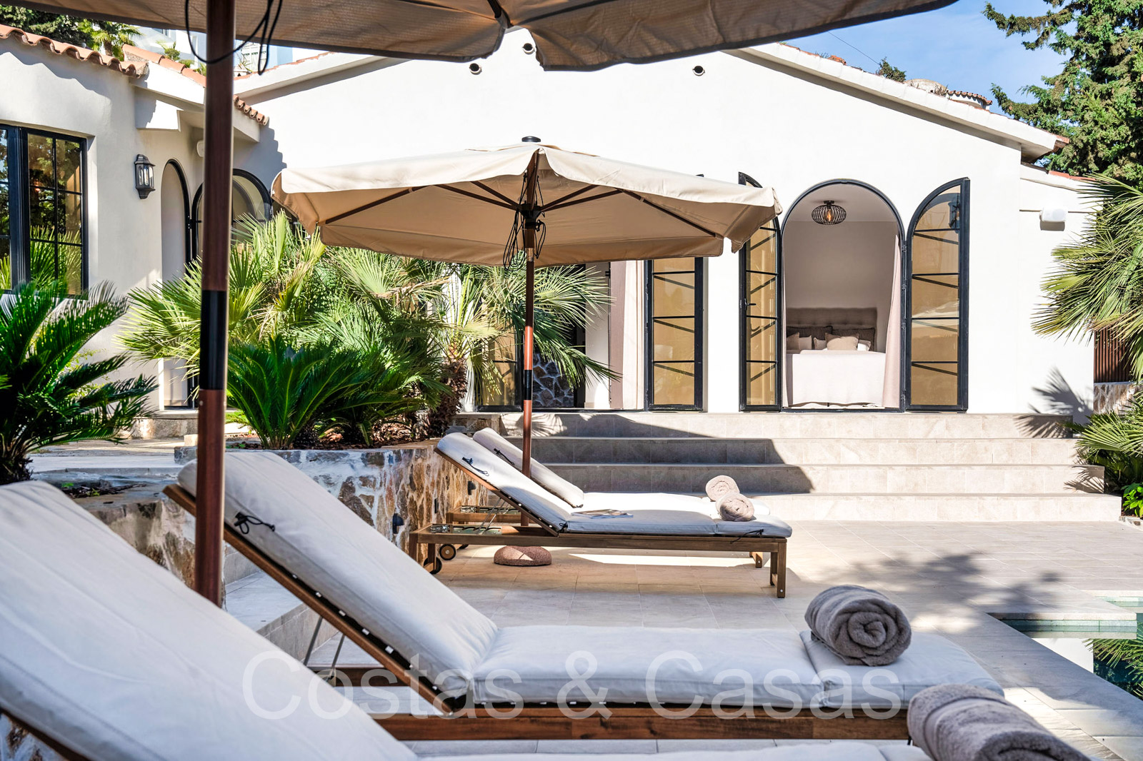 Completely renovated villa with a tropical design. Everything is on one level. Attention to the most detailed level of finishing. Refined and very stylishly furnished. Thanks to large, curved window structures, there is plenty of natural light that brings the interior even more to life. The entrance opens onto the open living space with a cozy lounge. Fully equipped designer kitchen with cooking island and dining table. 3 en-suite bedrooms, 2 with direct access to the inviting outdoor area. An outbuilding will be furnished with a separate guesthouse. Laundry room. Carport for 1 car.