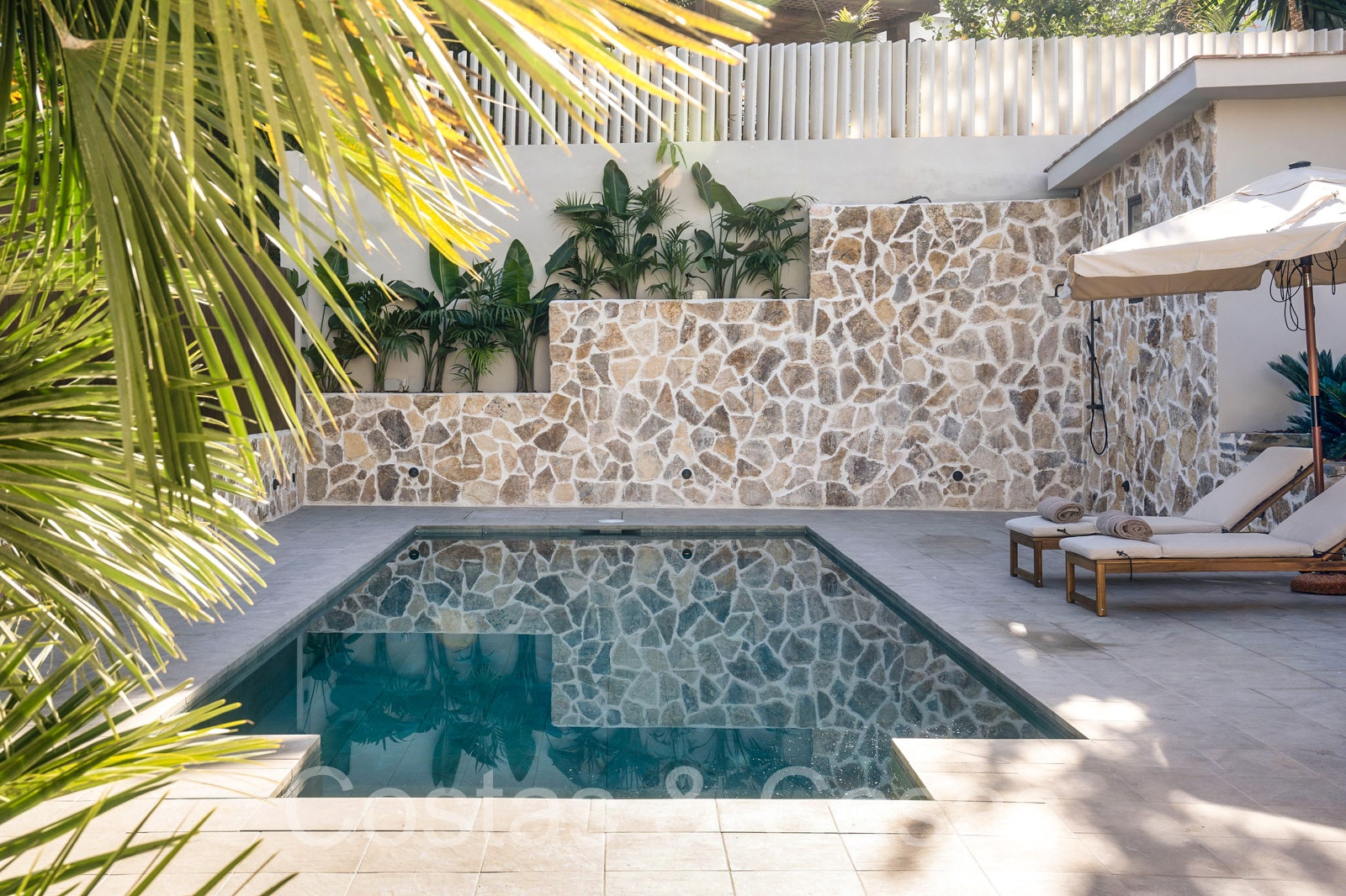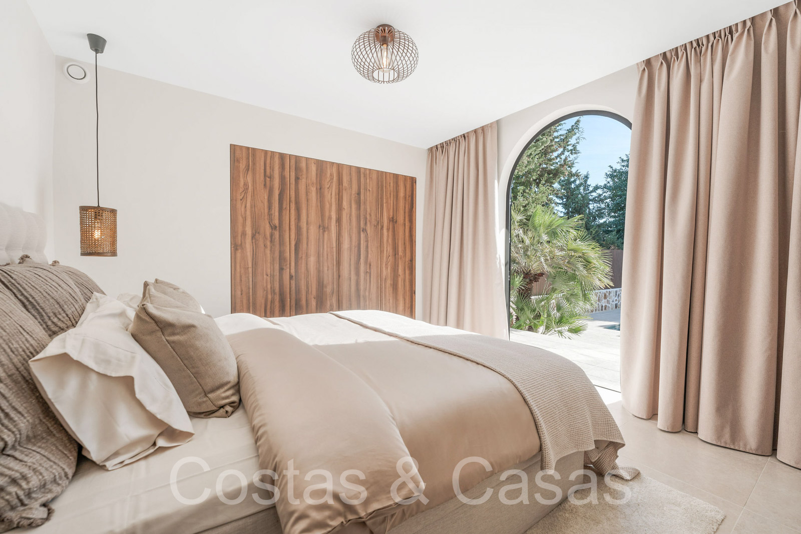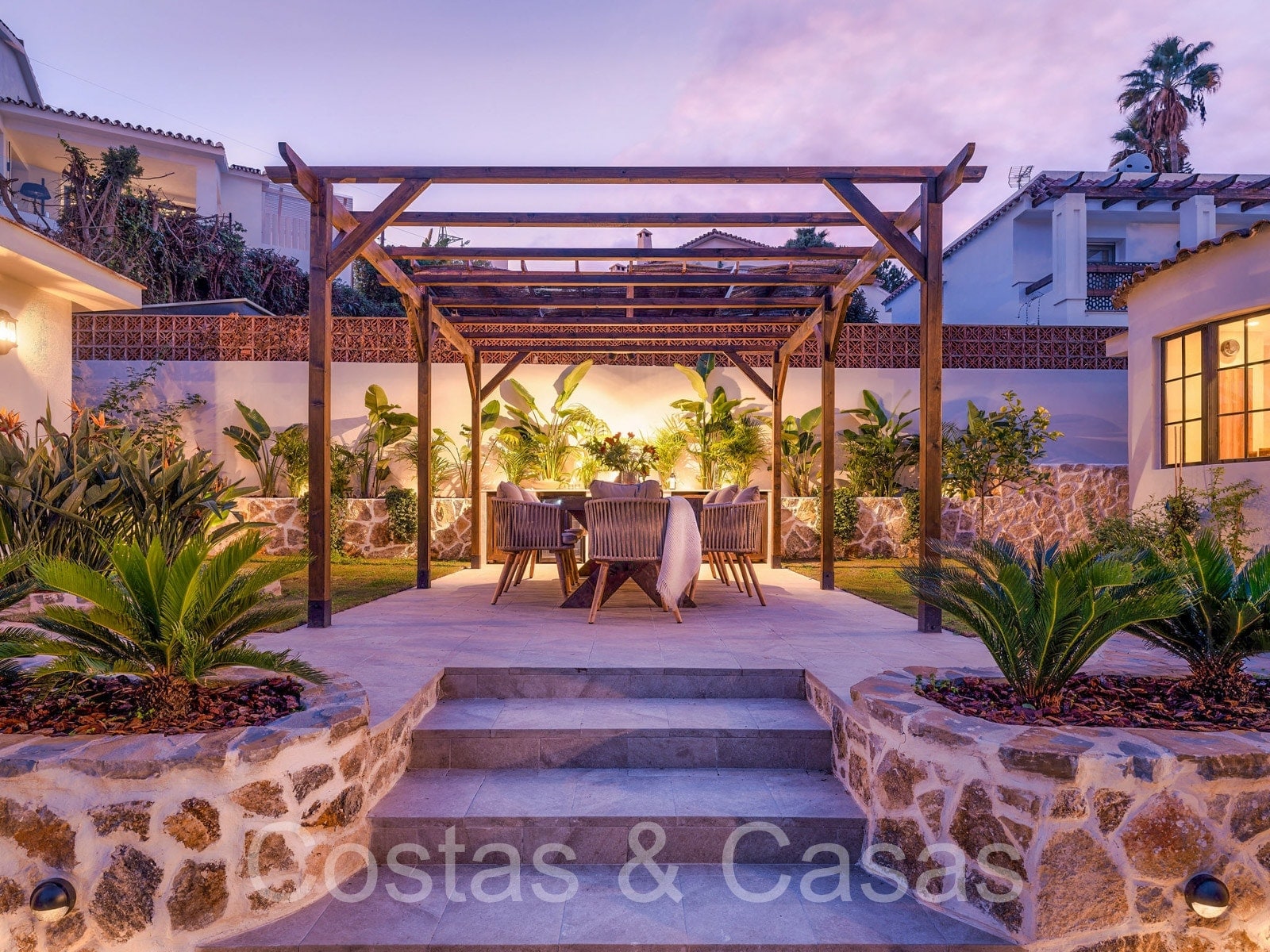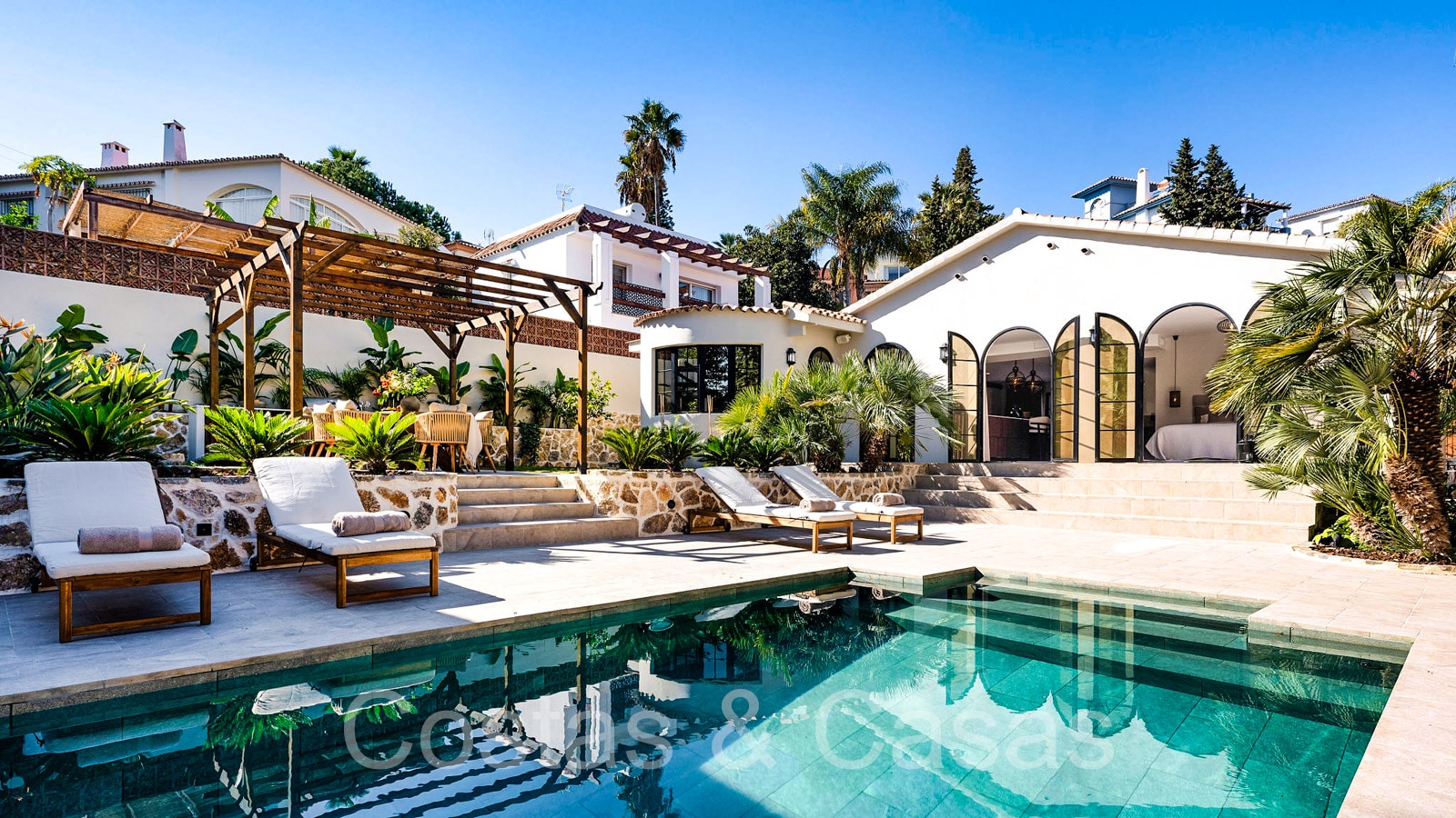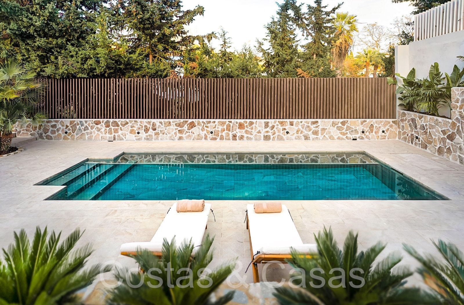 Completely renovated villa with a tropical design. Everything is on one level. Attention to the most detailed level of finishing. Refined and very stylishly furnished. Thanks to large, curved window structures, there is plenty of natural light that brings the interior even more to life. The entrance opens onto the open living space with a cozy lounge. Fully equipped designer kitchen with cooking island and dining table. 3 en-suite bedrooms, 2 with direct access to the inviting outdoor area. An outbuilding will be furnished with a separate guesthouse. Laundry room. Carport for 1 car.