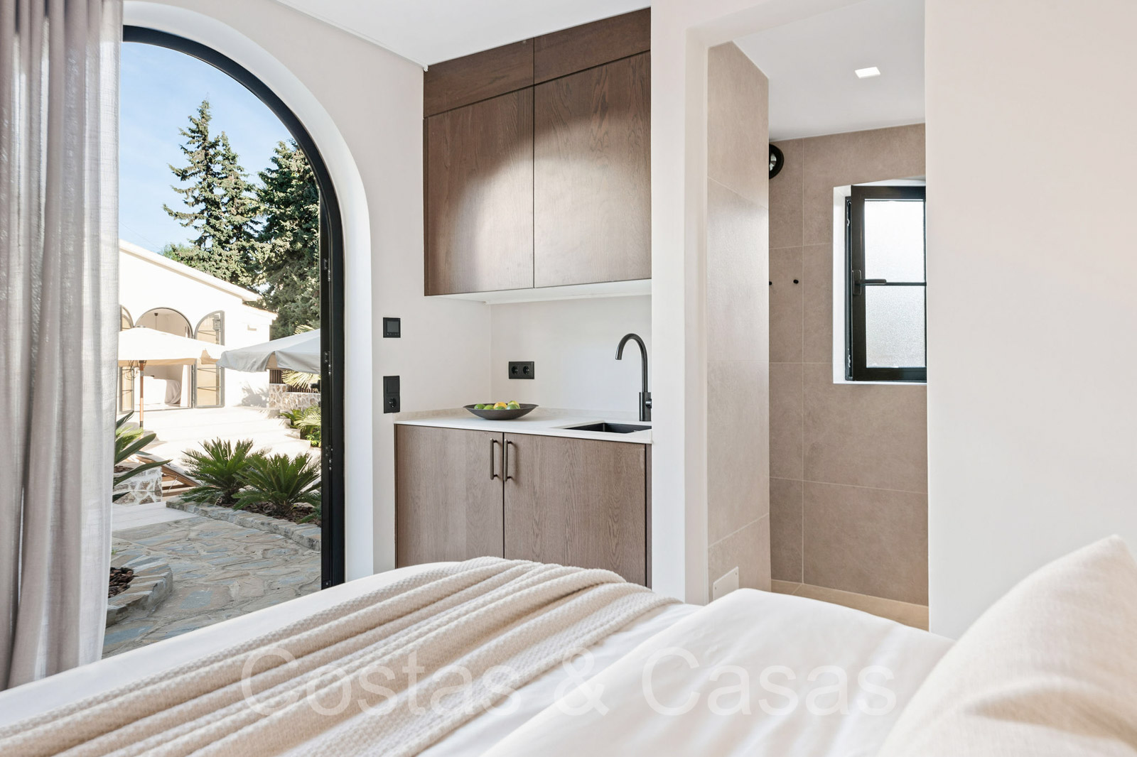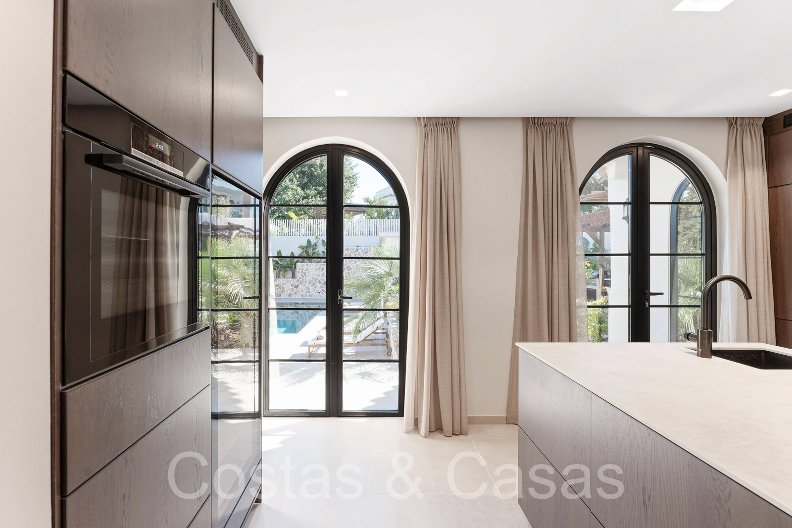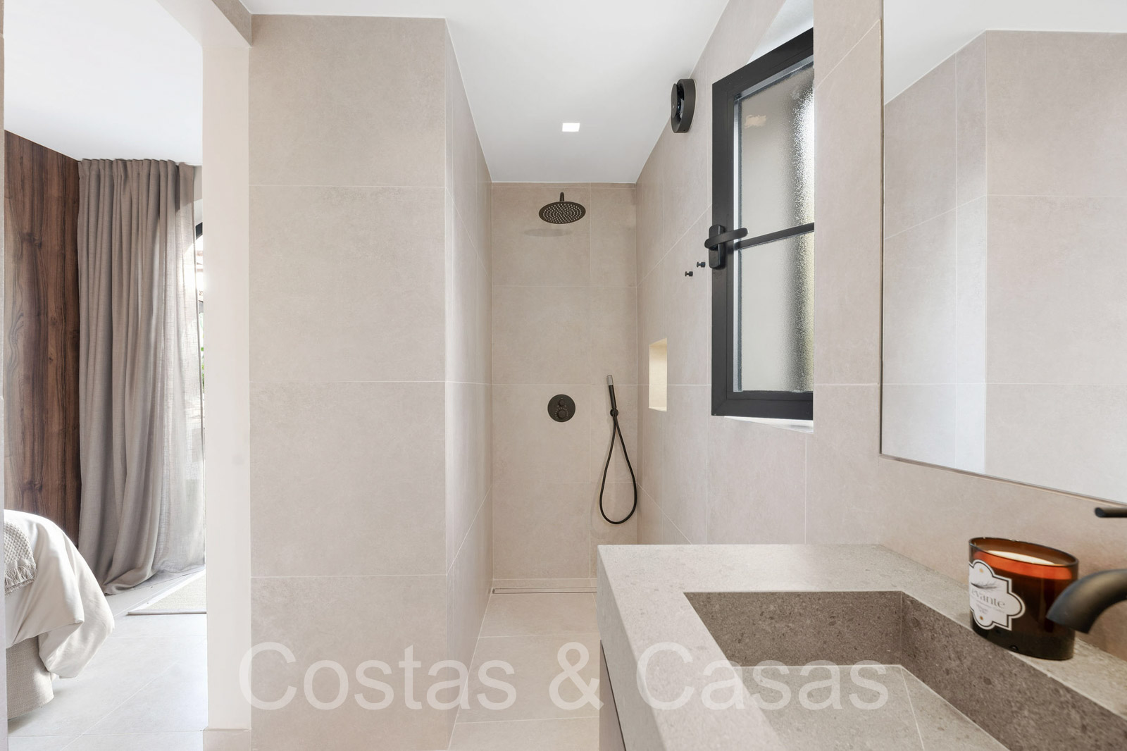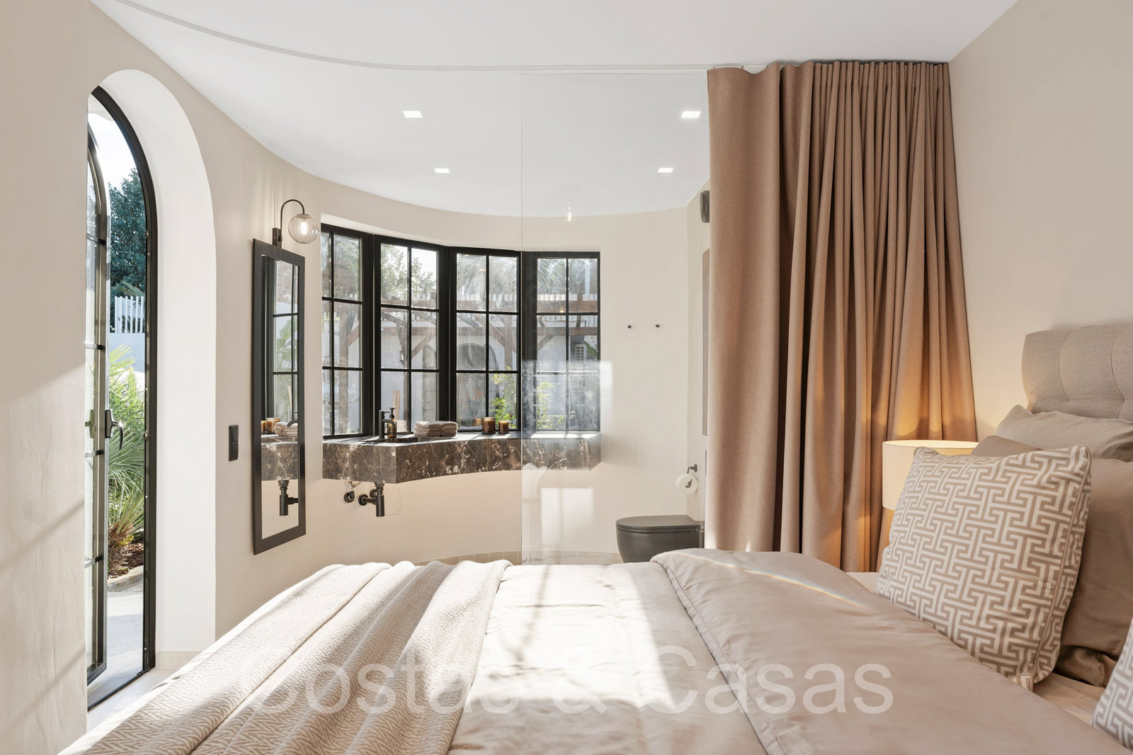 Completely renovated villa with a tropical design. Everything is on one level. Attention to the most detailed level of finishing. Refined and very stylishly furnished. Thanks to large, curved window structures, there is plenty of natural light that brings the interior even more to life. The entrance opens onto the open living space with a cozy lounge. Fully equipped designer kitchen with cooking island and dining table. 3 en-suite bedrooms, 2 with direct access to the inviting outdoor area. An outbuilding will be furnished with a separate guesthouse. Laundry room. Carport for 1 car.