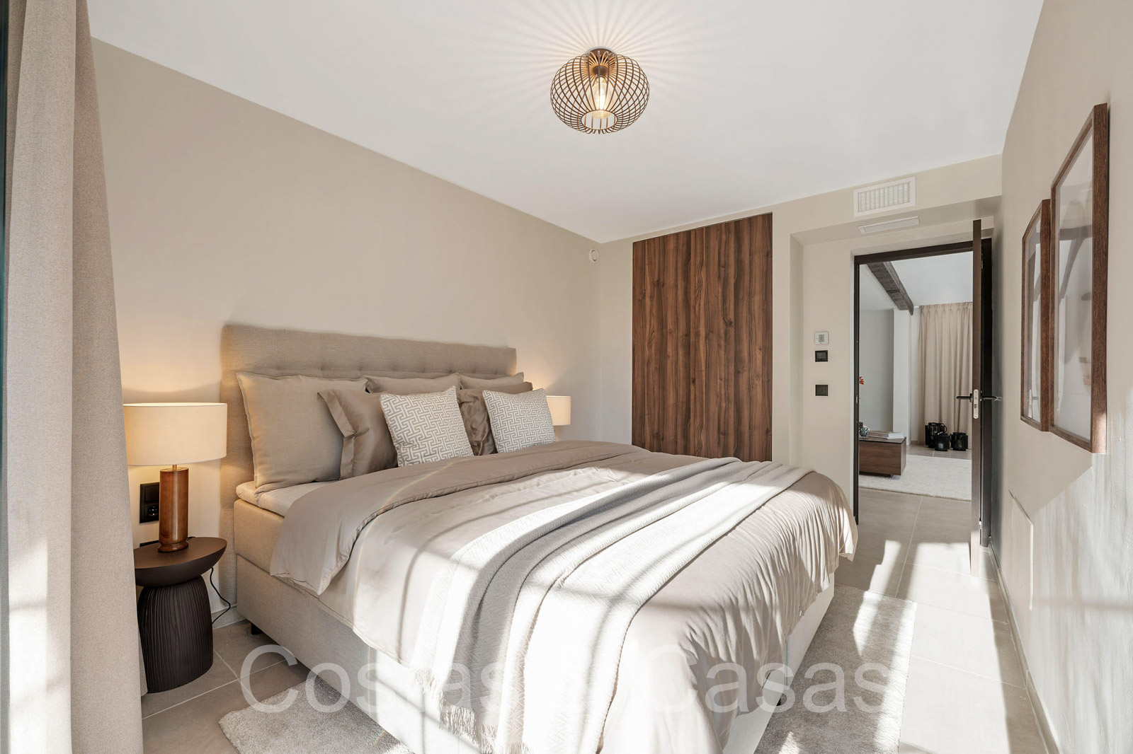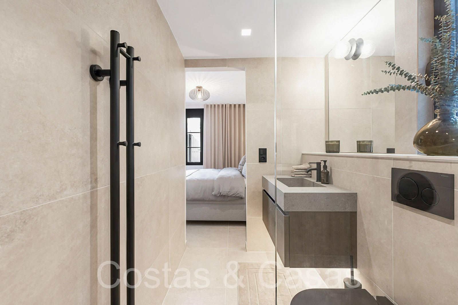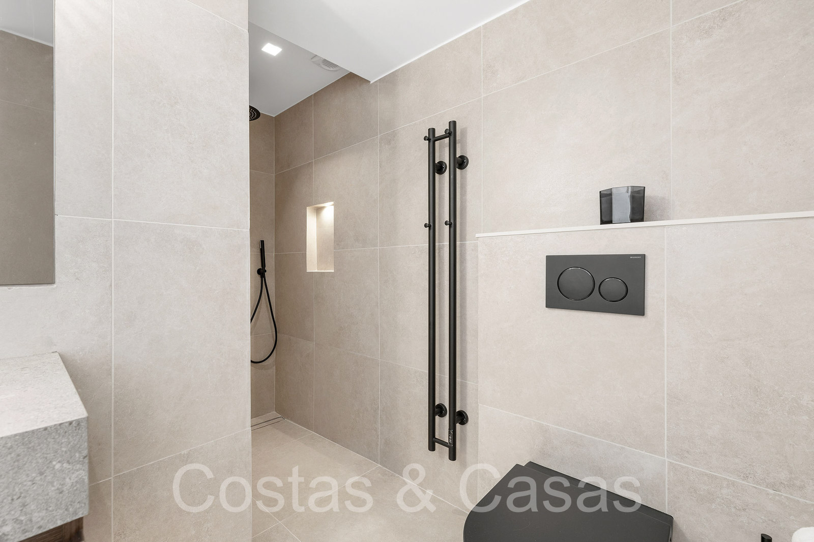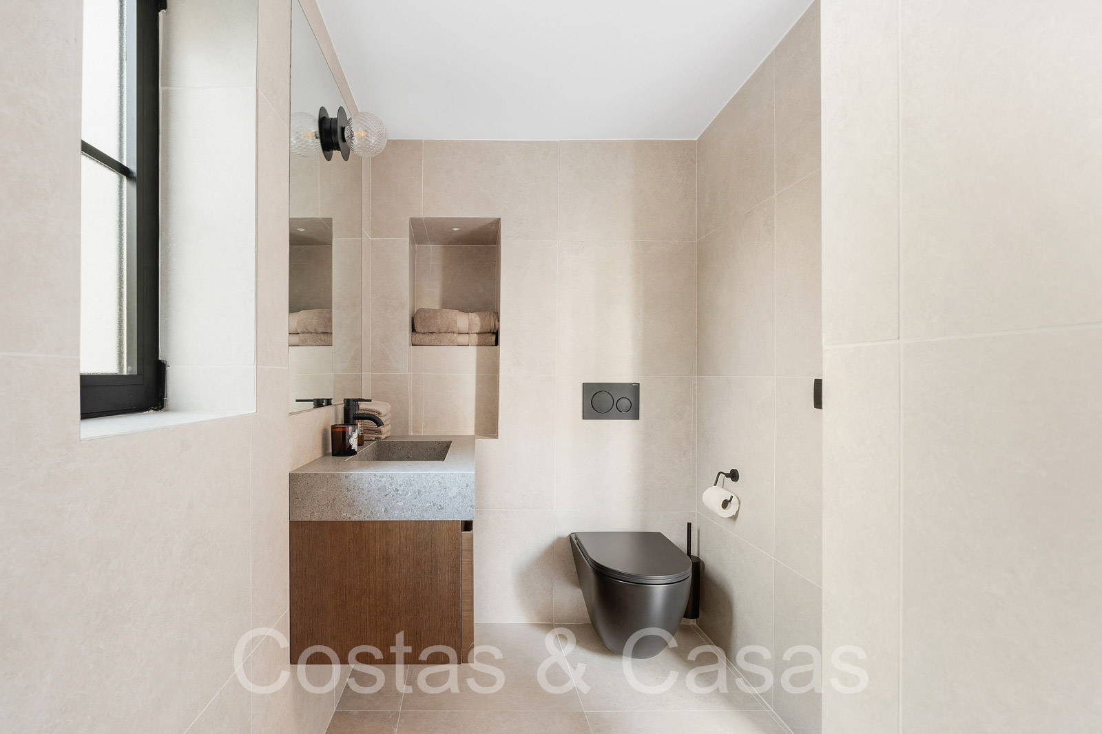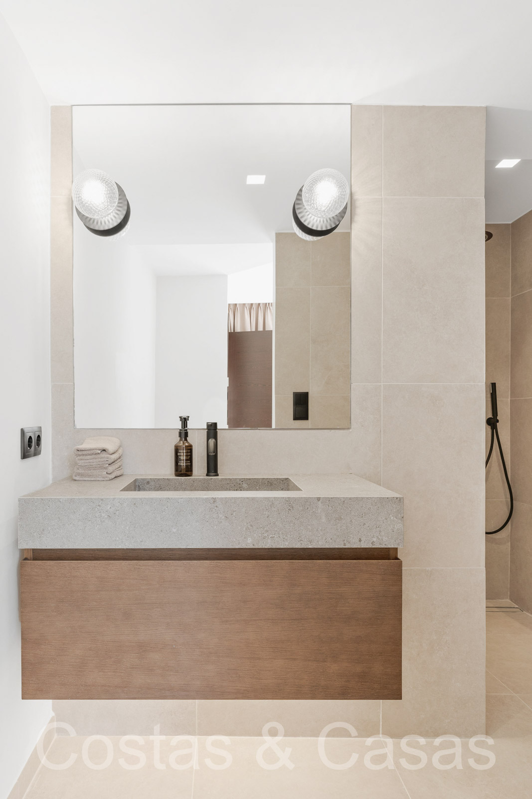Completely renovated villa with a tropical design. Everything is on one level. Attention to the most detailed level of finishing. Refined and very stylishly furnished. Thanks to large, curved window structures, there is plenty of natural light that brings the interior even more to life. The entrance opens onto the open living space with a cozy lounge. Fully equipped designer kitchen with cooking island and dining table. 3 en-suite bedrooms, 2 with direct access to the inviting outdoor area. An outbuilding will be furnished with a separate guesthouse. Laundry room. Carport for 1 car.