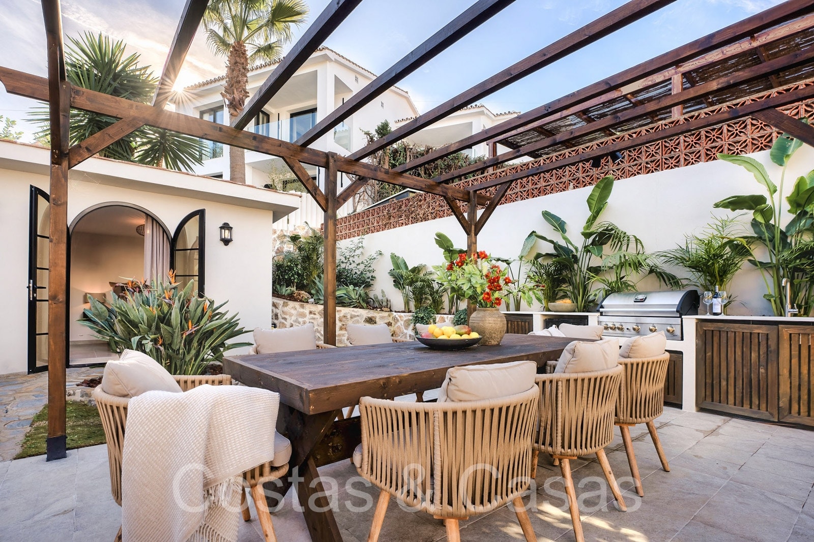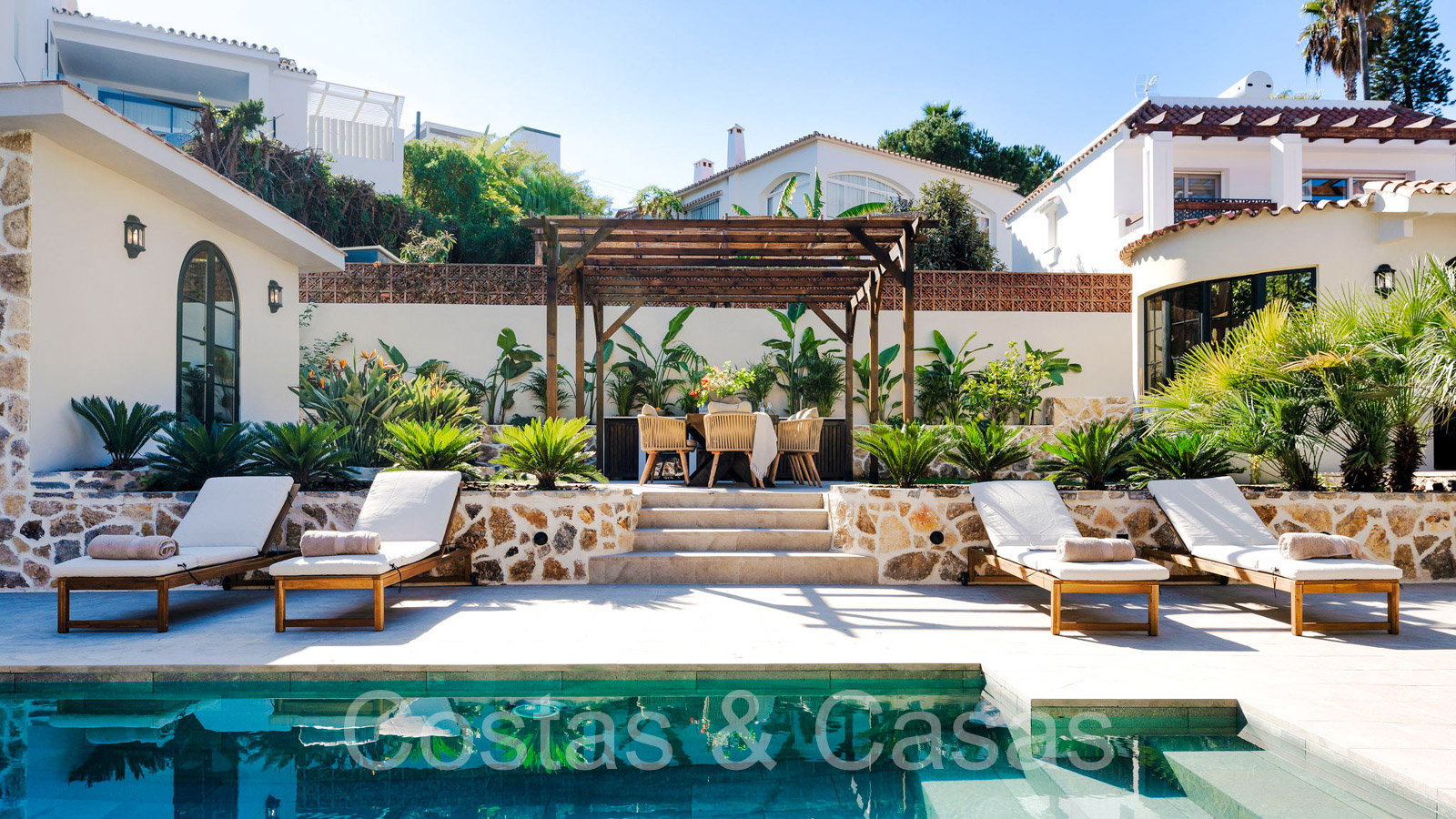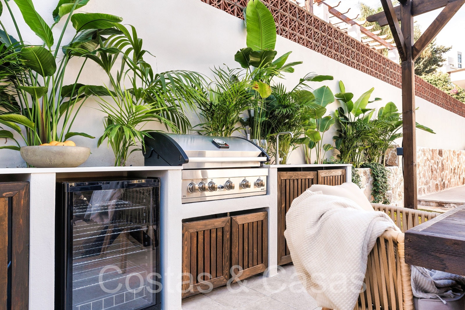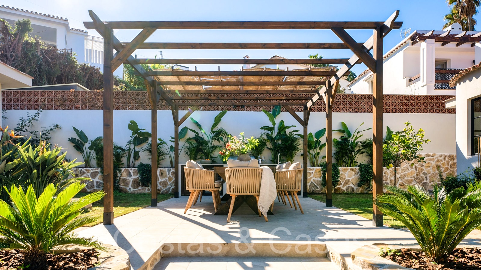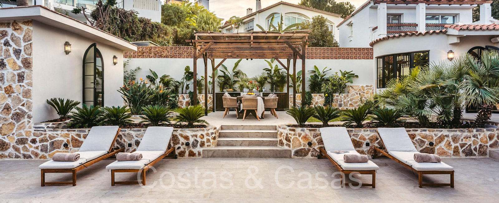 Fenced plot in privileged location. Beautiful exterior with high-quality landscaping and Mediterranean plants. Balinese style private heated built-in swimming pool flanked by a sun terrace with sunbeds. Pergola terrace with outdoor kitchen, barbecue and dining table.
