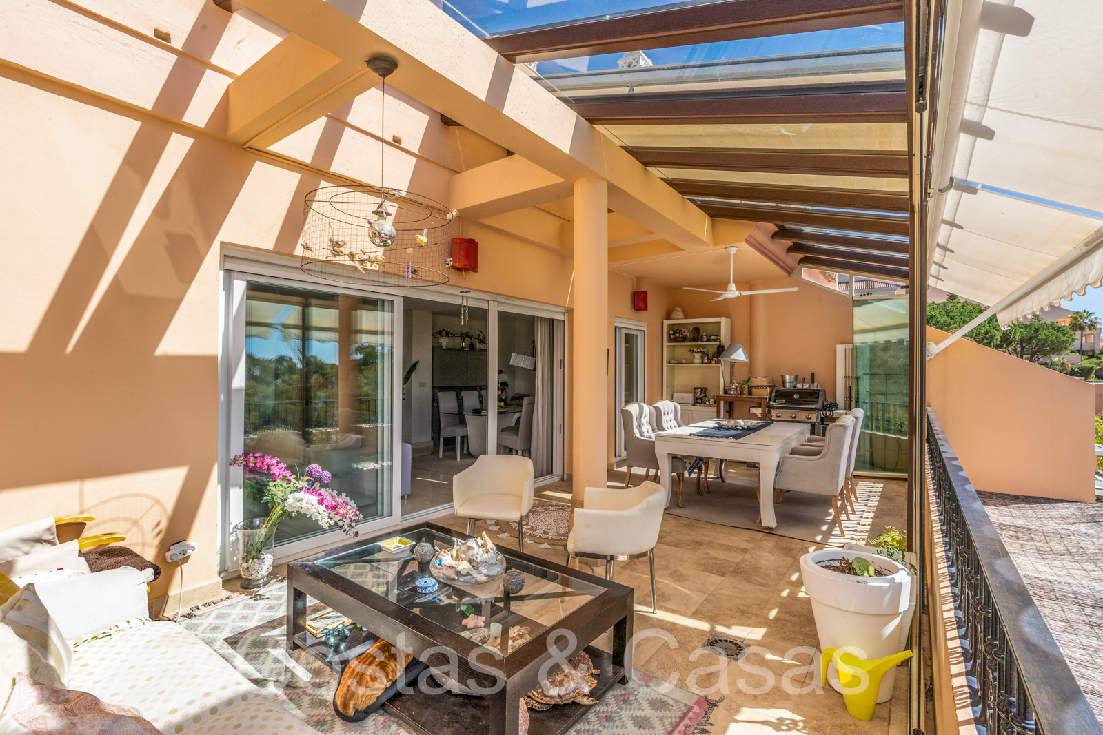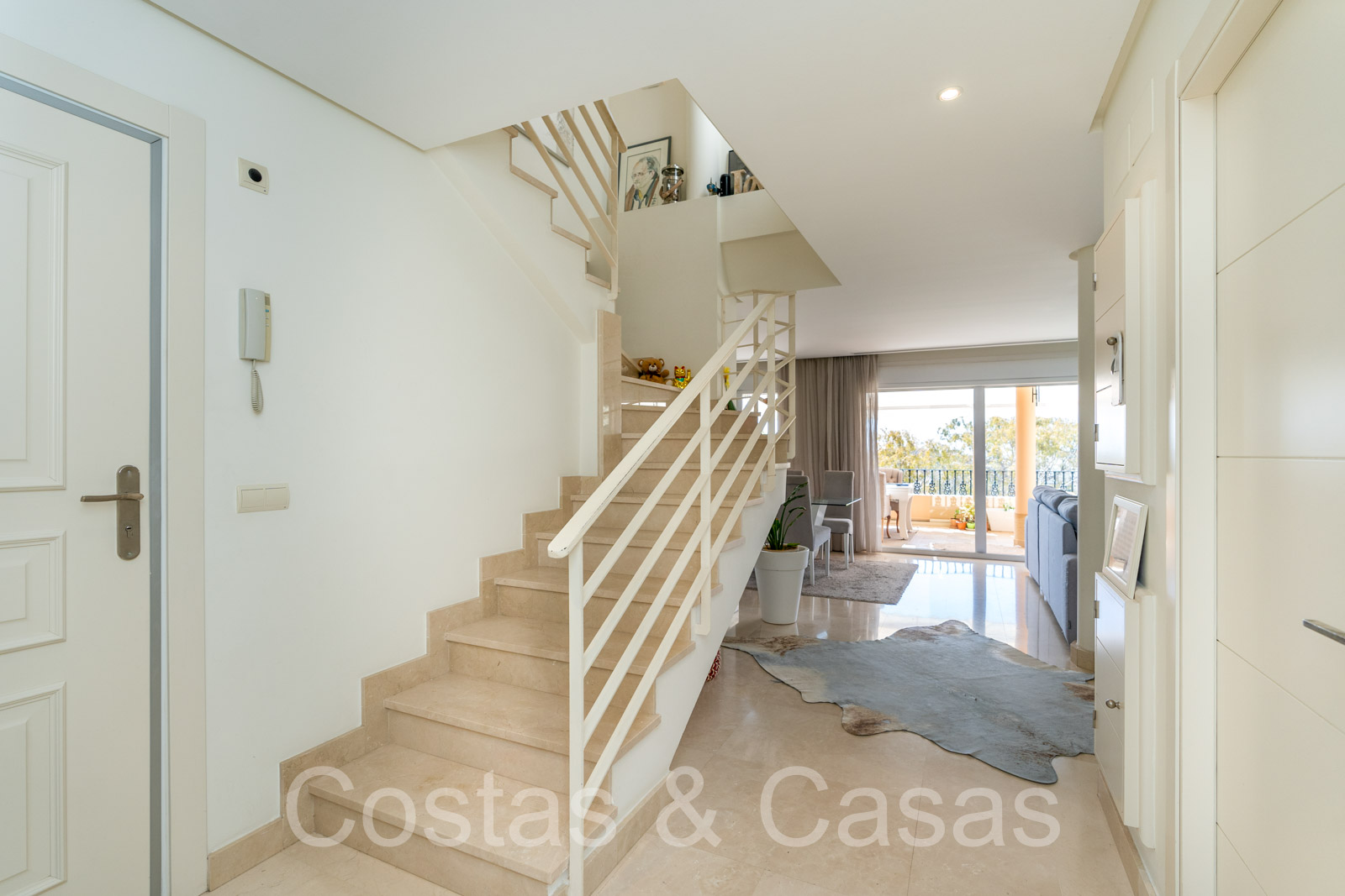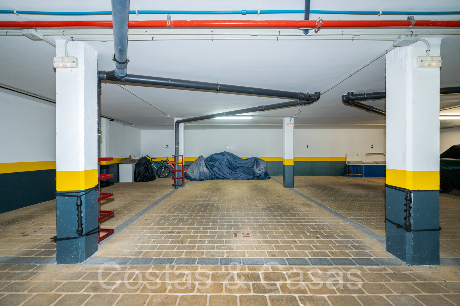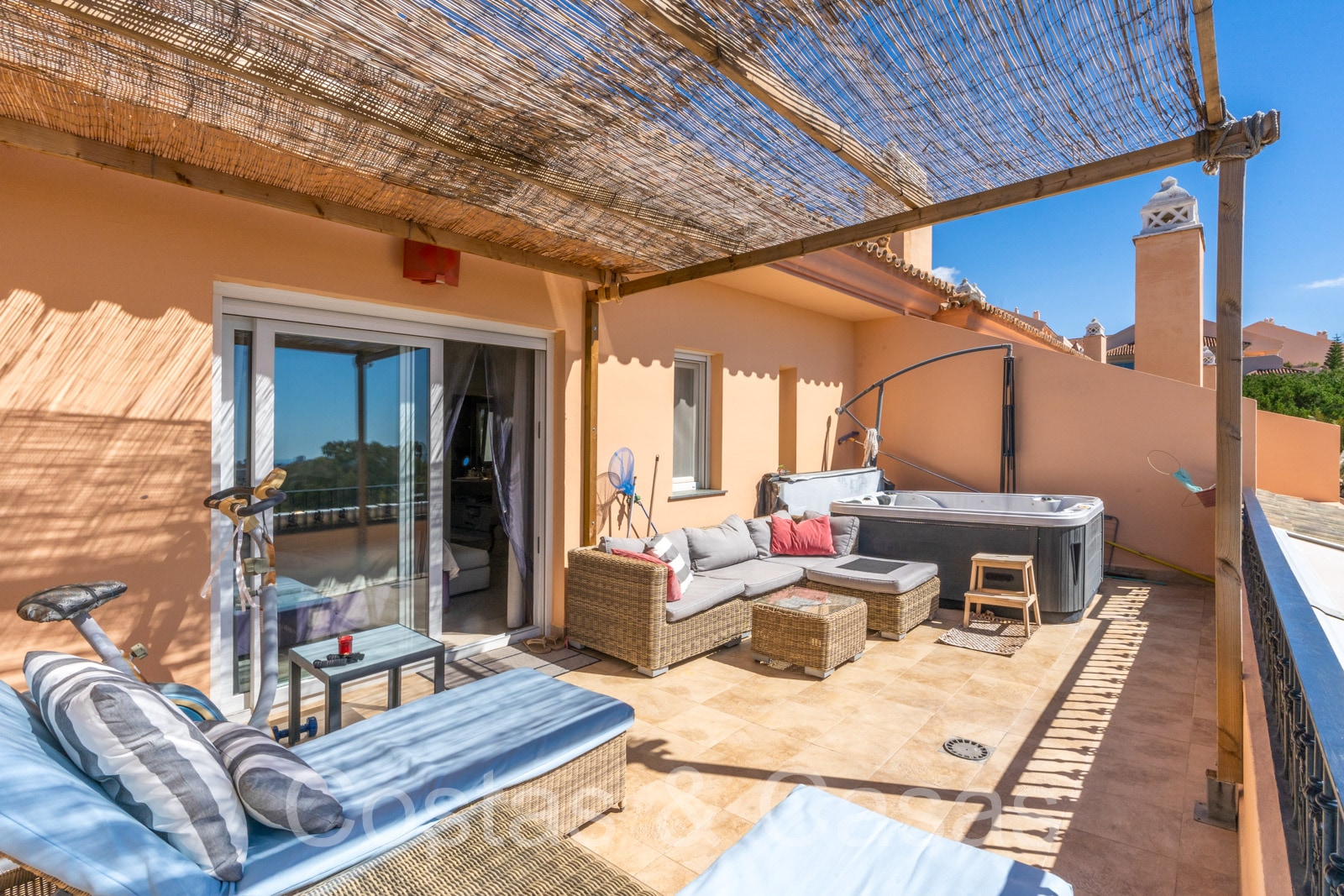 Duplex penthouse with Mediterranean architectural style. Entrance with staircase and guest toilet. Facing south. Open plan living space with integrated dining room. High sliding windows open onto the covered main terrace. This terrace provides a 2nd dining area and a lounge and can possibly be closed by glass curtains. Separate, fully equipped kitchen with a separate laundry room. 2 bedrooms and 2 bathrooms. The master suite on the top floor opens onto a sunny private terrace with a jacuzzi and chill-out. You also enjoy a panoramic view of the lush surroundings and partly of the Mediterranean Sea. Storage. Indoor garage for 1 car.