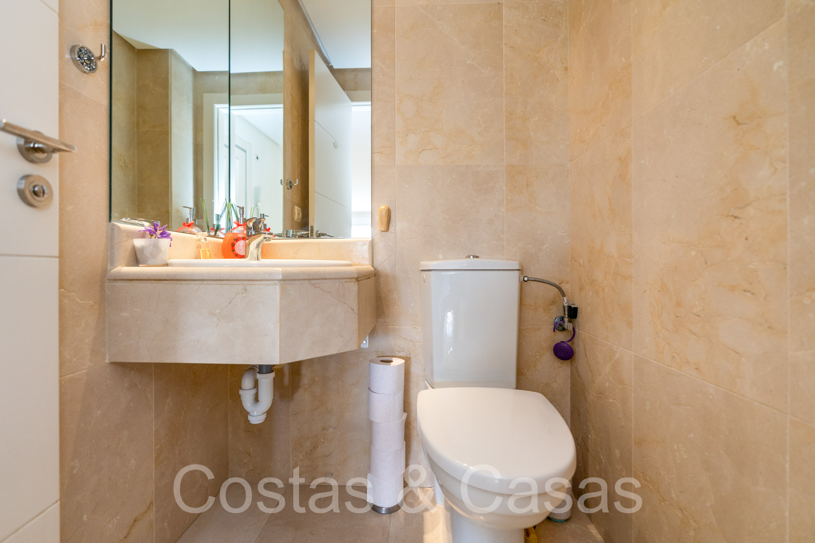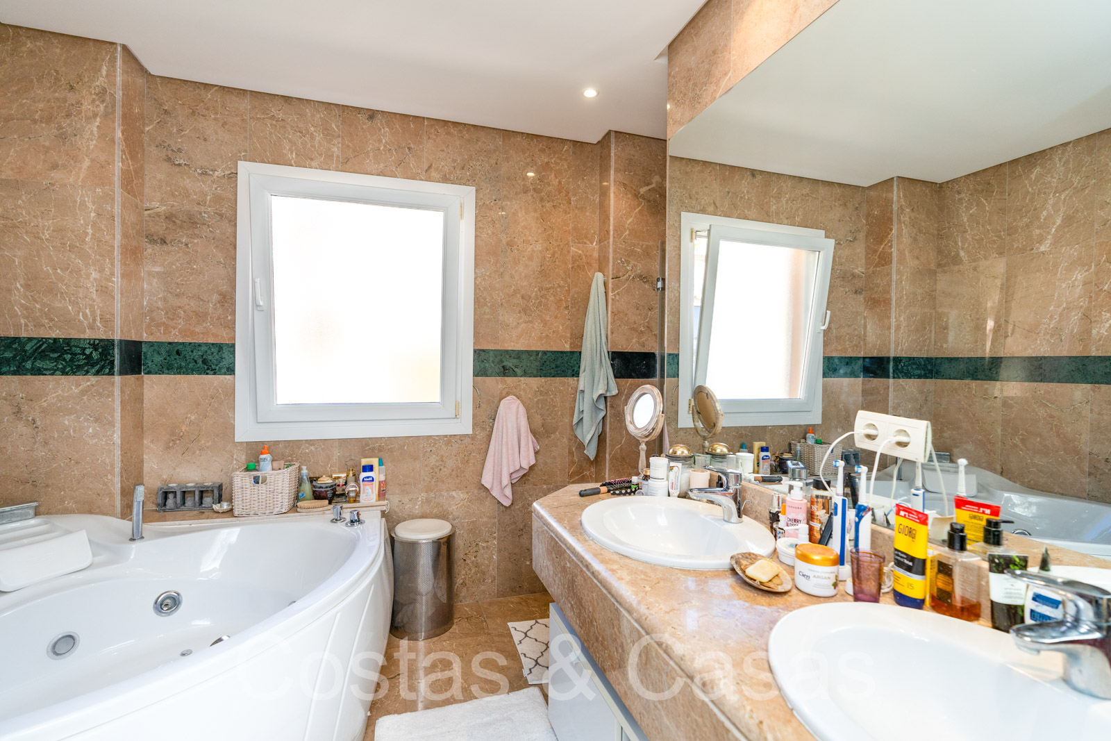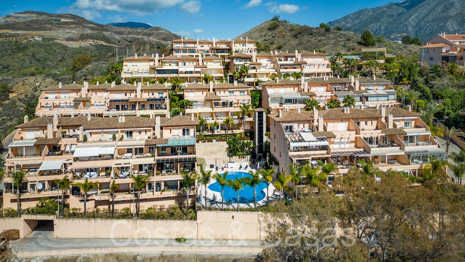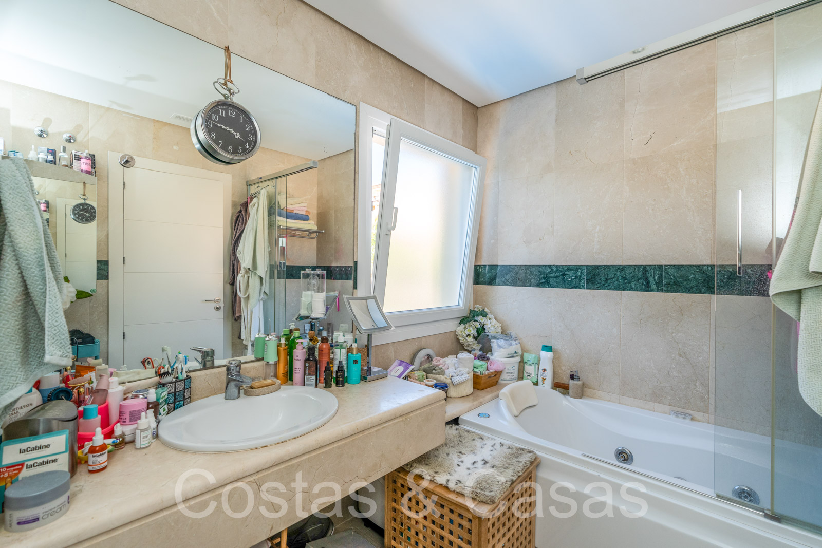 Duplex penthouse with Mediterranean architectural style. Entrance with staircase and guest toilet. Facing south. Open plan living space with integrated dining room. High sliding windows open onto the covered main terrace. This terrace provides a 2nd dining area and a lounge and can possibly be closed by glass curtains. Separate, fully equipped kitchen with a separate laundry room. 2 bedrooms and 2 bathrooms. The master suite on the top floor opens onto a sunny private terrace with a jacuzzi and chill-out. You also enjoy a panoramic view of the lush surroundings and partly of the Mediterranean Sea. Storage. Indoor garage for 1 car.