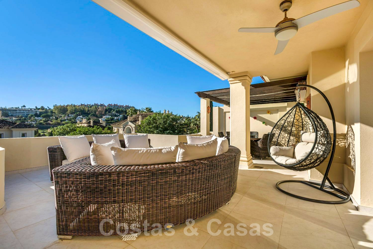 Partly covered spacious terrace with views of the gardens and the other golf course towards the sea.