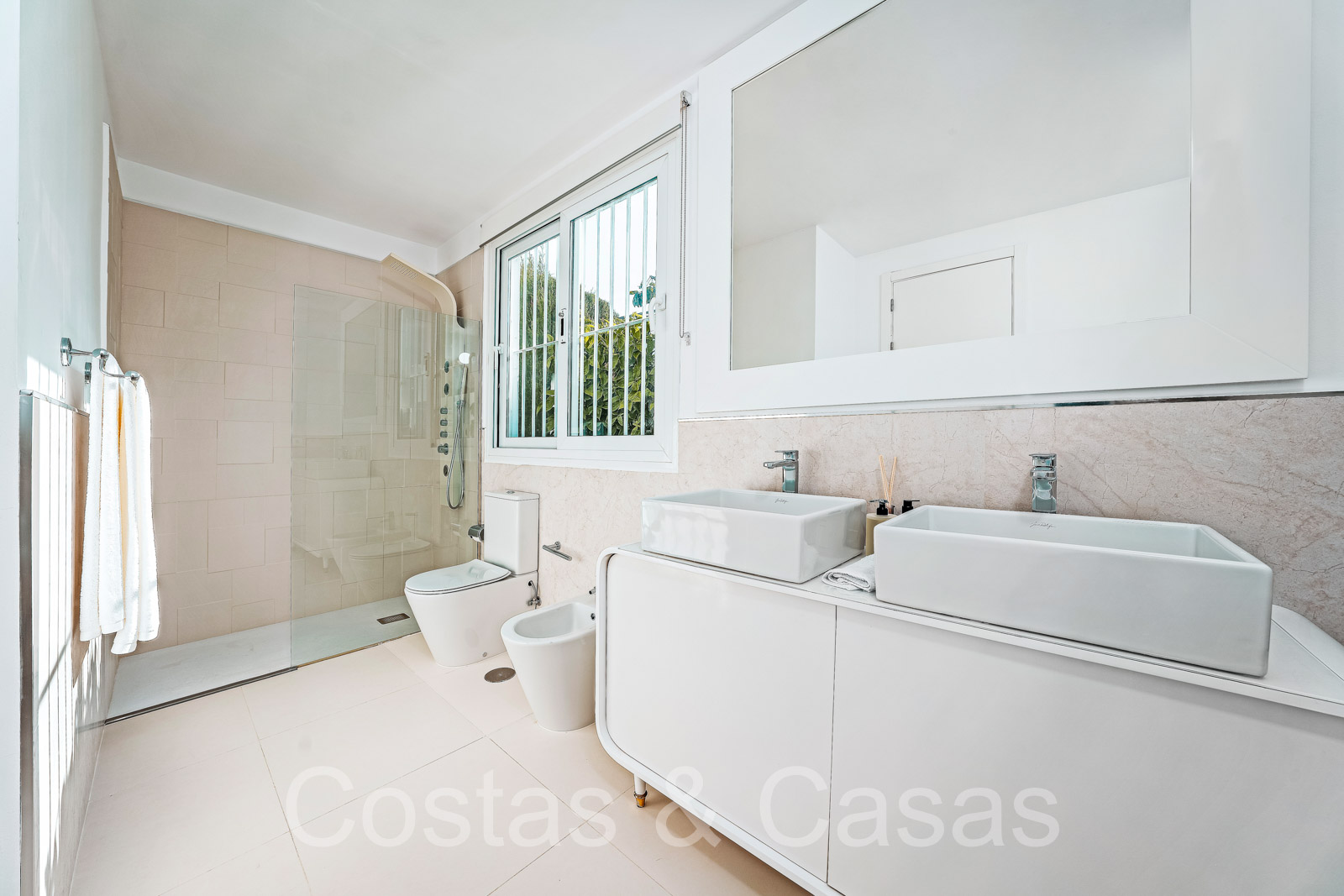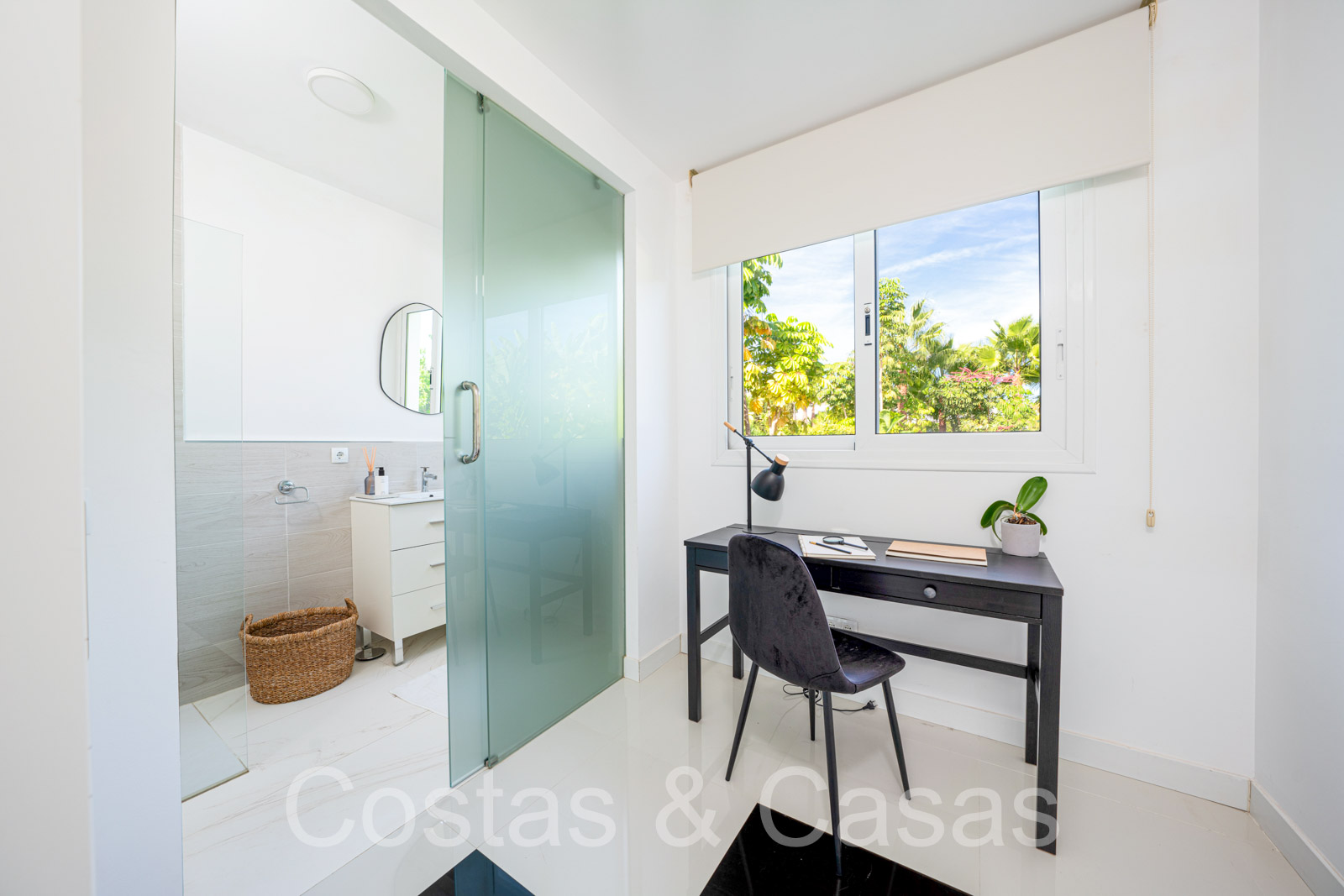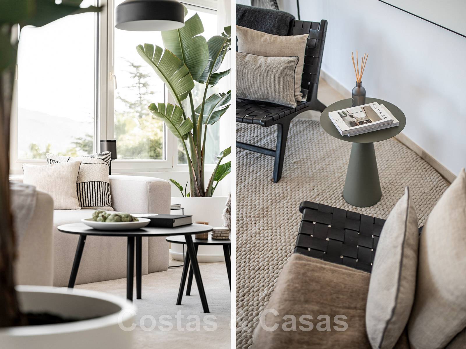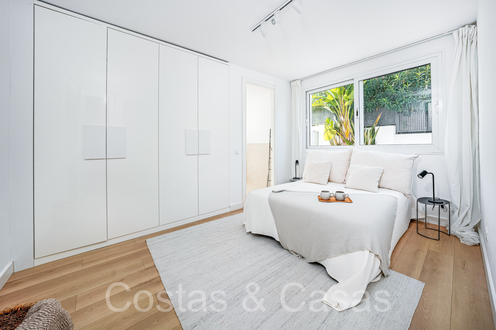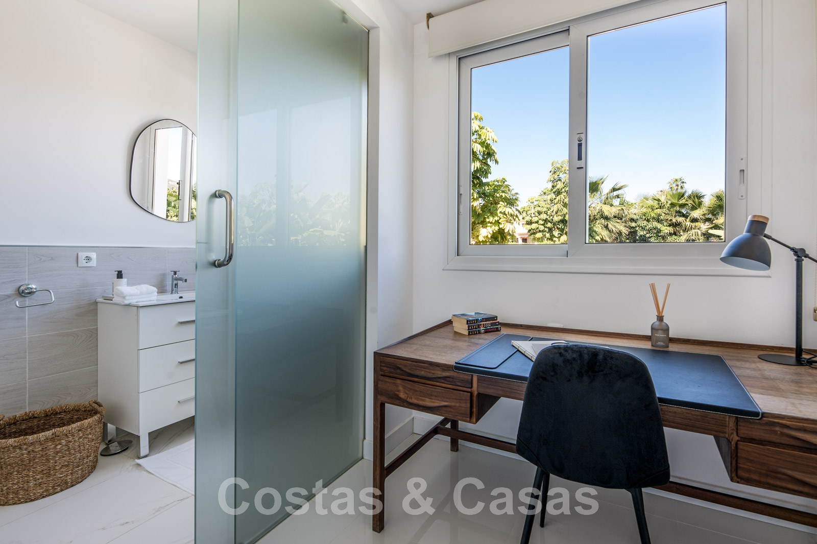 Recently renovated with attention to a detailed and high standard of finishing. An interplay of plenty of sunlight, light floors and the use of soft colours creates a warm and homely living atmosphere. The entrance hall opens onto the large living space with a living and dining room. Open plan layout. Open, fully equipped kitchen with granite worktops and with access to a balcony equipped with a seating area. Utility room/storage room. High sliding windows create bright rooms that look stunning in combination with the elegant furniture. Hardwood floors in the bedrooms. 2 en-suite bedrooms on the ground floor. Office space with en-suite bathroom, possibly to be converted into a bedroom. Stairwell with guest toilet. The master bedroom is on the upper floor and has an en-suite bathroom and walk-in wardrobe. In addition, it enjoys a private terrace of 13m². Laundry room.