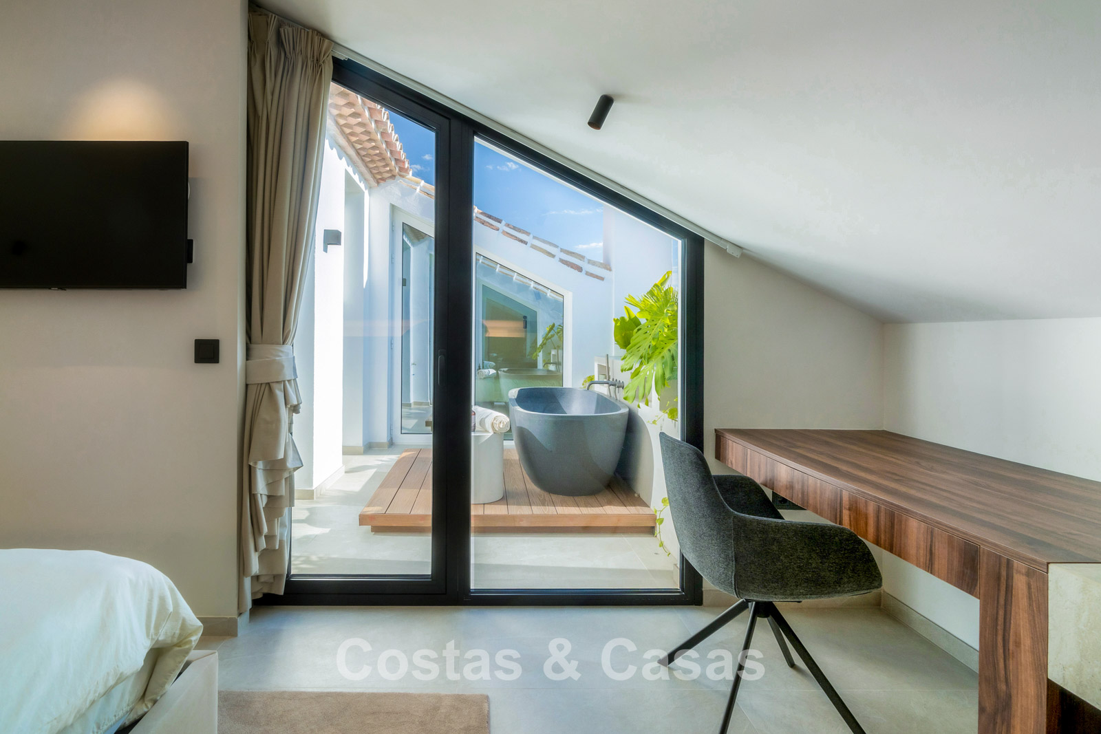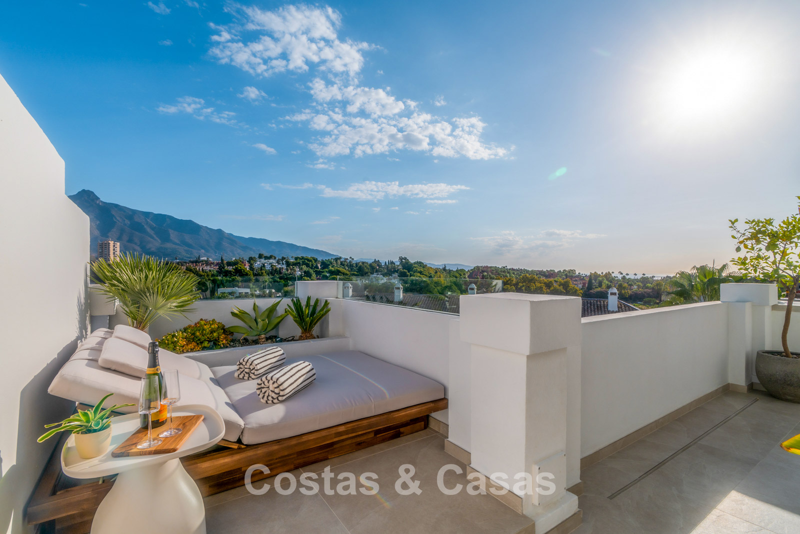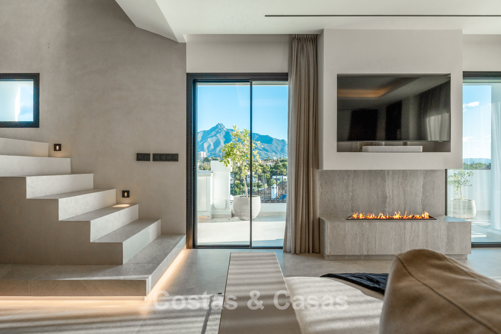 Spacious penthouse with 2 floors. High-quality renovation with contemporary finishes and refined craftsmanship. The sunny main terrace features an outdoor kitchen, complete with a barbecue, outdoor dining area, and lounge facilities, while the upper floor offers an intimate private terrace with a freestanding bathtub. Magnificent panoramic views of the iconic La Concha mountain with the Mediterranean Sea in the distance. Tall windows create an airy and bright interior. Bright living room with an open-plan layout. High-end open-plan designer kitchen with premium Miele appliances and a central island with a breakfast bar. There are three thoughtfully designed bedrooms in total, each with its own bathroom. The master suite boasts high sloping ceilings, a walk-in closet, and an en-suite bathroom. Tiled floors.