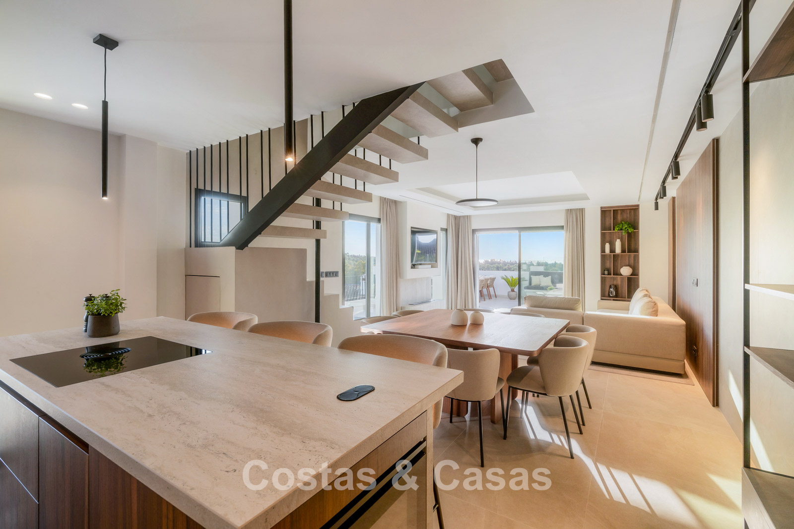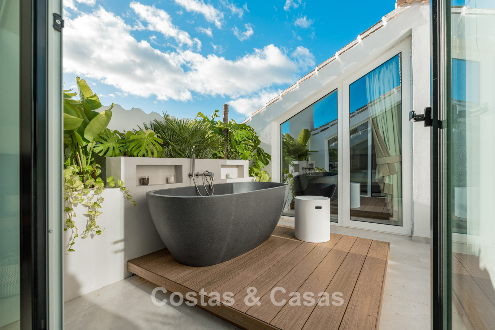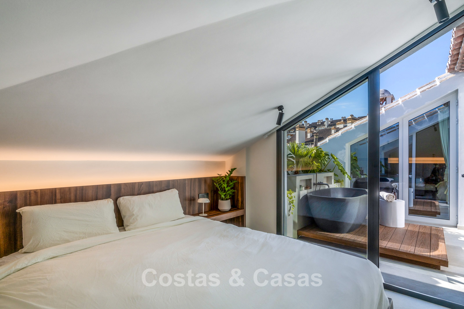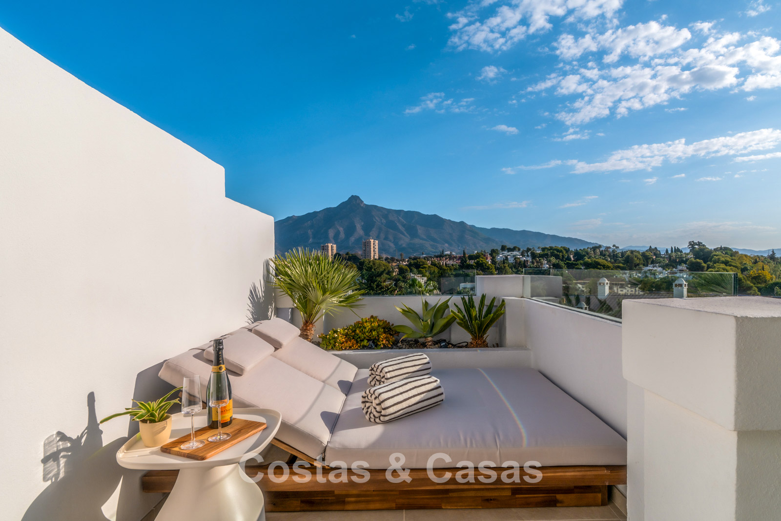 Spacious penthouse with 2 floors. High-quality renovation with contemporary finishes and refined craftsmanship. The sunny main terrace features an outdoor kitchen, complete with a barbecue, outdoor dining area, and lounge facilities, while the upper floor offers an intimate private terrace with a freestanding bathtub. Magnificent panoramic views of the iconic La Concha mountain with the Mediterranean Sea in the distance. Tall windows create an airy and bright interior. Bright living room with an open-plan layout. High-end open-plan designer kitchen with premium Miele appliances and a central island with a breakfast bar. There are three thoughtfully designed bedrooms in total, each with its own bathroom. The master suite boasts high sloping ceilings, a walk-in closet, and an en-suite bathroom. Tiled floors.