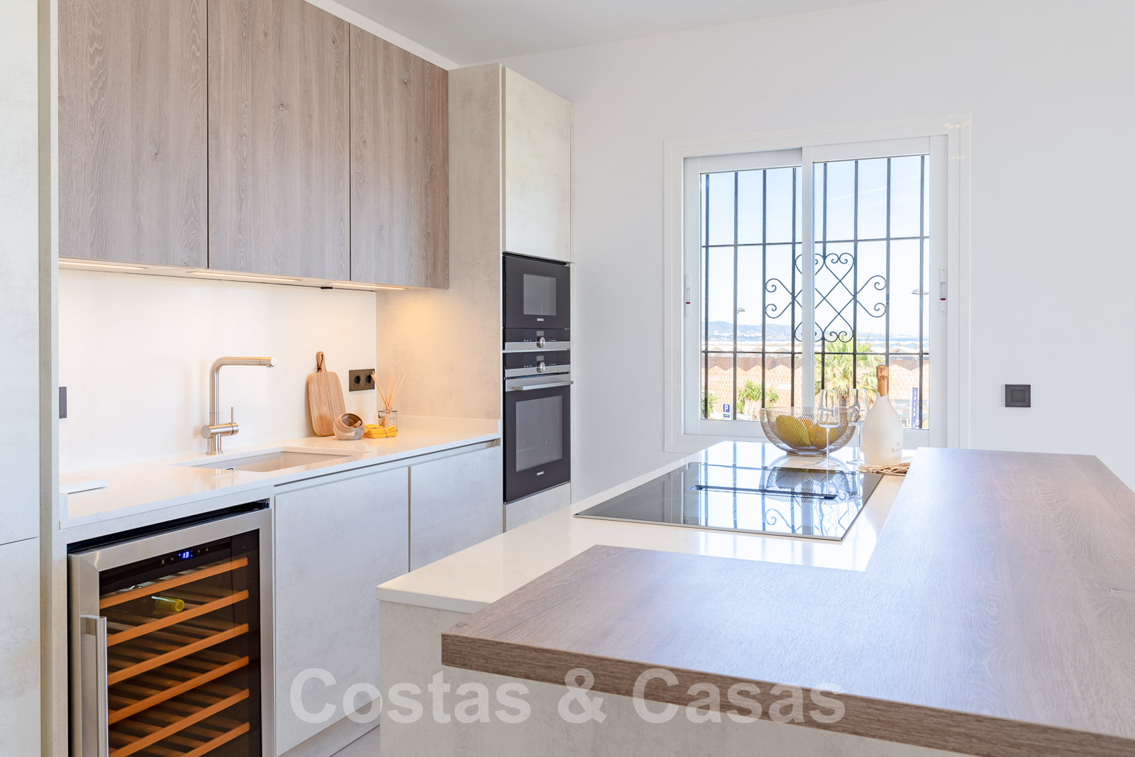 Corner apartment recently completely renovated to a high standard. Modern interior design. Walking in, you immediately enter the open living space with a kitchen, integrated dining area and TV lounge. Open plan living kitchen with wine cooler and cooking island where you can sit. High sliding windows in the living space offer access to the covered terrace. The covered terrace has a seating area, barbecue area and dining table. The terrace continues, and can be embellished with another seating area. A total of 3 bedrooms, 3 bathrooms. Spacious master suite with a walk-through closet and access to a balcony. Porcelain/ceramic tile floors. Views of the surrounding landscape, towards the Mediterranean Sea. Parking space included.