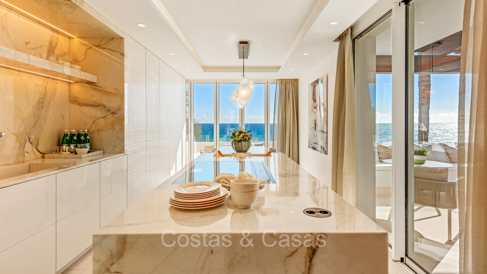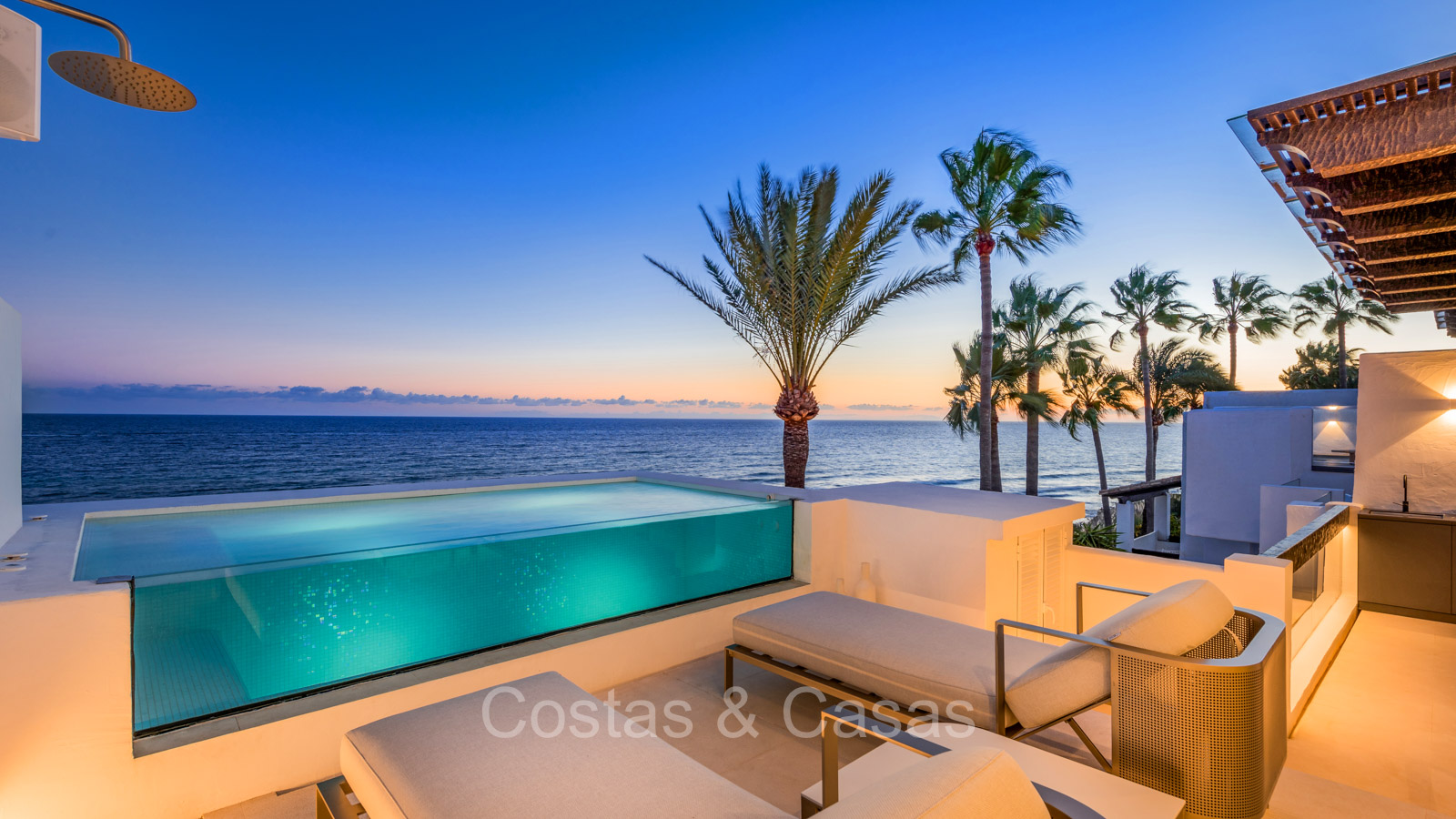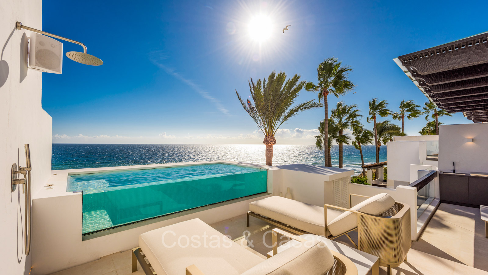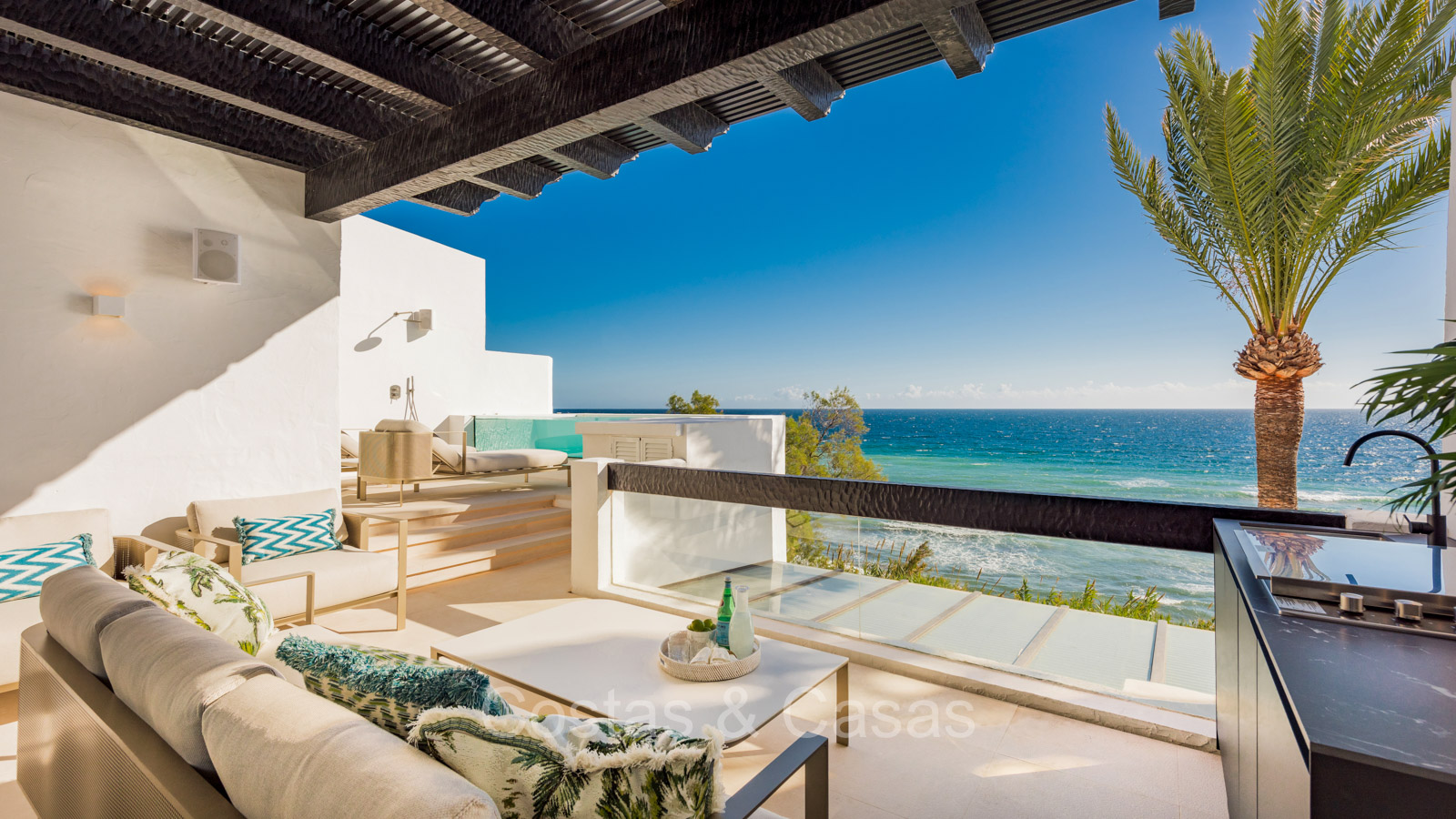 Renovated duplex penthouse with a modern open plan interior layout. Great attention to detail. South facing. Phenomenal, frontal sea views towards the African continent. Inviting outdoor space with a built-in plunge pool, outdoor kitchen and lounge facilities. Floor-to-ceiling sliding windows with recessed frames provide a seamless connection between the interior and exterior. Trendy living room with an ethanol fireplace. Elegant kitchen with a marble cooking island that flows into a lower dining table. 4 bedrooms, 4 bathrooms and separate toilet. The master bedroom, with marble accents in the bathroom and direct access to the terrace, offers a luxurious look. Quality floors.
