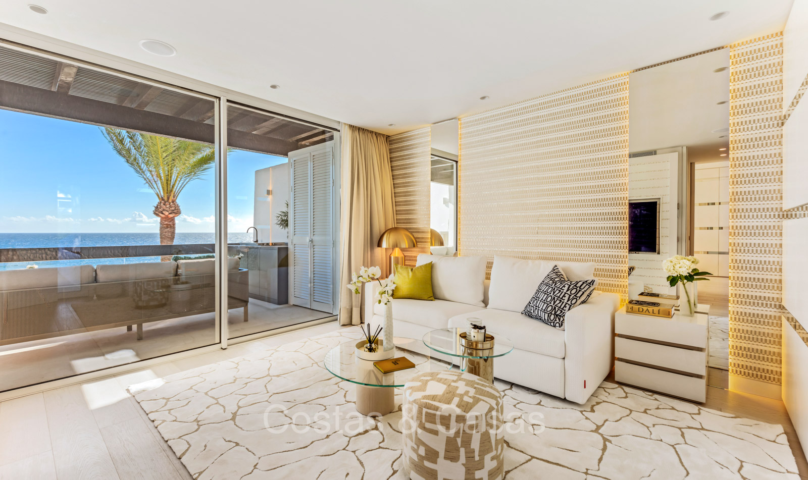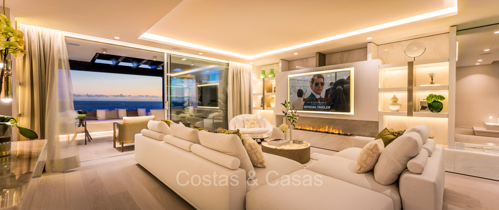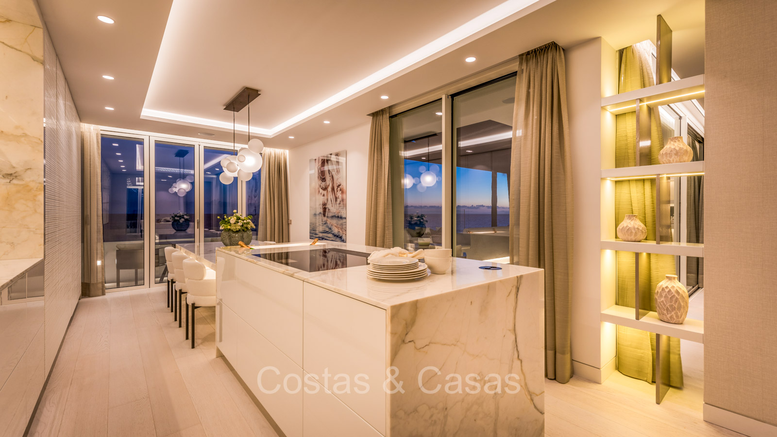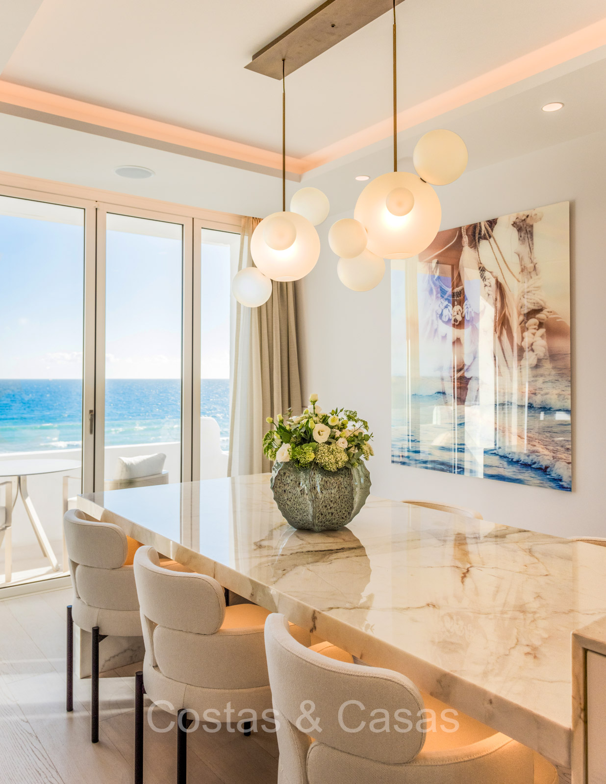 Renovated duplex penthouse with a modern open plan interior layout. Great attention to detail. South facing. Phenomenal, frontal sea views towards the African continent. Inviting outdoor space with a built-in plunge pool, outdoor kitchen and lounge facilities. Floor-to-ceiling sliding windows with recessed frames provide a seamless connection between the interior and exterior. Trendy living room with an ethanol fireplace. Elegant kitchen with a marble cooking island that flows into a lower dining table. 4 bedrooms, 4 bathrooms and separate toilet. The master bedroom, with marble accents in the bathroom and direct access to the terrace, offers a luxurious look. Quality floors.