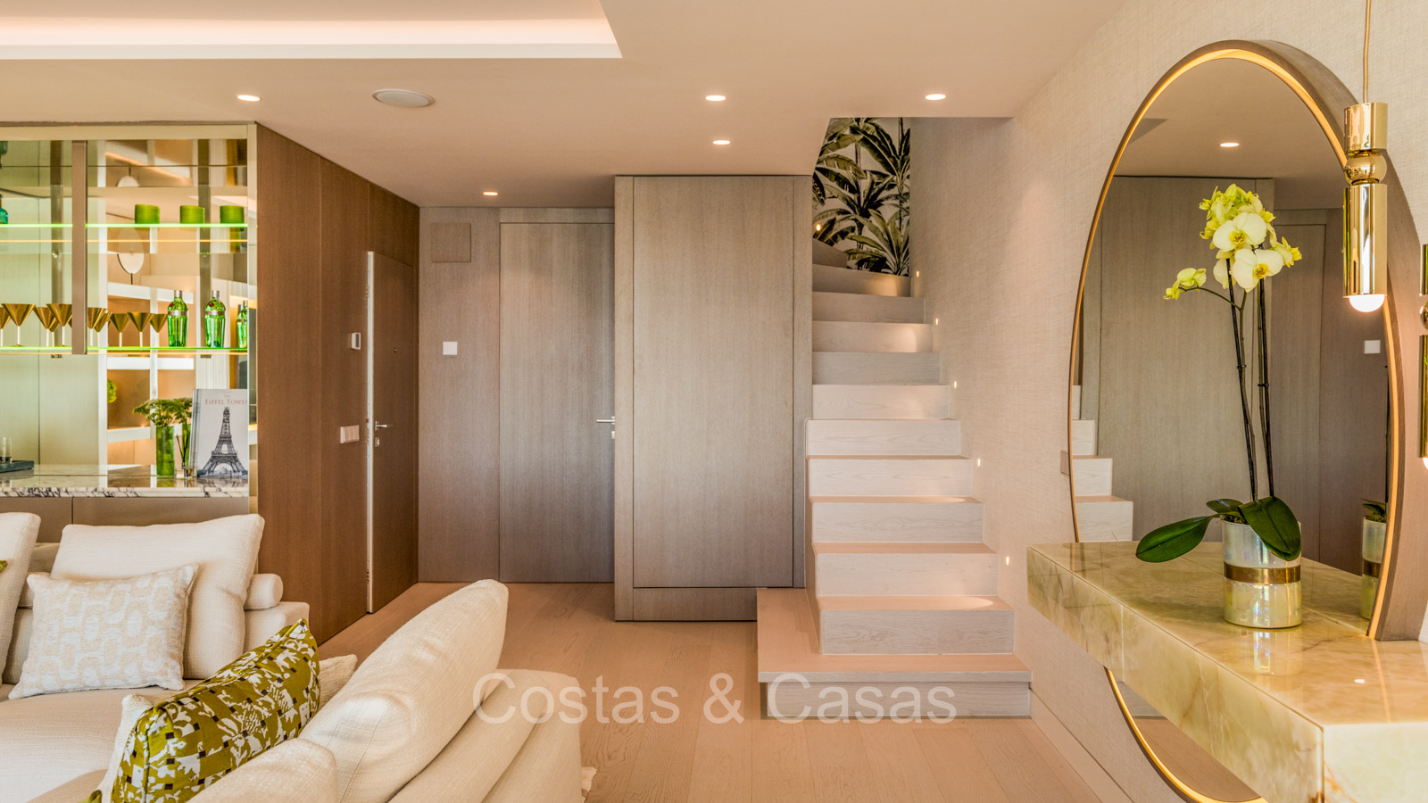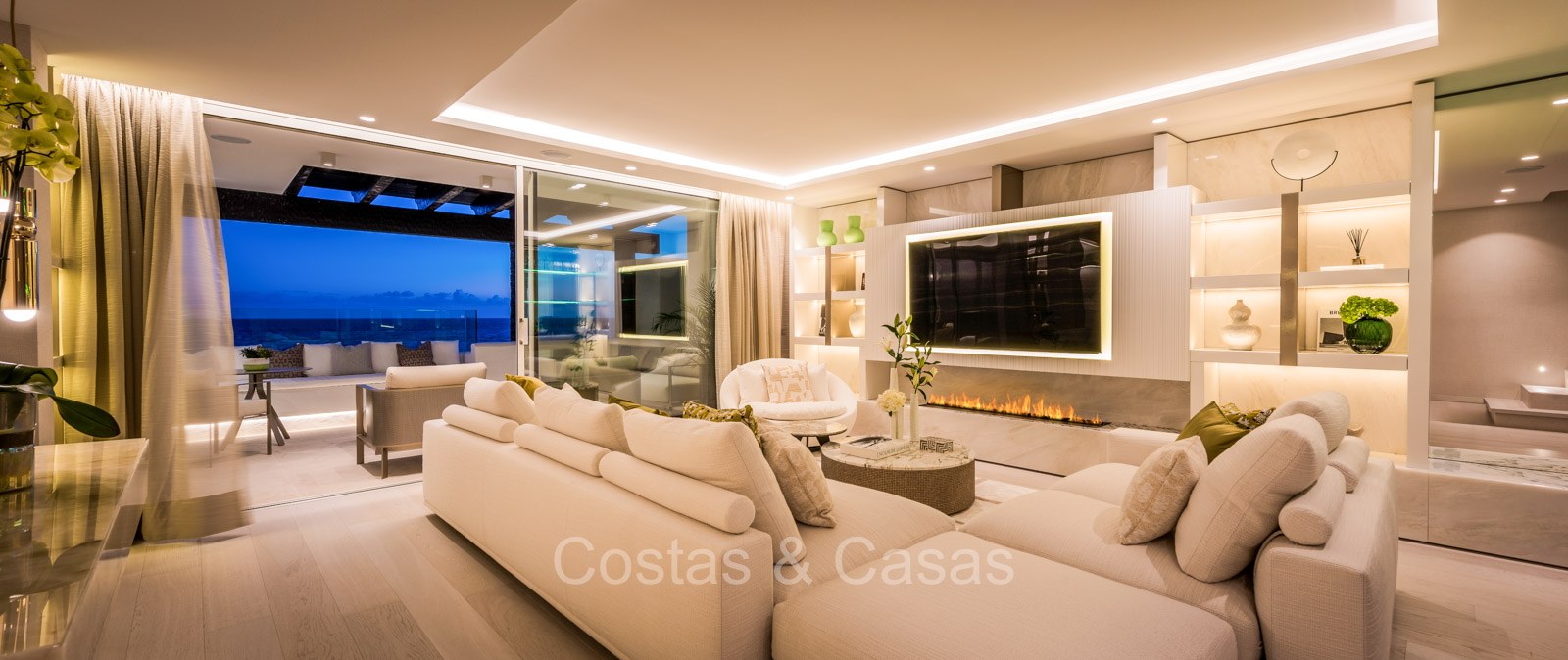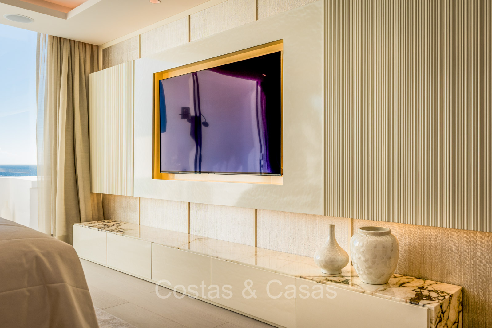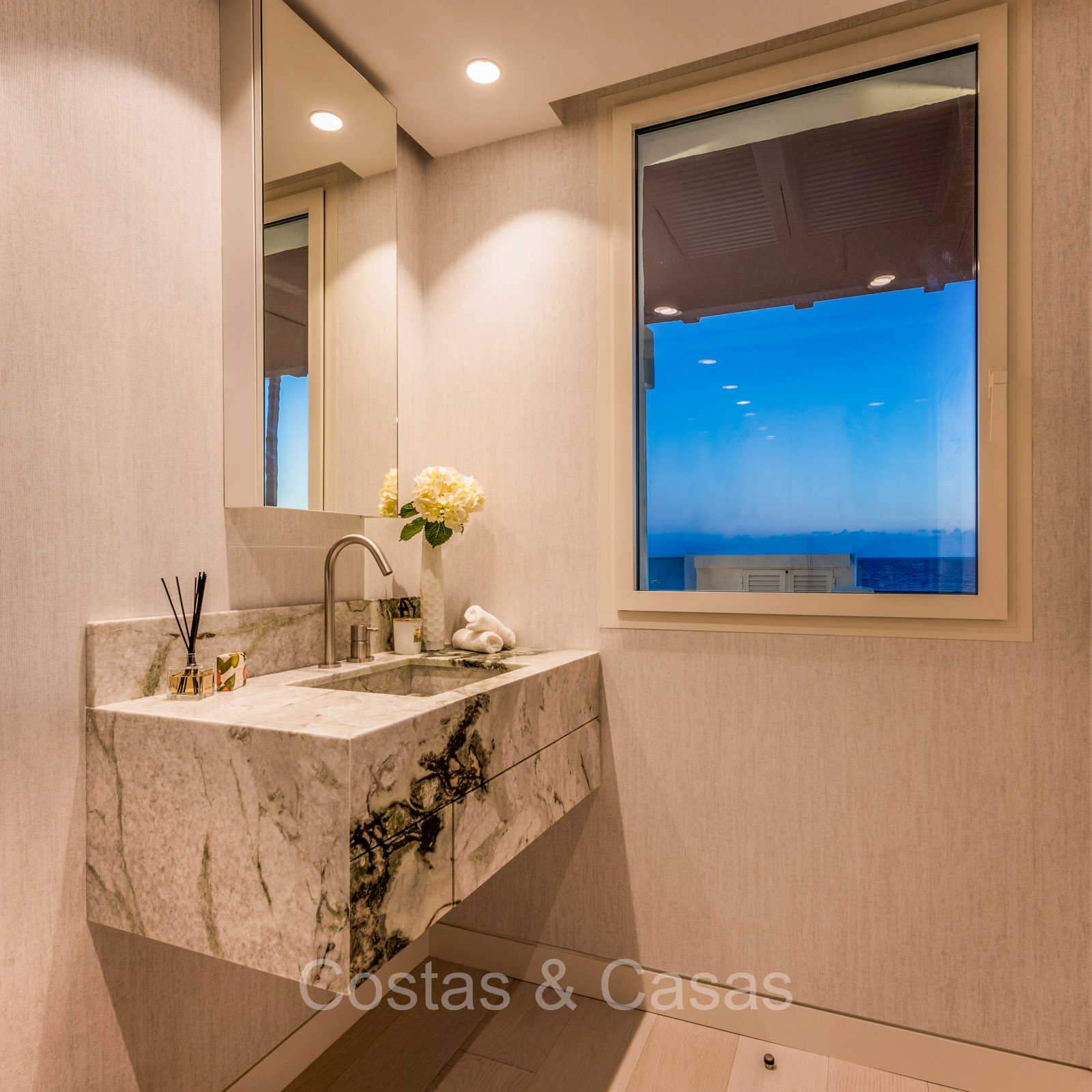 Renovated duplex penthouse with a modern open plan interior layout. Great attention to detail. South facing. Phenomenal, frontal sea views towards the African continent. Inviting outdoor space with a built-in plunge pool, outdoor kitchen and lounge facilities. Floor-to-ceiling sliding windows with recessed frames provide a seamless connection between the interior and exterior. Trendy living room with an ethanol fireplace. Elegant kitchen with a marble cooking island that flows into a lower dining table. 4 bedrooms, 4 bathrooms and separate toilet. The master bedroom, with marble accents in the bathroom and direct access to the terrace, offers a luxurious look. Quality floors.
