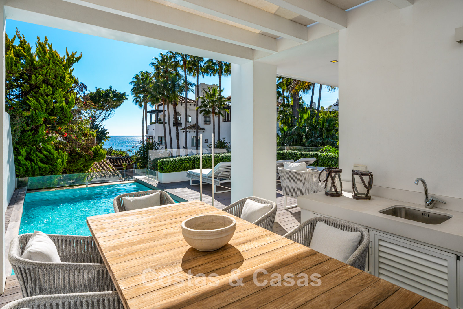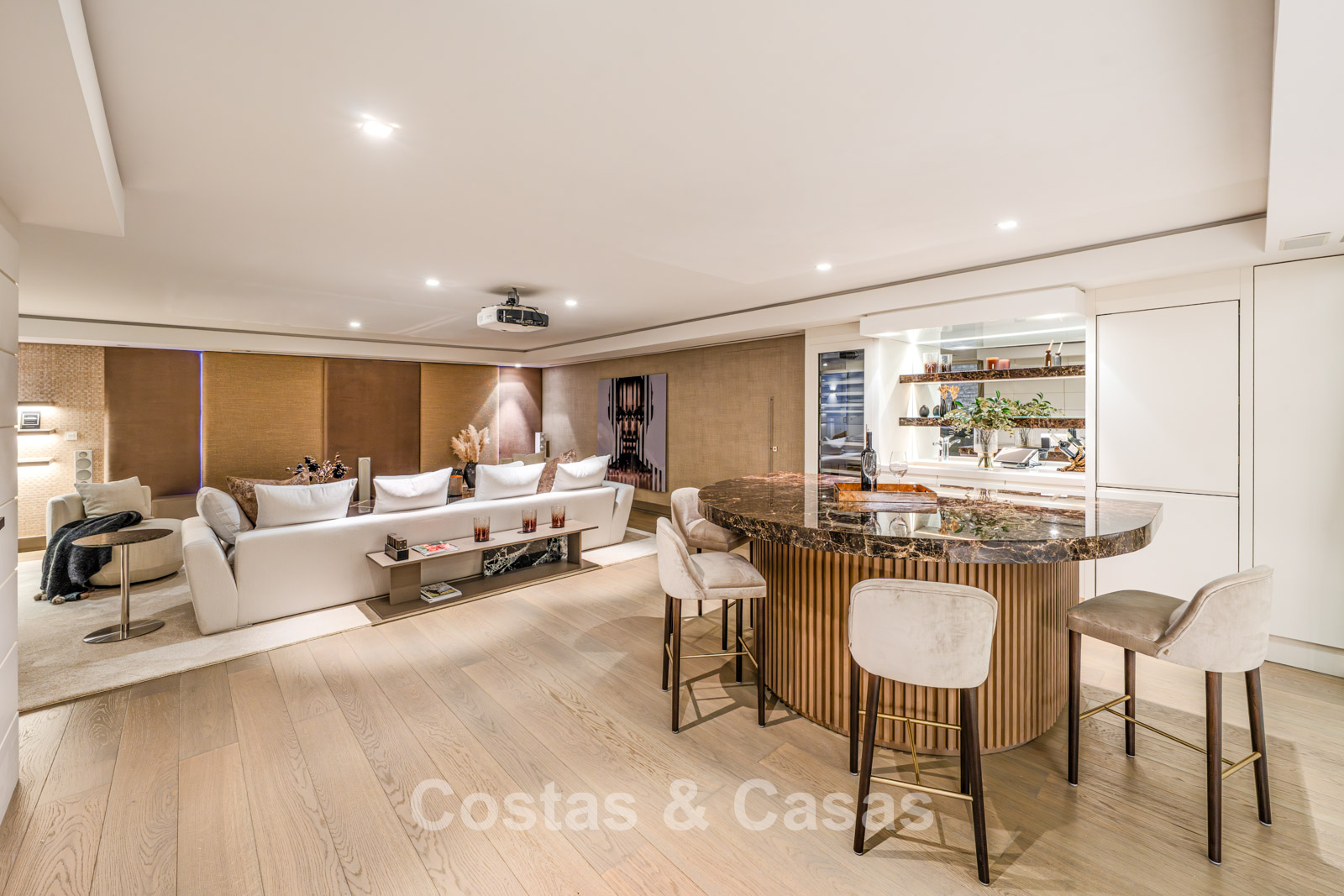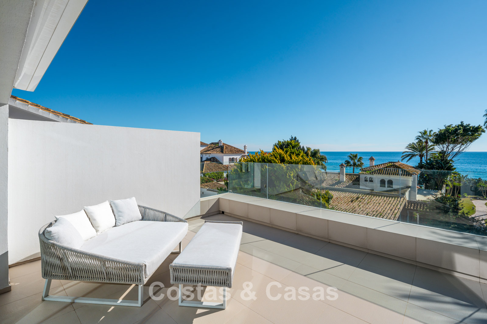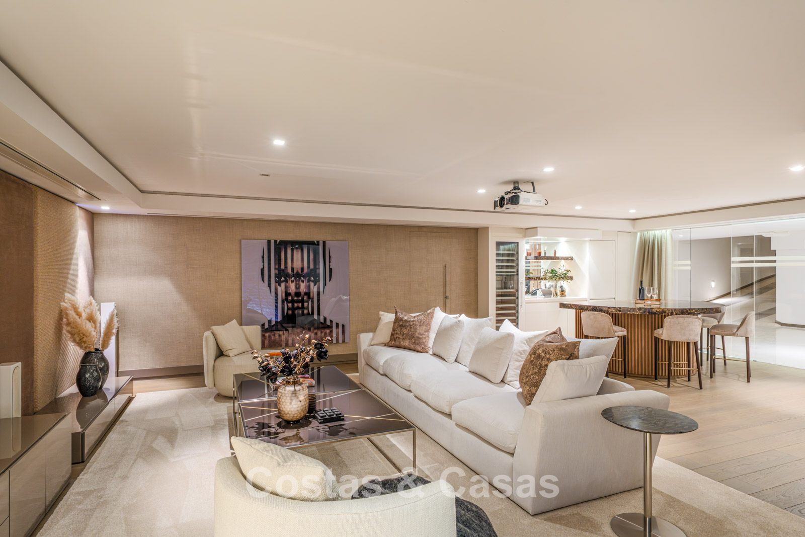 Semi-detached villa built in a modern architectural style. Carefully modernised with attention to design and superior finishes. Elegant interior design with cream-coloured flooring and contemporary furnishings. South-facing. Enjoy beautiful views of the Mediterranean Sea. Floor-to-ceiling window structures flood the interior with natural light. Airy living space with an open-plan layout. Minimalist kitchen, fully equipped with top-of-the-range appliances and a breakfast island. Integrated dining area. 4 bedrooms, 4 bathrooms. Lower ground floor with home cinema (projector) and bar. Fully equipped gym with sauna. Storage room and technical room. Private garage with turning platform, space for 2 cars.
