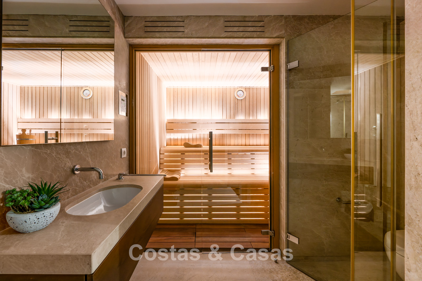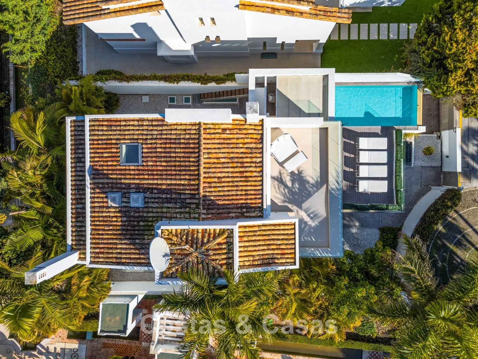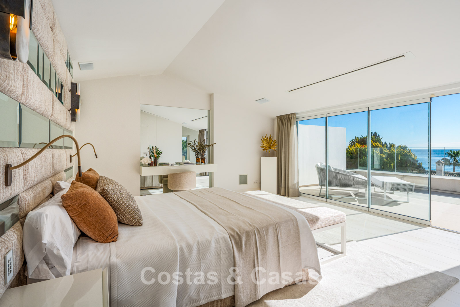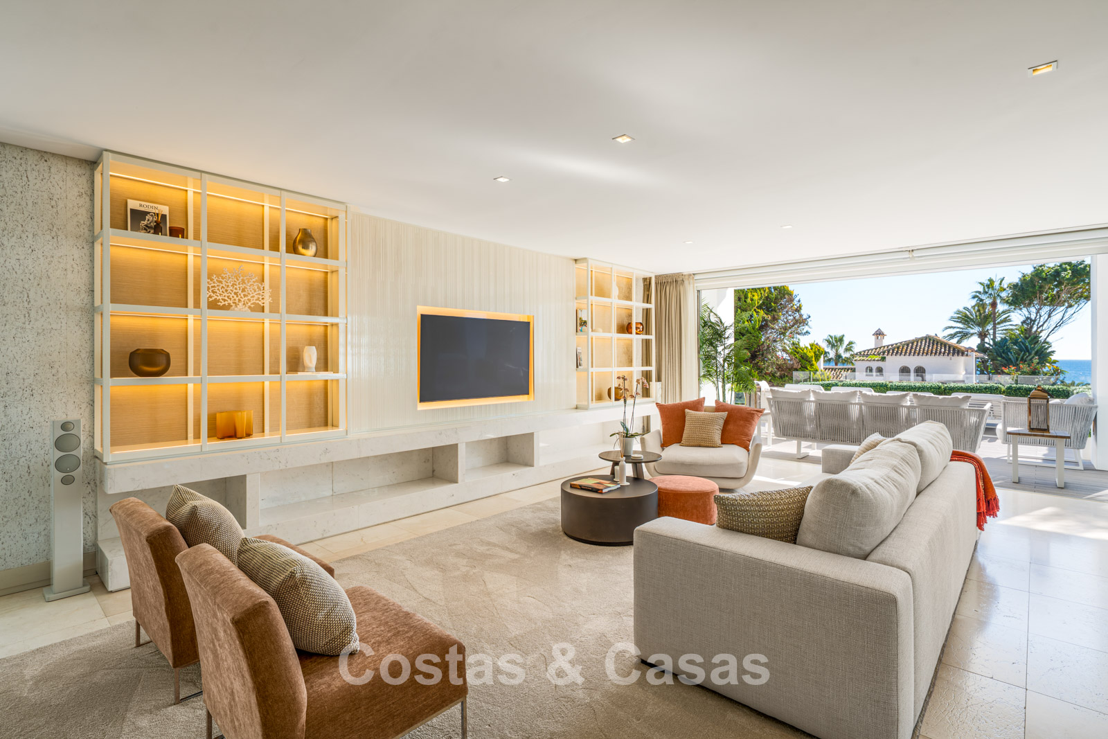 Semi-detached villa built in a modern architectural style. Carefully modernised with attention to design and superior finishes. Elegant interior design with cream-coloured flooring and contemporary furnishings. South-facing. Enjoy beautiful views of the Mediterranean Sea. Floor-to-ceiling window structures flood the interior with natural light. Airy living space with an open-plan layout. Minimalist kitchen, fully equipped with top-of-the-range appliances and a breakfast island. Integrated dining area. 4 bedrooms, 4 bathrooms. Lower ground floor with home cinema (projector) and bar. Fully equipped gym with sauna. Storage room and technical room. Private garage with turning platform, space for 2 cars.
