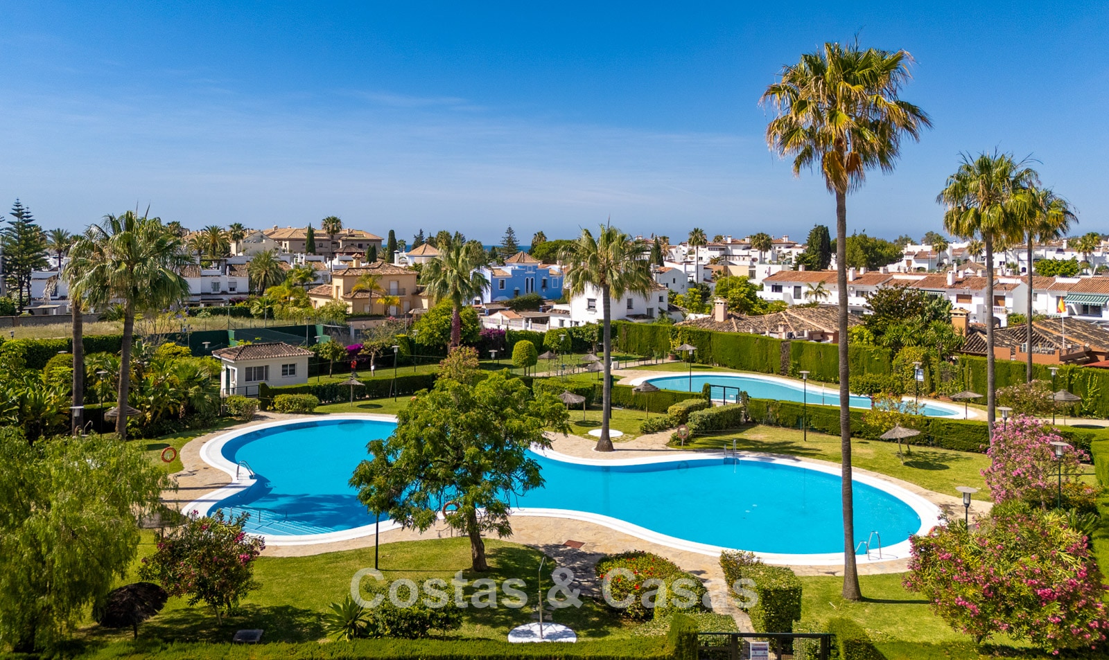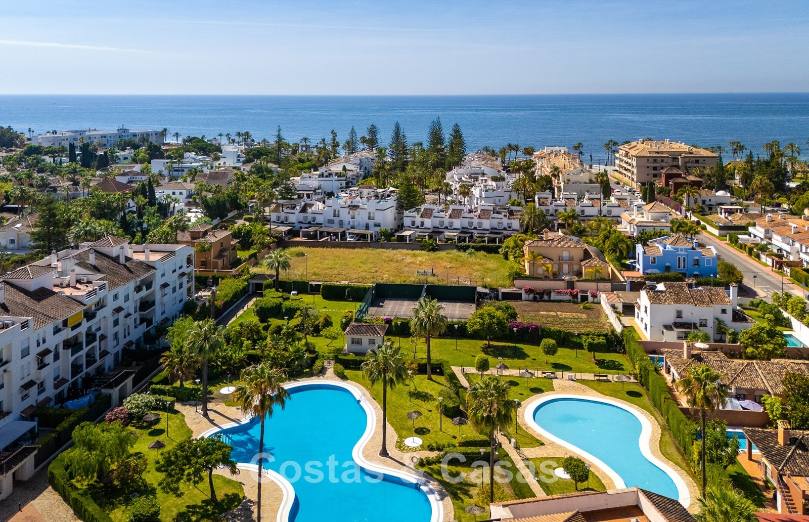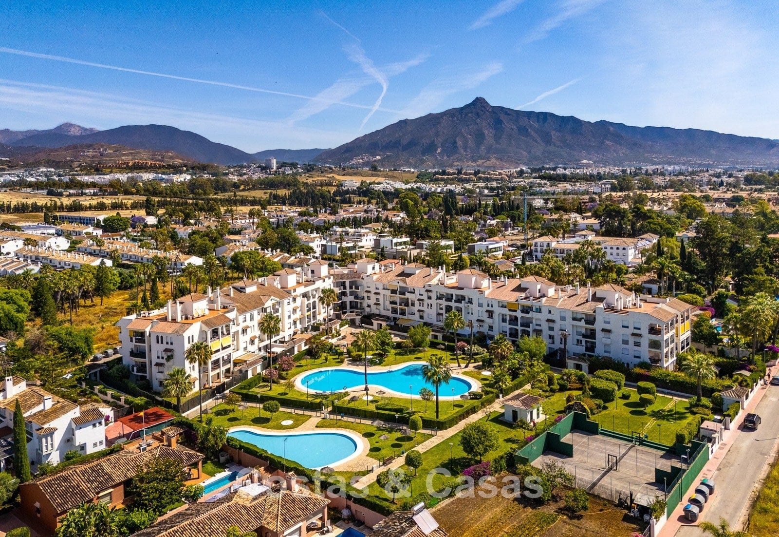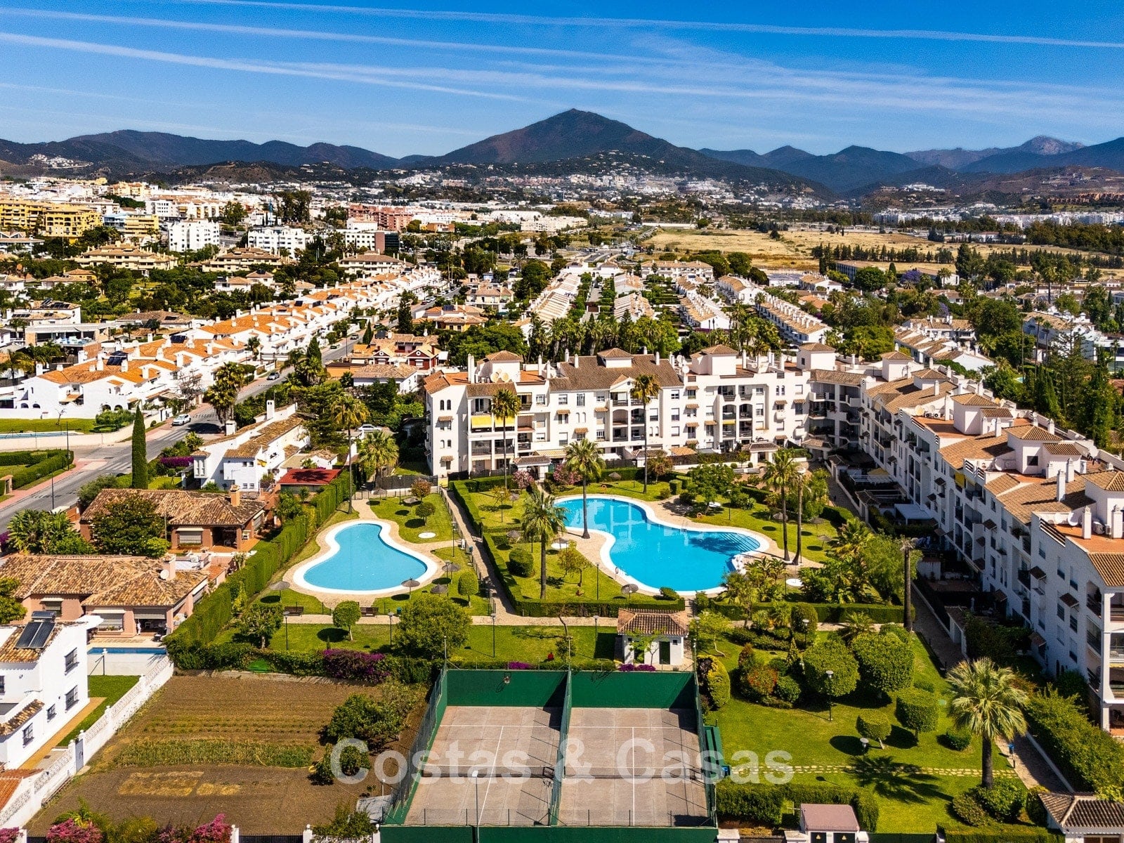 Situated in a sought after gated community in San Pedro, one of the most sought-after areas in Marbella. Just a 350m walk to the beach and the lively promenade of San Pedro. The centre, all amenities, an international school, sports facilities, medical centres and a wide range of restaurants are all within a short walk. Several top-class golf courses can be reached within a few minutes’ drive, including Atalaya, El Paraiso, Guadalmina and Nueva Andalucia’s golf valley. Puerto Banus and Marbella centre are approximately 5 and 10 minutes away by car. The complex offers 24-hour security, 2 swimming pools and 2 paddle courts.
