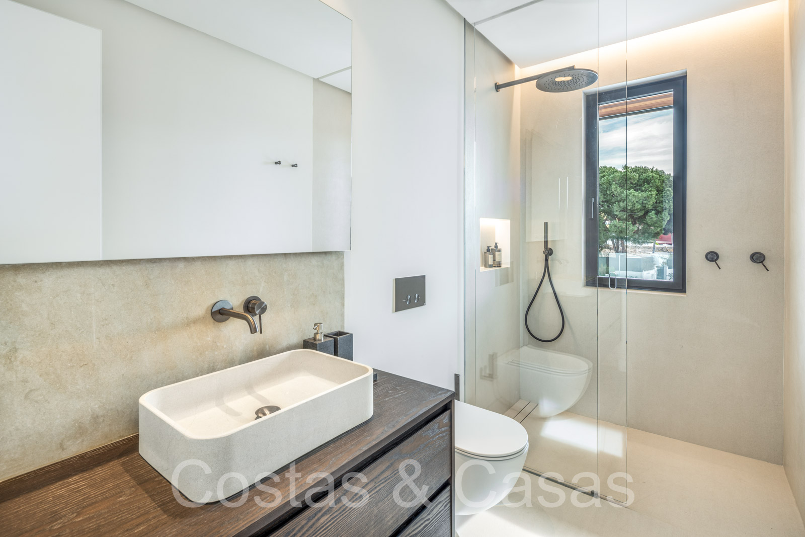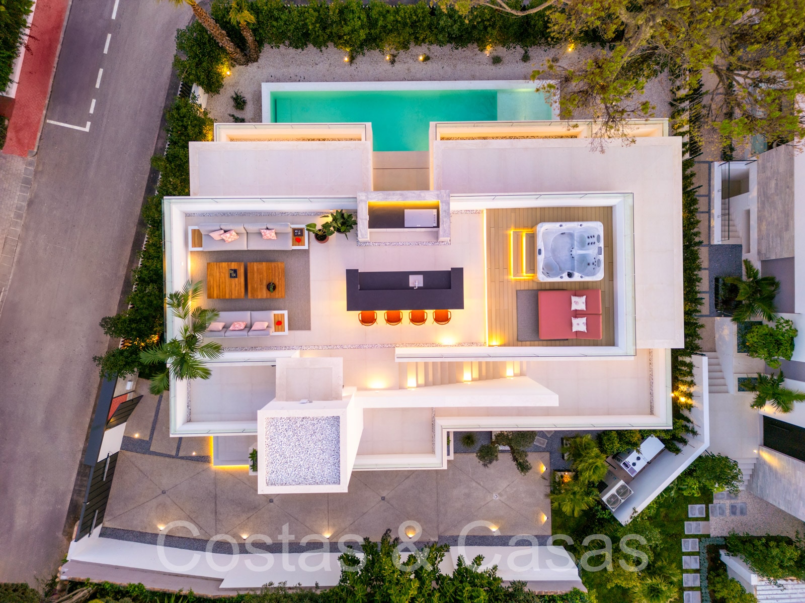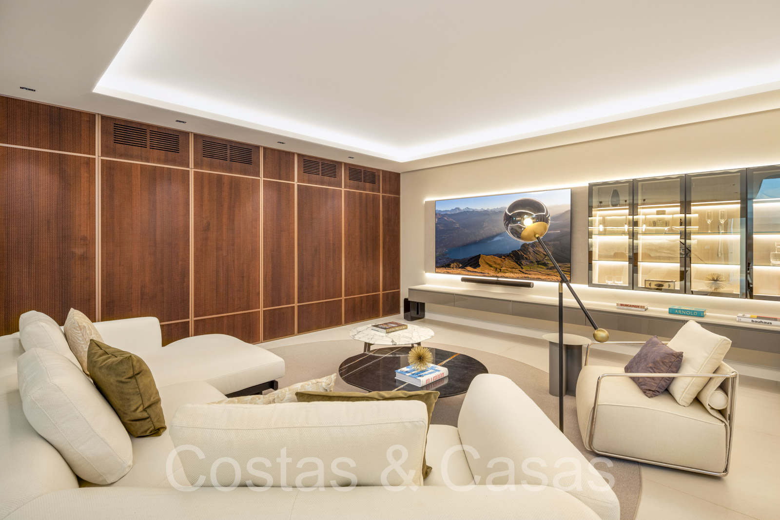 Newly built villa Developed with superior materials with high-end finishes. Modern design with stylish furniture pieces. Covered entrance. Entrance with a floating staircase and elevator. Open plan interior. Open TV lounge with modern fireplace and a high window opening onto the terrace. Integrated seating area. Formal, open dining area. Open designer kitchen with granite cooking island that you can sit at. Room-high sliding windows with recessed profiles that provide a seamless connection between the indoor and outdoor spaces. 6 Bedrooms and 5 bathrooms. Large en-suite master bedroom with access to the semi covered terrace. 2 Guest bedrooms on the lower floor. Furthermore, on the lower floor a relaxation area with TV lounge, bar and home cinema. Solarium with jacuzzi, outdoor kitchen, breakfast bar and lounge with modern fireplace. Technical rooms, storage room and laundry room. Parking space for several cars.