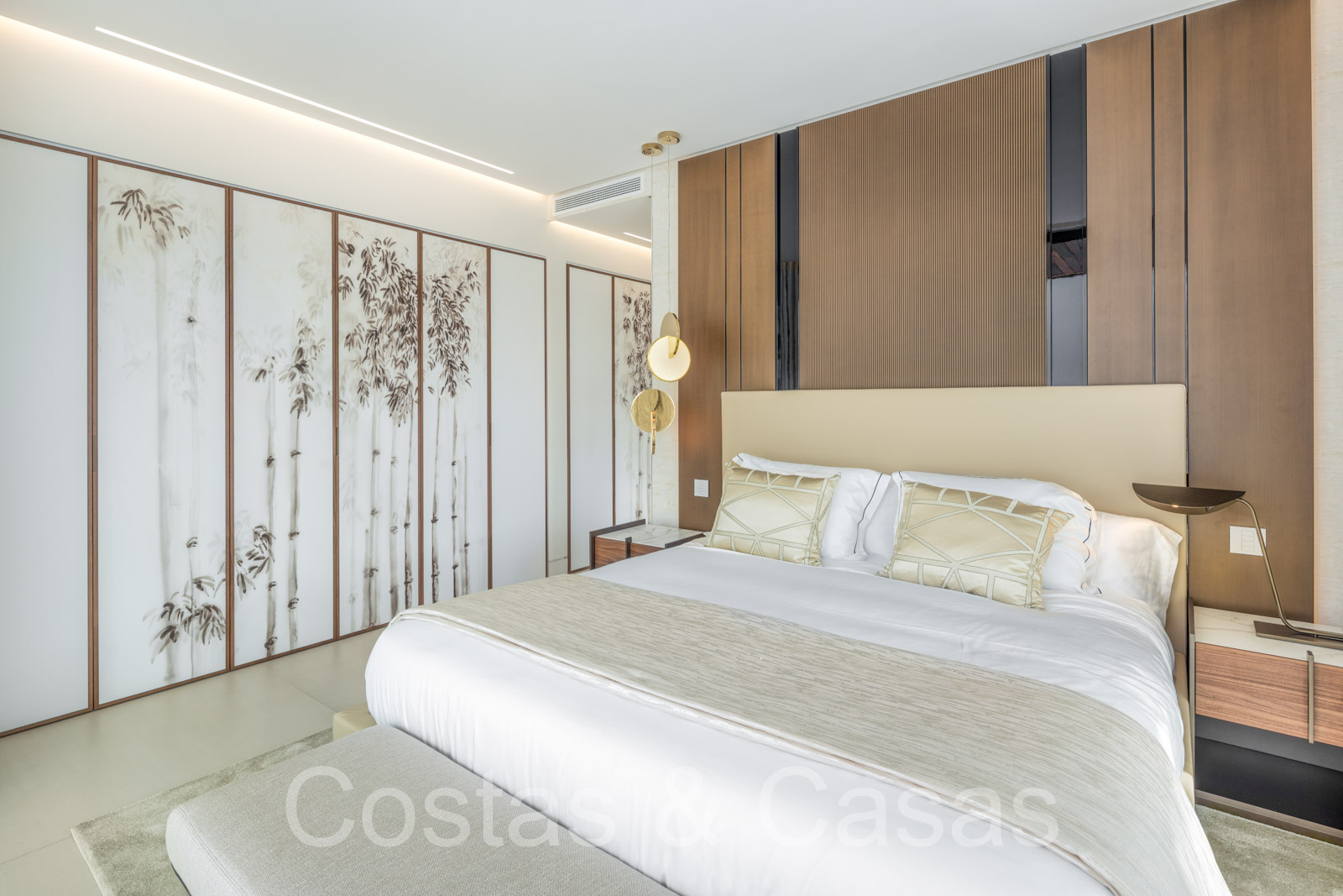 Upper Floor Landing with staircase and elevator. Magnificent master bedroom with built-in closets and access to the partially covered corner terrace with sitting area. 2 Spacious bedrooms with fitted wardrobes and access to the semi-covered terrace with seating area. Bathroom. Terraces with glass railings.