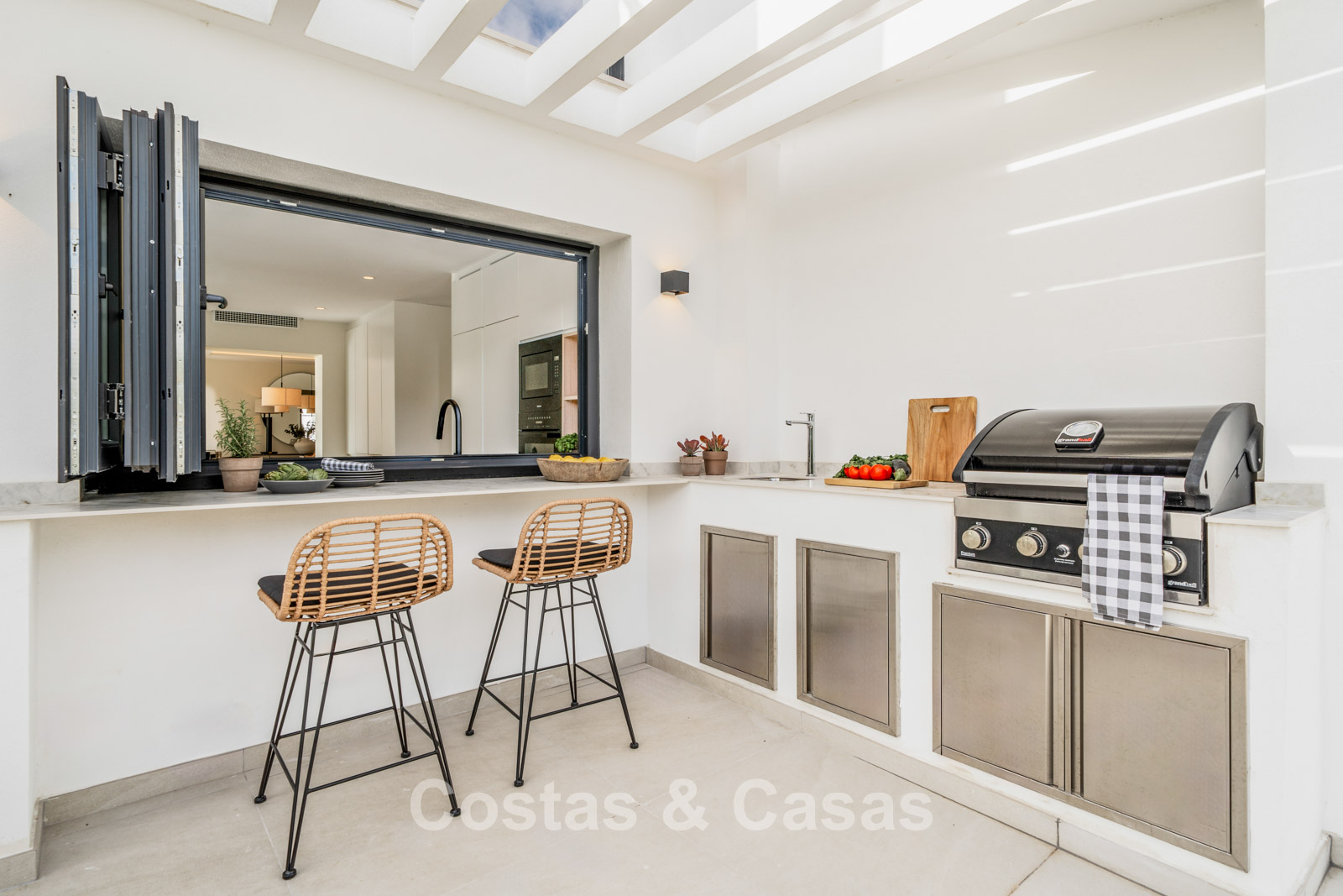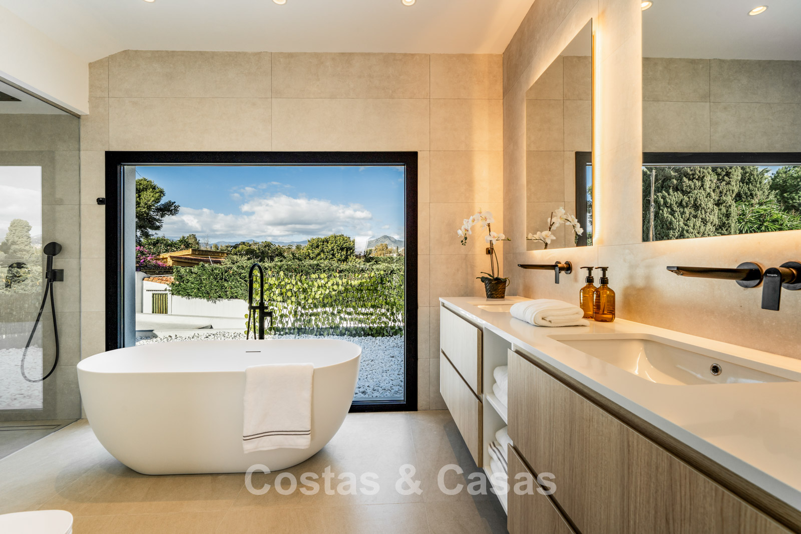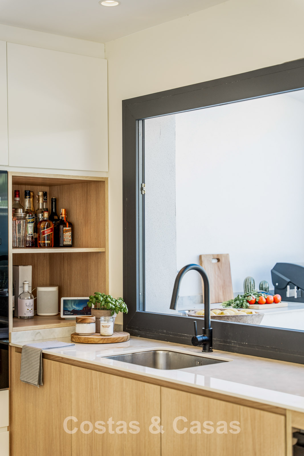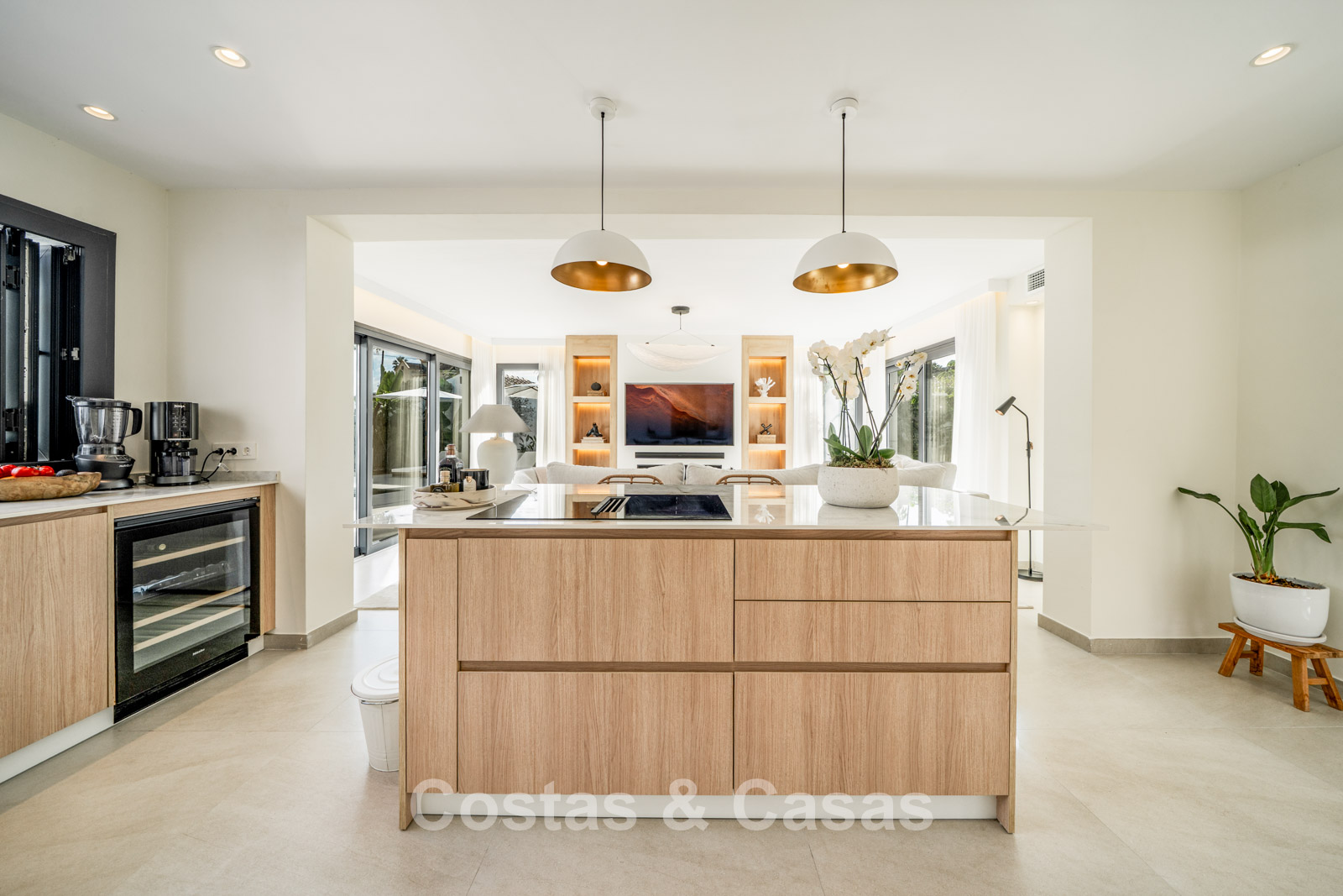 Detached villa with a contemporary Mediterranean look. Fully renovated and modernised to the highest standards. Interior with open-plan layout. Bright living room with TV lounge and fireplace. High sliding windows create a seamless transition between indoor and outdoor living. Custom-made kitchen with central island, integrated breakfast bar and high-quality Miele appliances. The kitchen connects directly to an extended outdoor kitchen, complete with built-in barbecue and bar. Adjacent dining area. 5 fitted bedrooms, each with en-suite bathroom, plus a separate guest toilet. The upper floor is entirely dedicated to the master bedroom with en-suite bathroom and direct access to a sun-drenched private terrace. Large-format tile flooring throughout the entire house. Laundry room with Miele appliances.