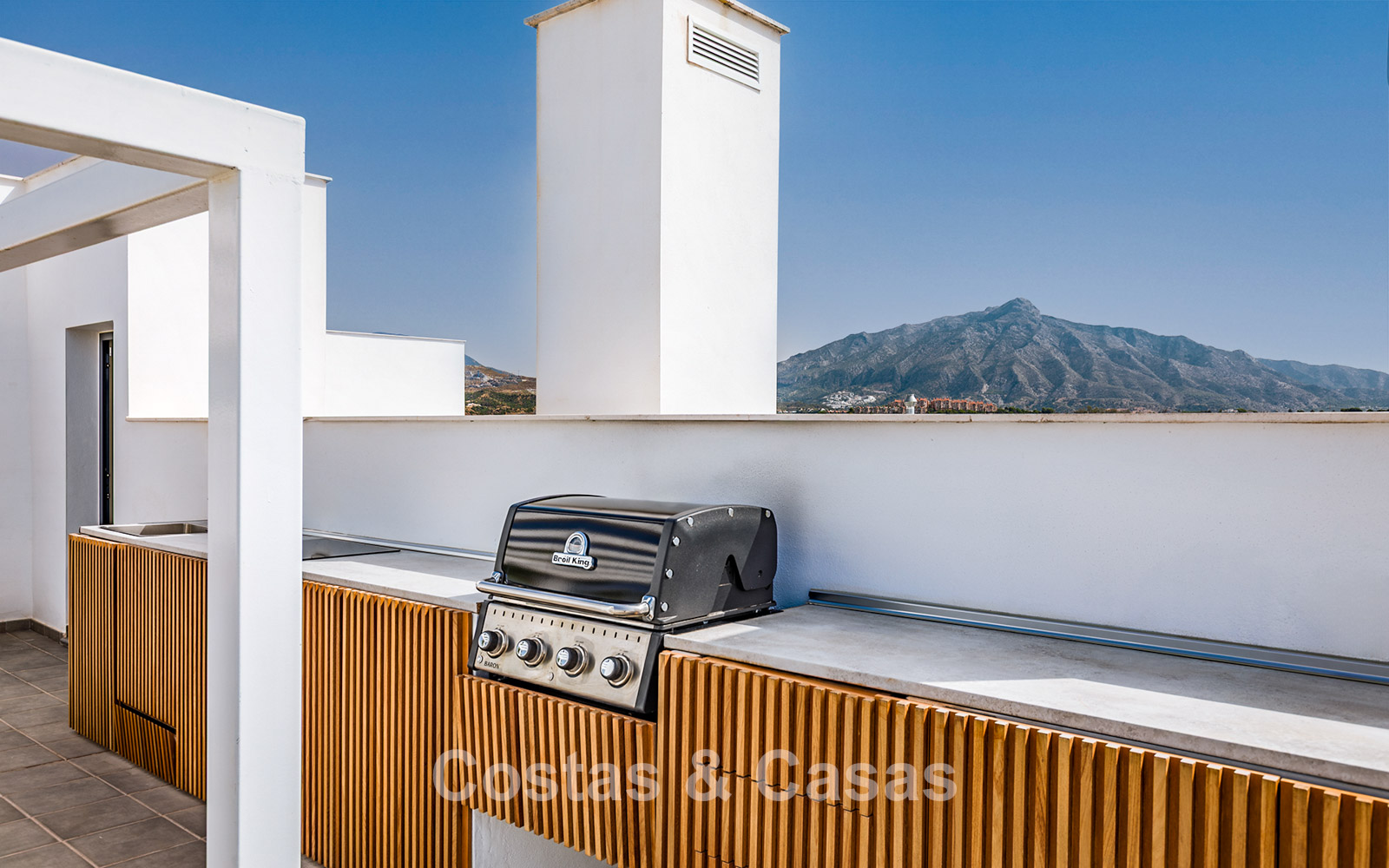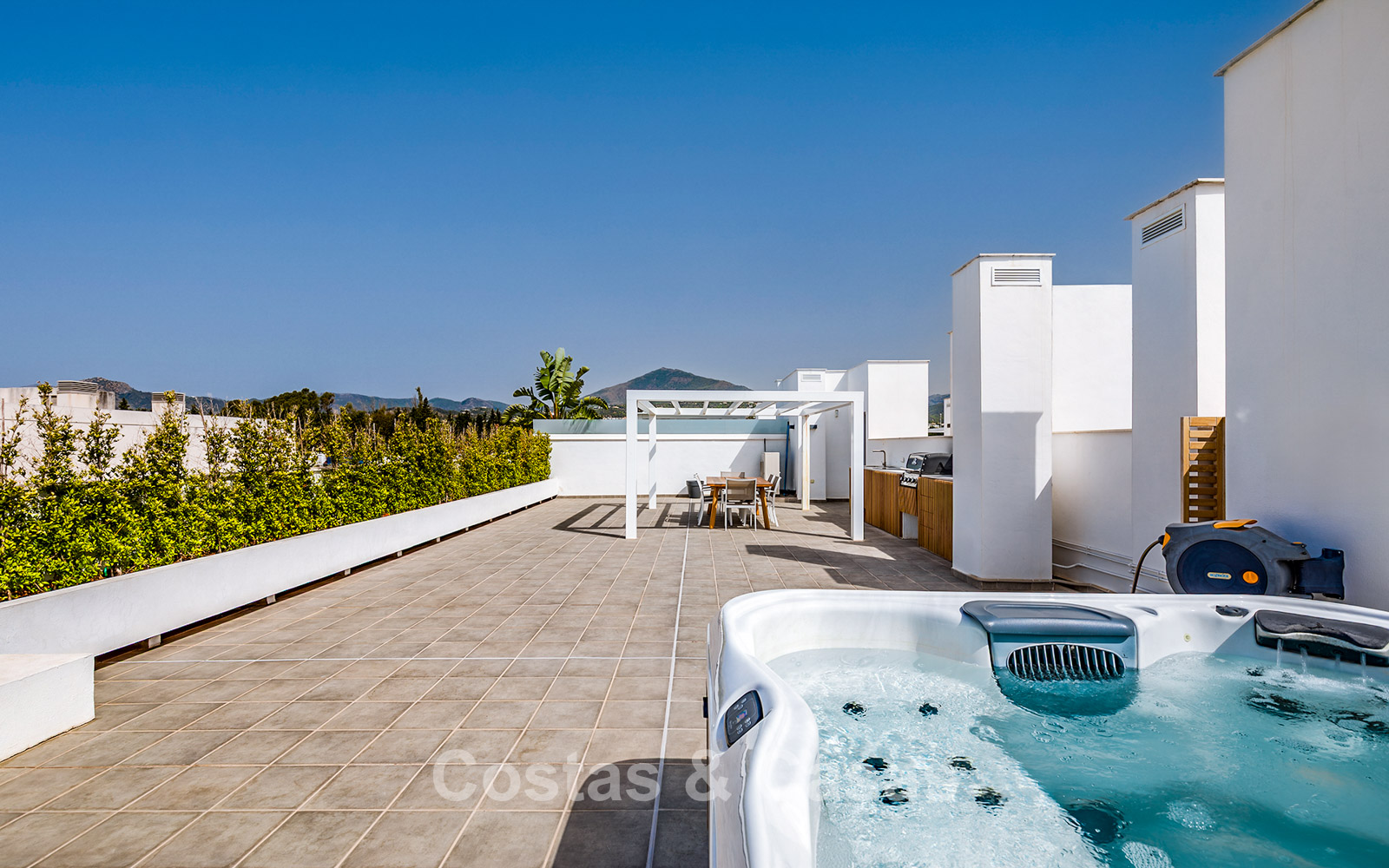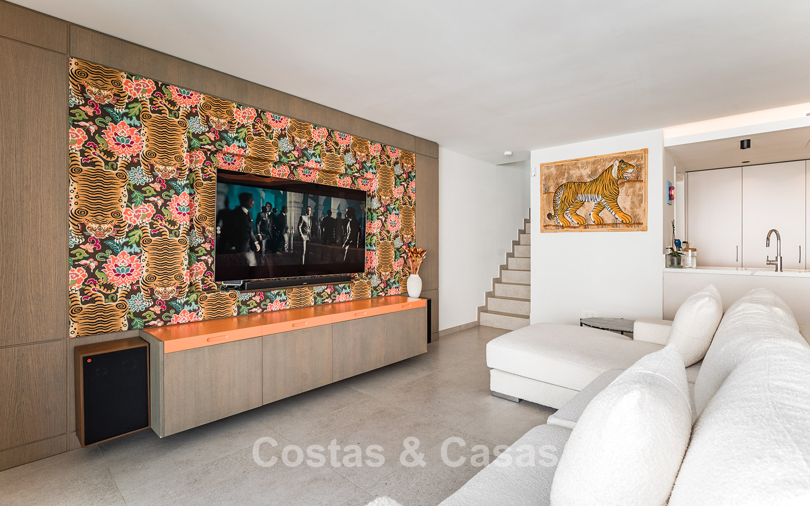 Modern corner penthouse in a recently built, contemporary apartment complex. Using high-quality materials. The living area is on one level and provides access to a stunning roof terrace, complete with an outdoor kitchen, barbecue, and jacuzzi. You have the option of having a private swimming poolbuilt on the roof terrace. Thanks to its favorable southwest orientation, you can enjoy the sun all day long. Views of the surrounding area and the picturesque La Concha from the roof terrace. Floor-to-ceiling sliding glass doors create a seamless transition to the outdoor space. Bright and airy interior with an open-plan layout. Cozy TV lounge with an integrated dining area. Fitted, open-plan kitchen with Whirlpool appliances and a cooking island. 4 bedrooms, 3 bathrooms, and a separate toilet. High-quality, large-format porcelain tiled floors. Storage room and 2 indoor parking spaces included.