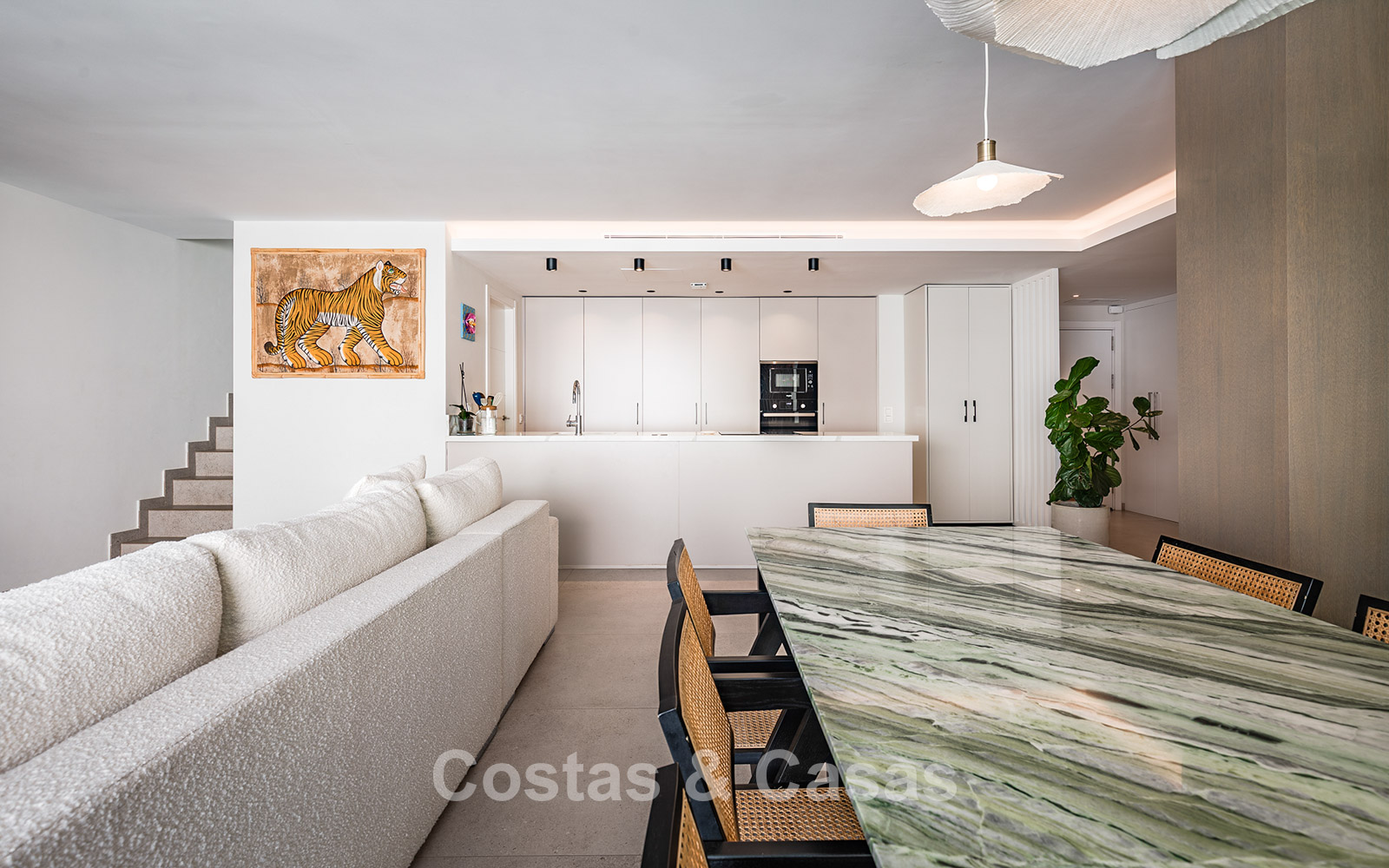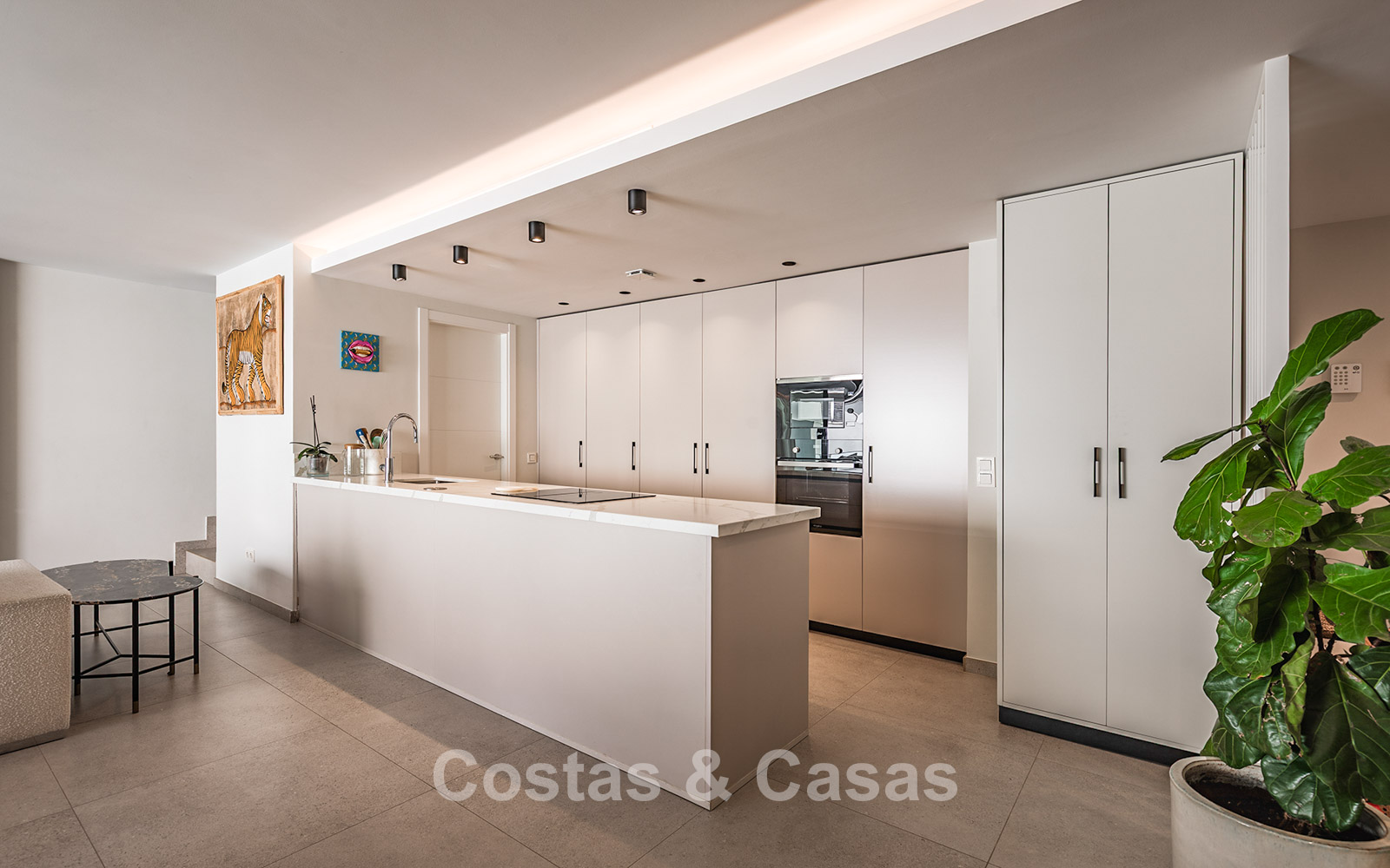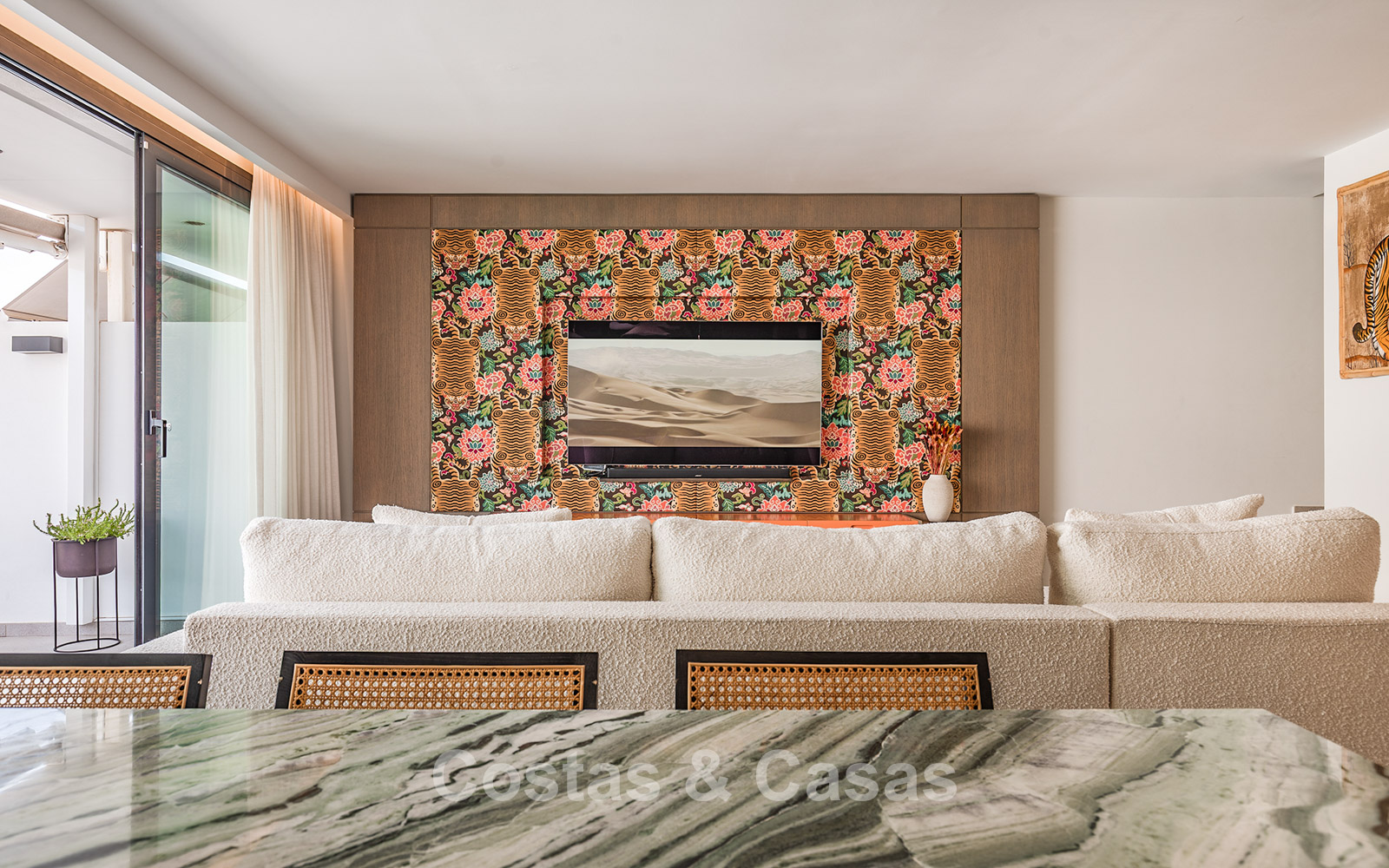 Modern corner penthouse in a recently built, contemporary apartment complex. Using high-quality materials. The living area is on one level and provides access to a stunning roof terrace, complete with an outdoor kitchen, barbecue, and jacuzzi. You have the option of having a private swimming poolbuilt on the roof terrace. Thanks to its favorable southwest orientation, you can enjoy the sun all day long. Views of the surrounding area and the picturesque La Concha from the roof terrace. Floor-to-ceiling sliding glass doors create a seamless transition to the outdoor space. Bright and airy interior with an open-plan layout. Cozy TV lounge with an integrated dining area. Fitted, open-plan kitchen with Whirlpool appliances and a cooking island. 4 bedrooms, 3 bathrooms, and a separate toilet. High-quality, large-format porcelain tiled floors. Storage room and 2 indoor parking spaces included.