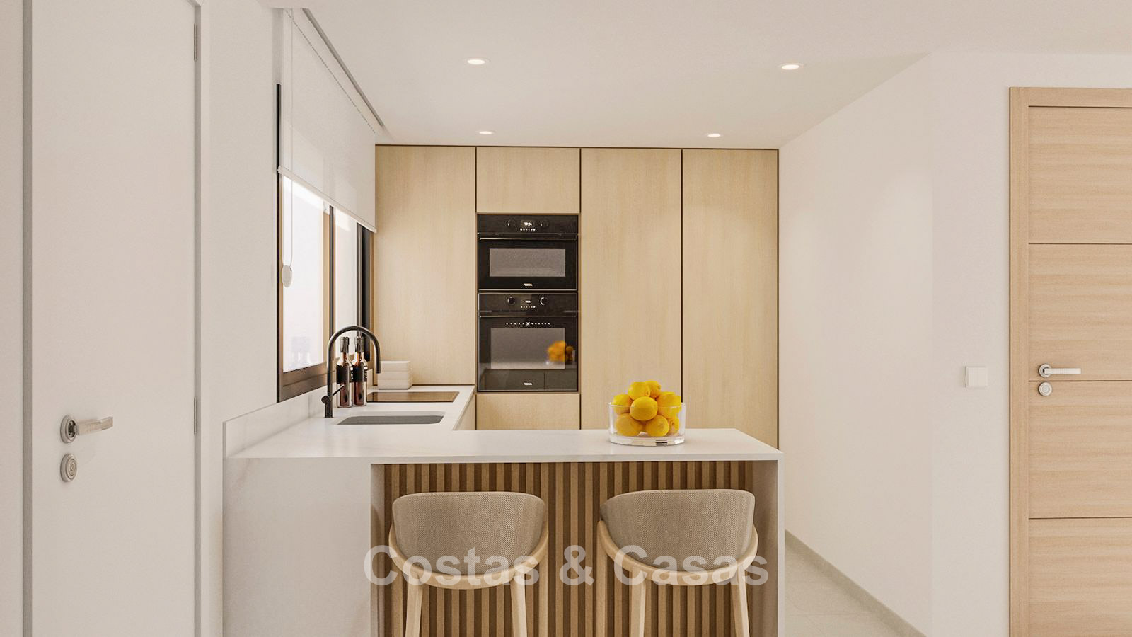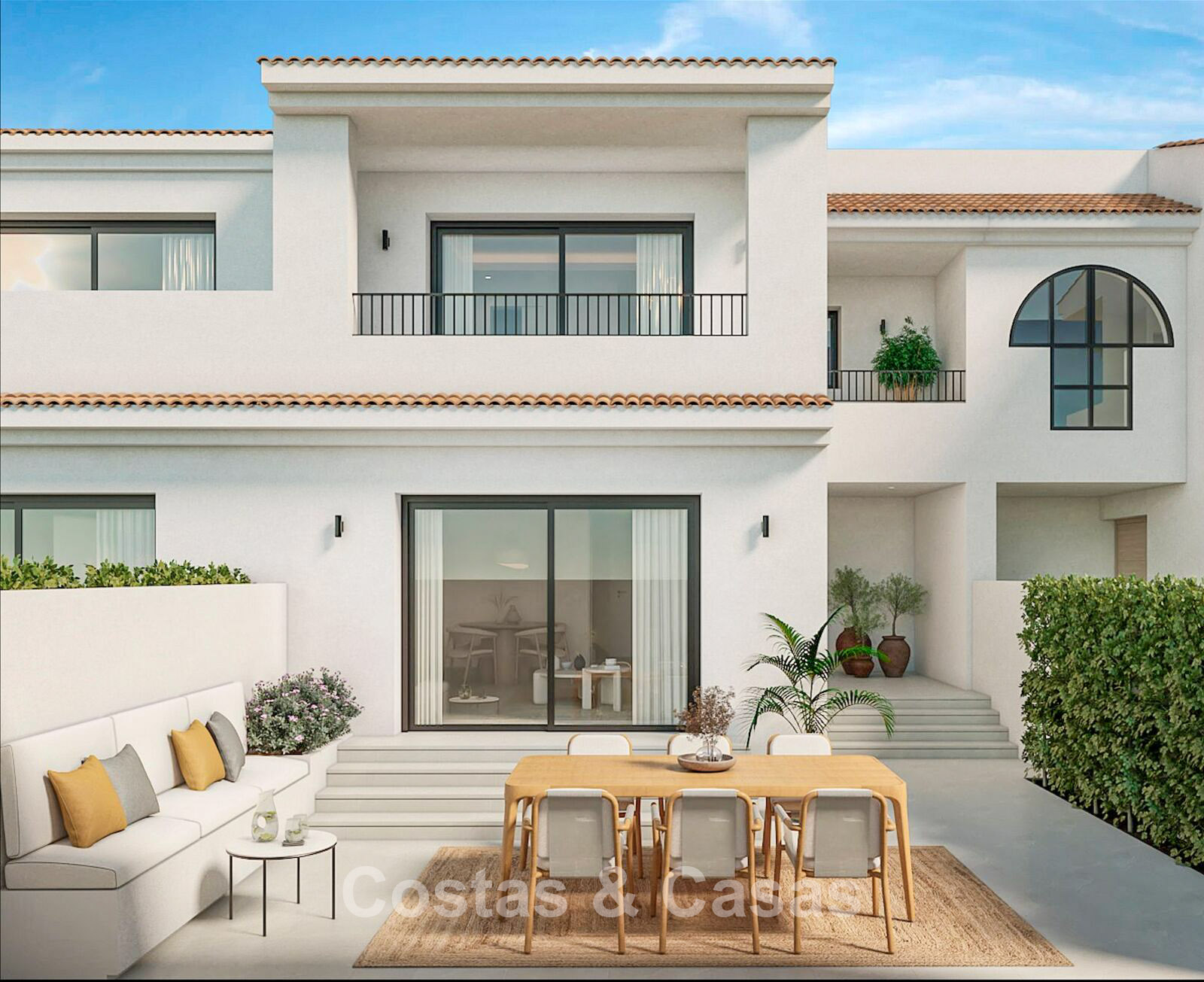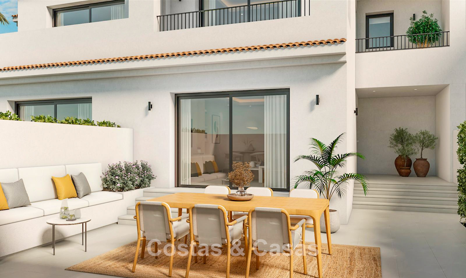 A modern townhouse with elegant Mediterranean influences in the design. The house is being completely renovated with modern finishes and to the highest building standards. Facing southeast, enjoying the morning sun until the early afternoon. Spacious terrace, equipped with a chill-out and an 'al fresco dining' area. High sliding windows provide a seamless flow between the indoor and outdoor spaces and also generate plenty of natural daylight. Open plan living space with a cozy TV lounge and an integrated dining area. Fully equipped Danish kitchen with top appliances from Bosch. 4 bedrooms, 3 bathrooms and separate toilet. Consisting of 2 large bedrooms and 2 single bedrooms. The large master suite features an en-suite bathroom, dressing room and access to 2 terraces. The basement can easily be converted into a separate apartment with its own entrance, perfect for guests. Large format natural stone tiled floors. Underground parking with direct access to the property.