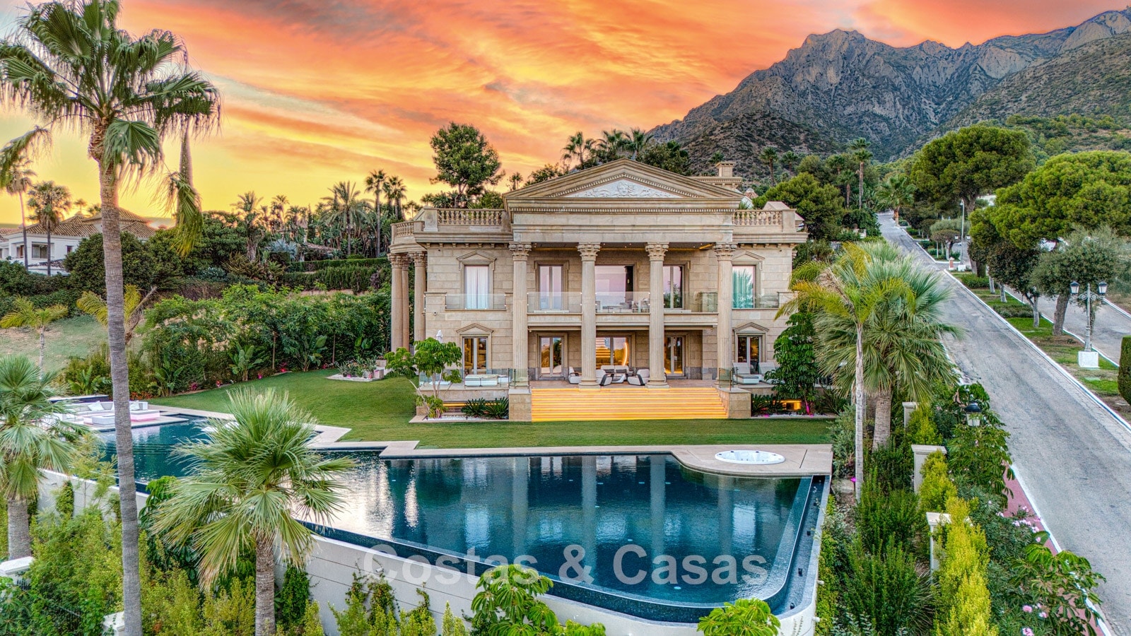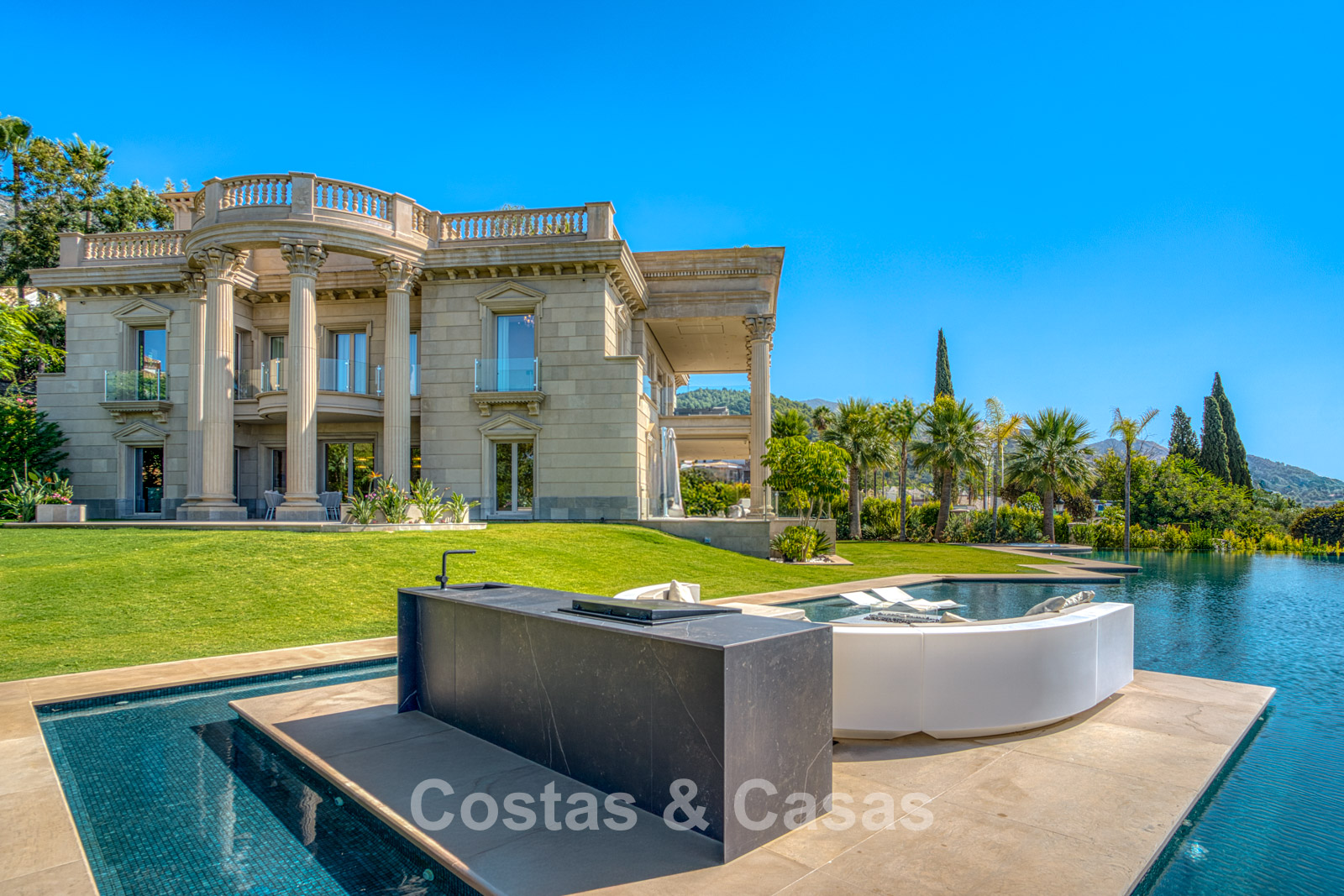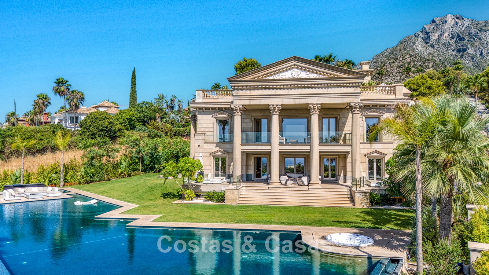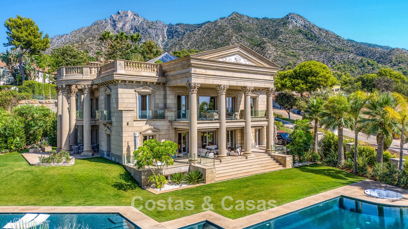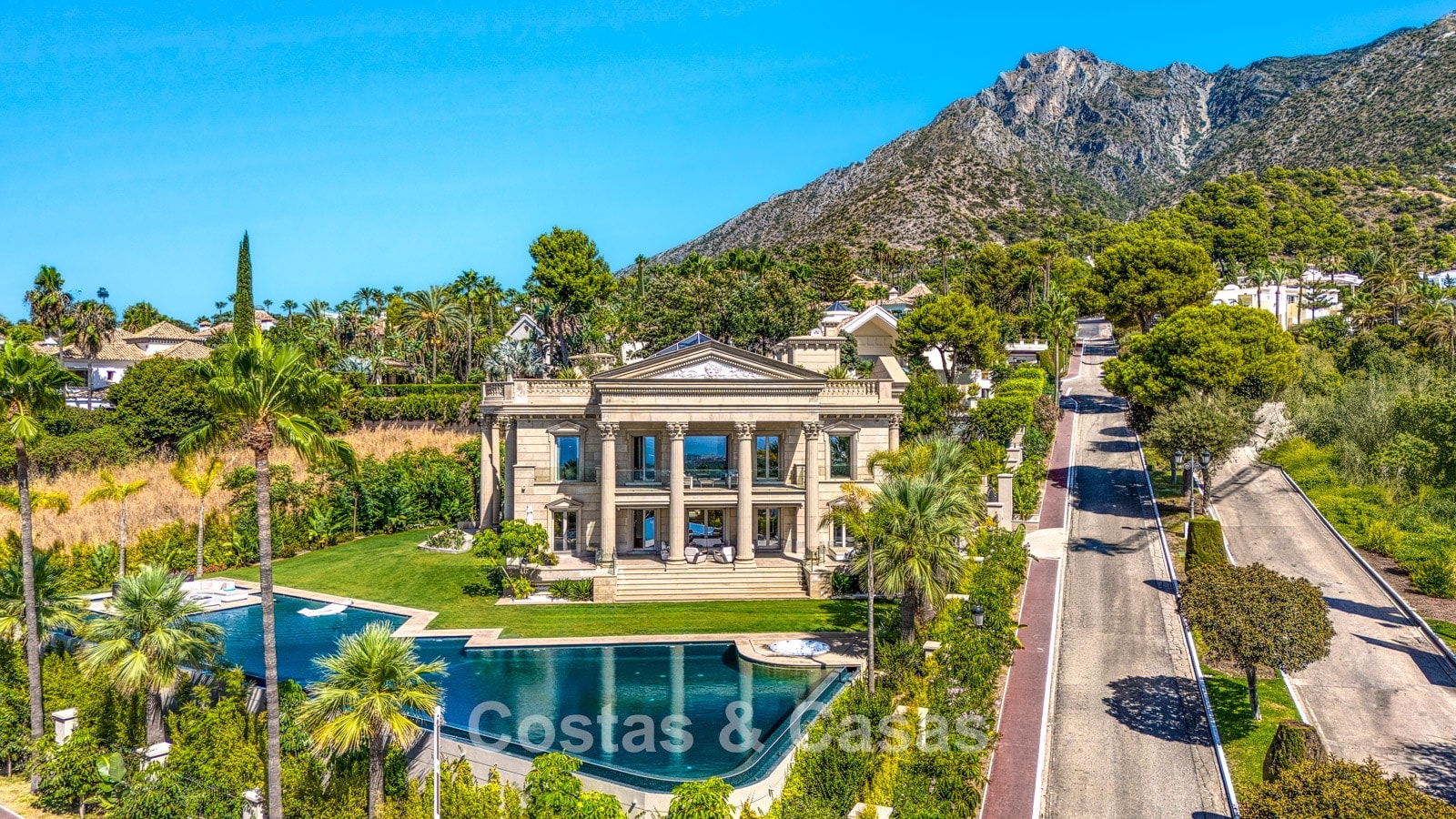 Detached villa with an exceptional design inspired by classical Greek and Roman architecture, yet translated into a contemporary, luxurious setting. Colossal French columns with Corinthian capitals dominate the exterior facades. The entrance hall exudes pure grandeur with its double-height ceiling and monumental double staircasesurrounded by elegant columns. Spacious living and dining areas. Ultra-modern, fully equipped kitchen. 7 bedrooms, 10 bathrooms, and separate toilet. The spectacular master suite features a large private terrace and separate walk-in closets for him and her. A private spa, including a heated indoor pool, a fully equipped gym, sauna, and jacuzzi. 2 separate guest apartments. Fully equipped gym. 2 climate-controlled wine cellars. Indoor garage for 5 cars.