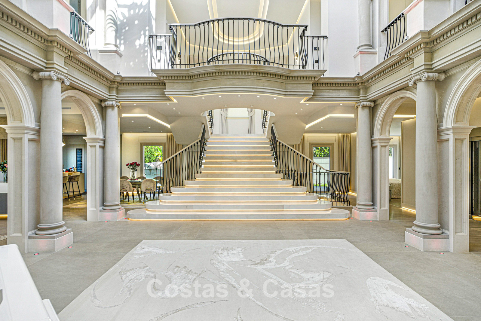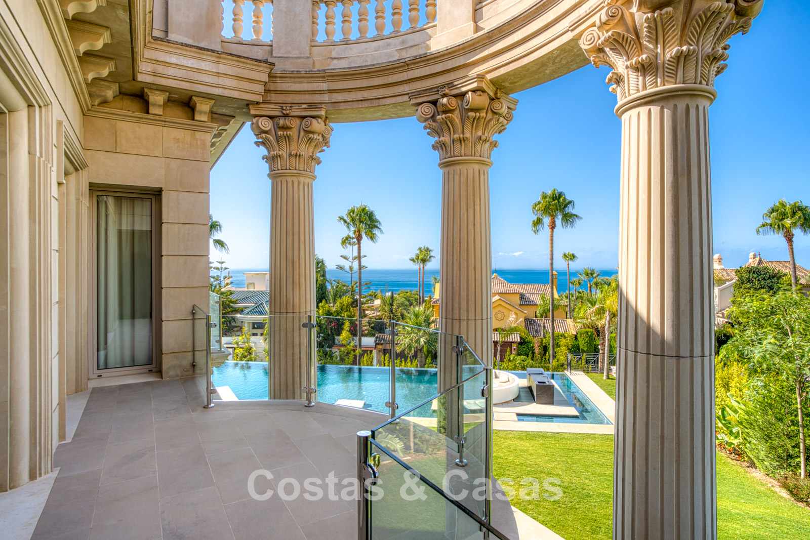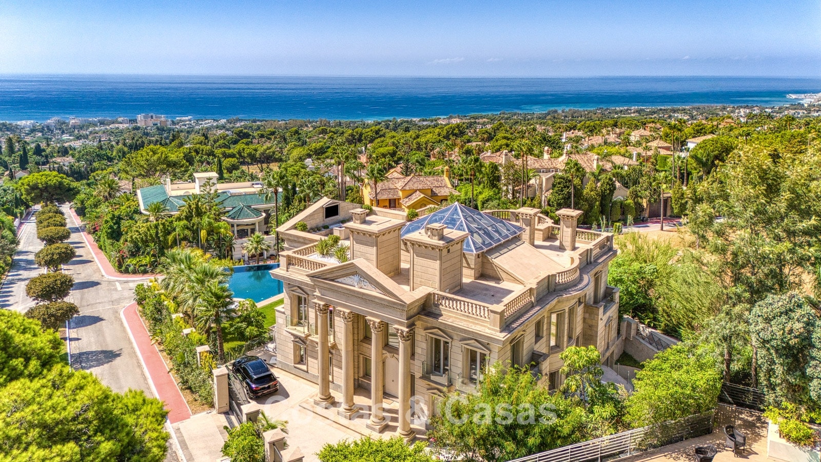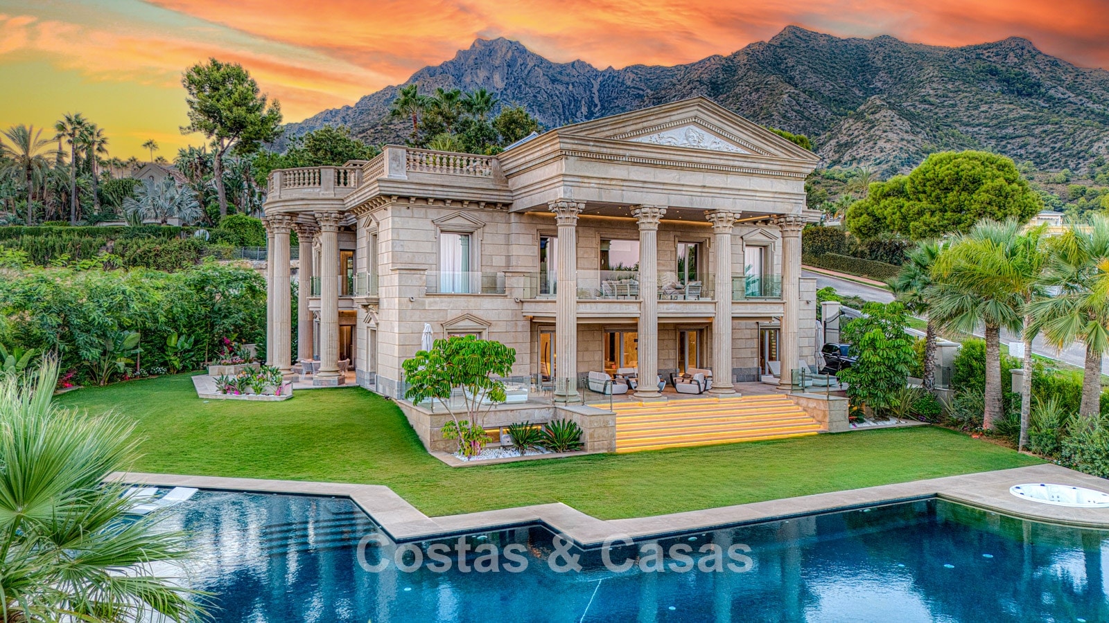 Detached villa with an exceptional design inspired by classical Greek and Roman architecture, yet translated into a contemporary, luxurious setting. Colossal French columns with Corinthian capitals dominate the exterior facades. The entrance hall exudes pure grandeur with its double-height ceiling and monumental double staircasesurrounded by elegant columns. Spacious living and dining areas. Ultra-modern, fully equipped kitchen. 7 bedrooms, 10 bathrooms, and separate toilet. The spectacular master suite features a large private terrace and separate walk-in closets for him and her. A private spa, including a heated indoor pool, a fully equipped gym, sauna, and jacuzzi. 2 separate guest apartments. Fully equipped gym. 2 climate-controlled wine cellars. Indoor garage for 5 cars.