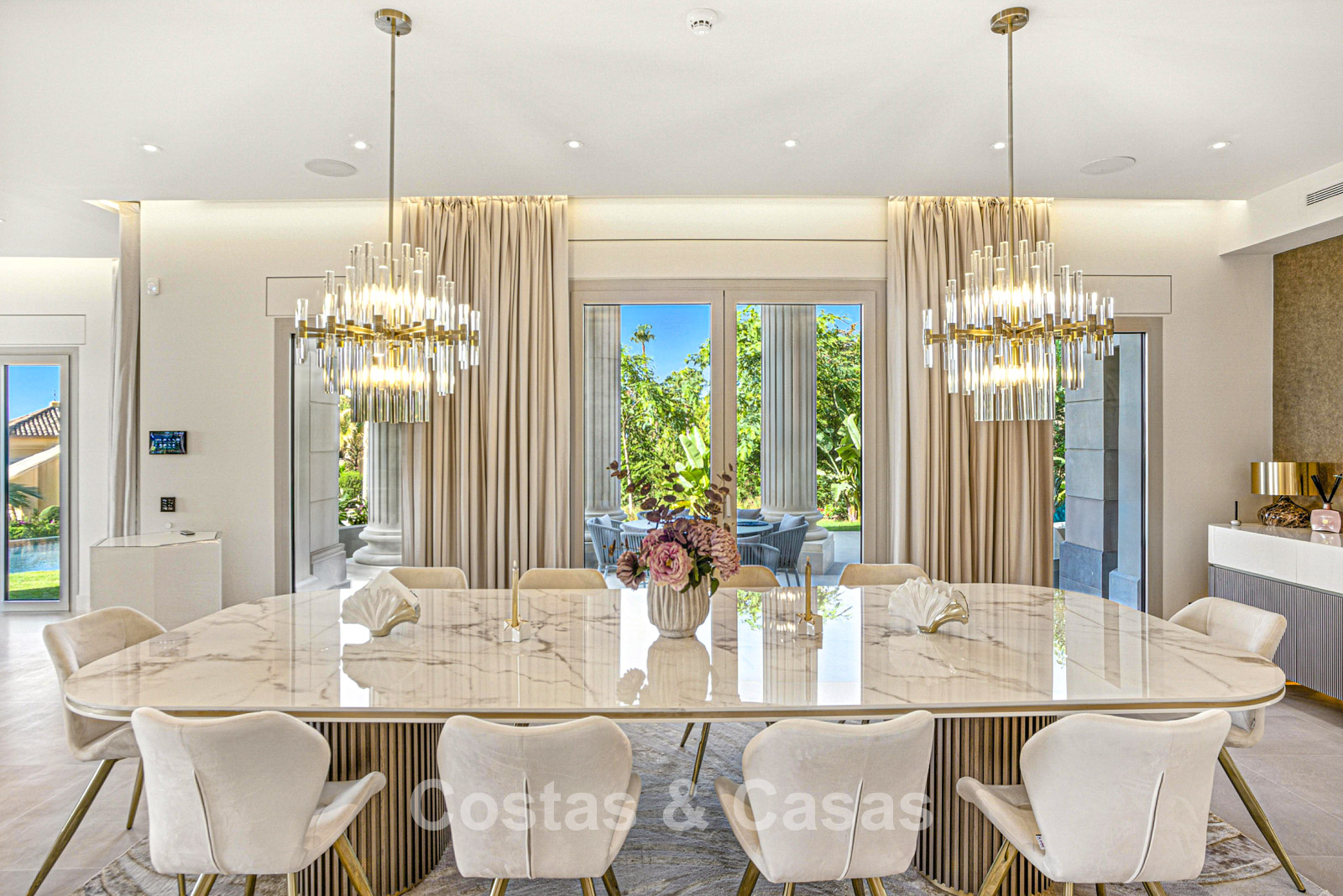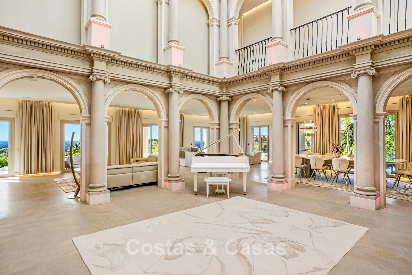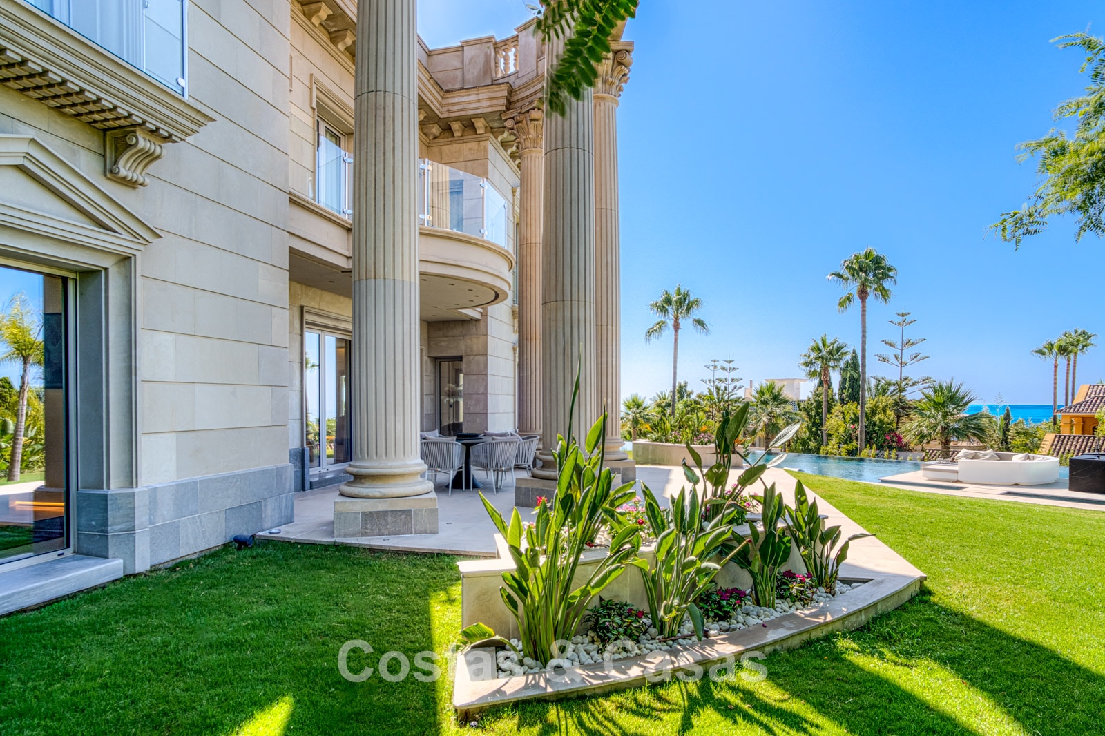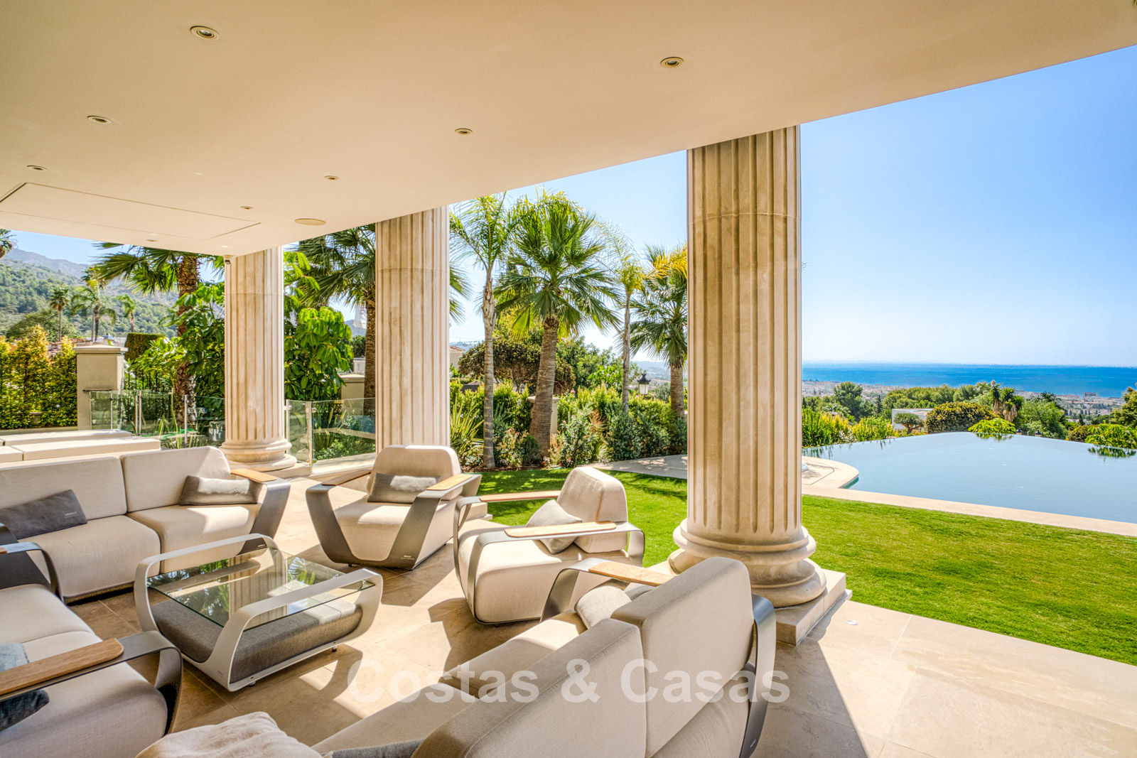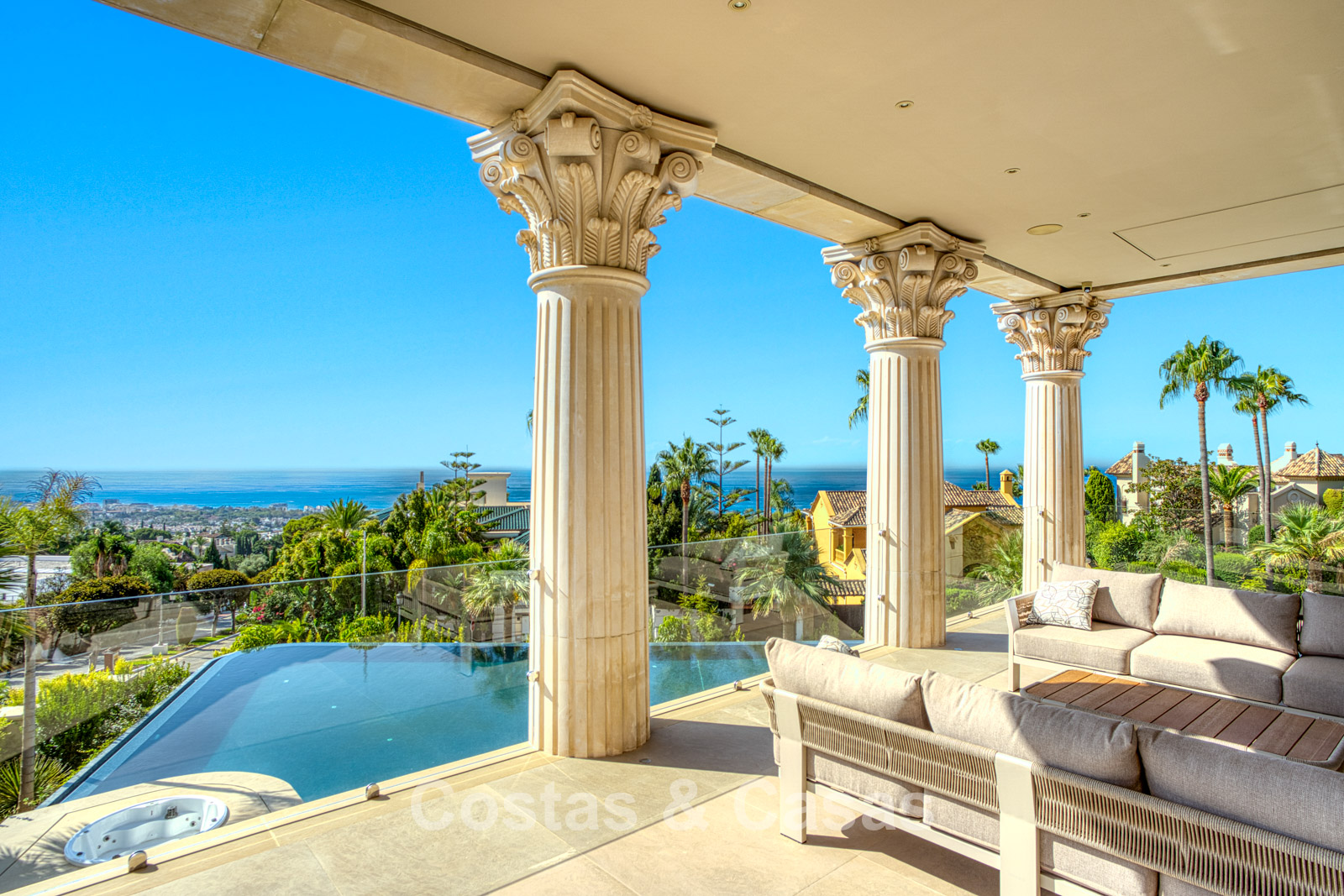 Detached villa with an exceptional design inspired by classical Greek and Roman architecture, yet translated into a contemporary, luxurious setting. Colossal French columns with Corinthian capitals dominate the exterior facades. The entrance hall exudes pure grandeur with its double-height ceiling and monumental double staircasesurrounded by elegant columns. Spacious living and dining areas. Ultra-modern, fully equipped kitchen. 7 bedrooms, 10 bathrooms, and separate toilet. The spectacular master suite features a large private terrace and separate walk-in closets for him and her. A private spa, including a heated indoor pool, a fully equipped gym, sauna, and jacuzzi. 2 separate guest apartments. Fully equipped gym. 2 climate-controlled wine cellars. Indoor garage for 5 cars.