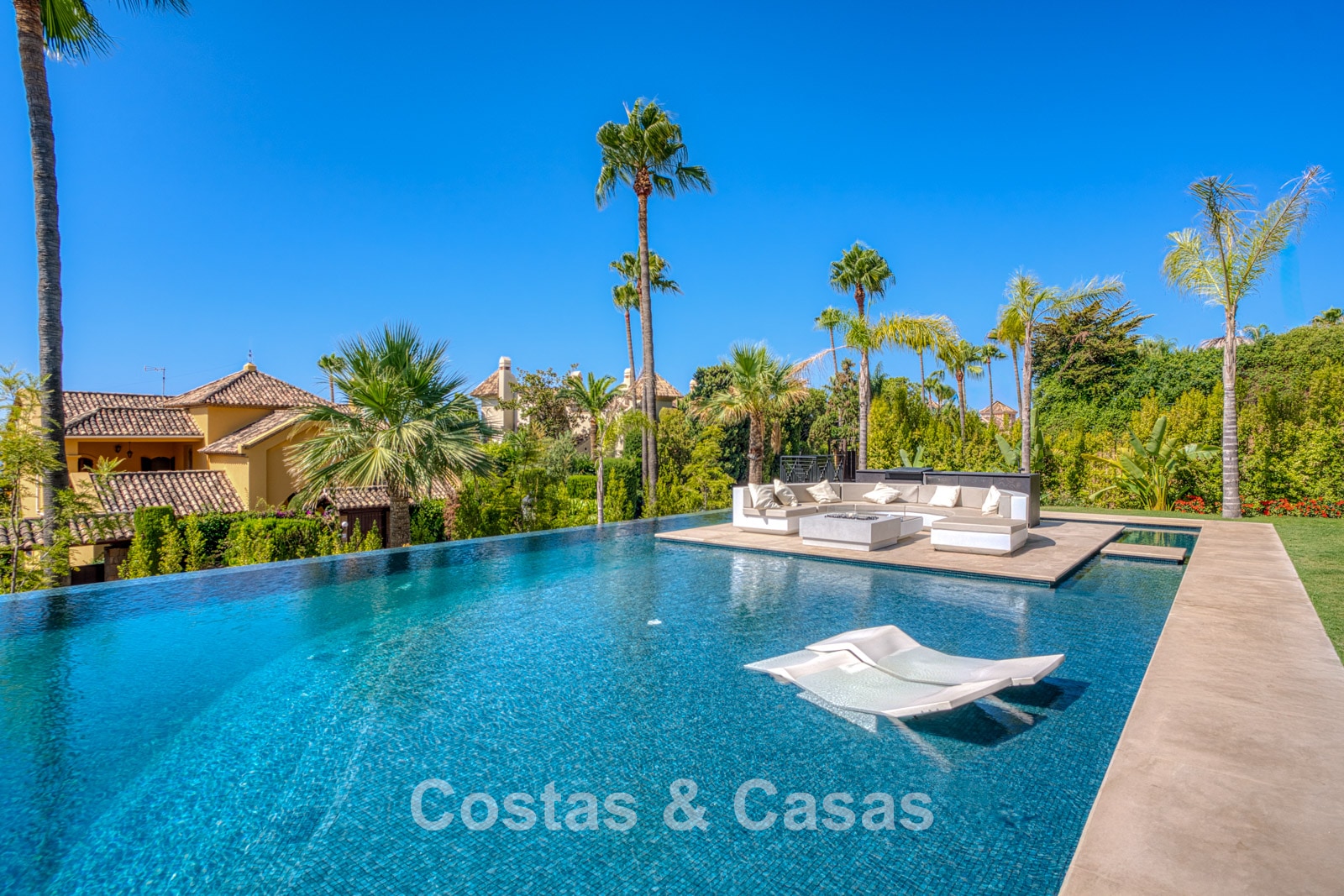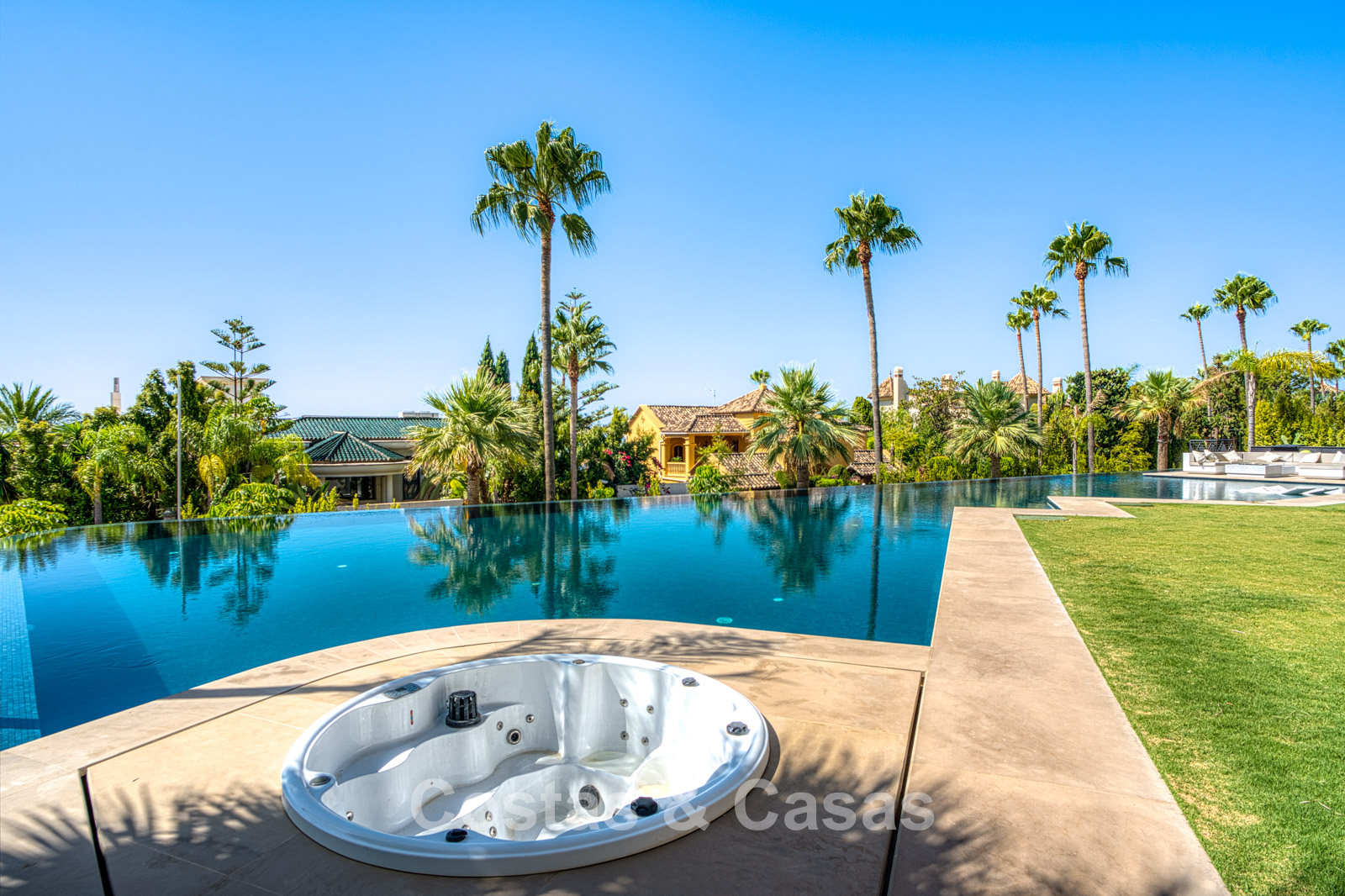 Situated on a generous, fully enclosed plot. One of the largest heated outdoor pools in Spain is a breathtaking infinity masterpiece with a built-in jacuzzi and a floating platform that combines a luxurious outdoor kitchen and stylish lounge. Expansive terraces with various orientations offer an unparalleled sense of space, perfectly designed to enjoy sun, views, and refined outdoor living at any time of day. The roof terrace is a spectacular vantage point, a luxurious oasis, with an open-air cinema and a stylish bar as the center of exclusive relaxation. South-facing. Phenomenal panoramic views of the Mediterranean Sea and the iconic La Concha mountain.