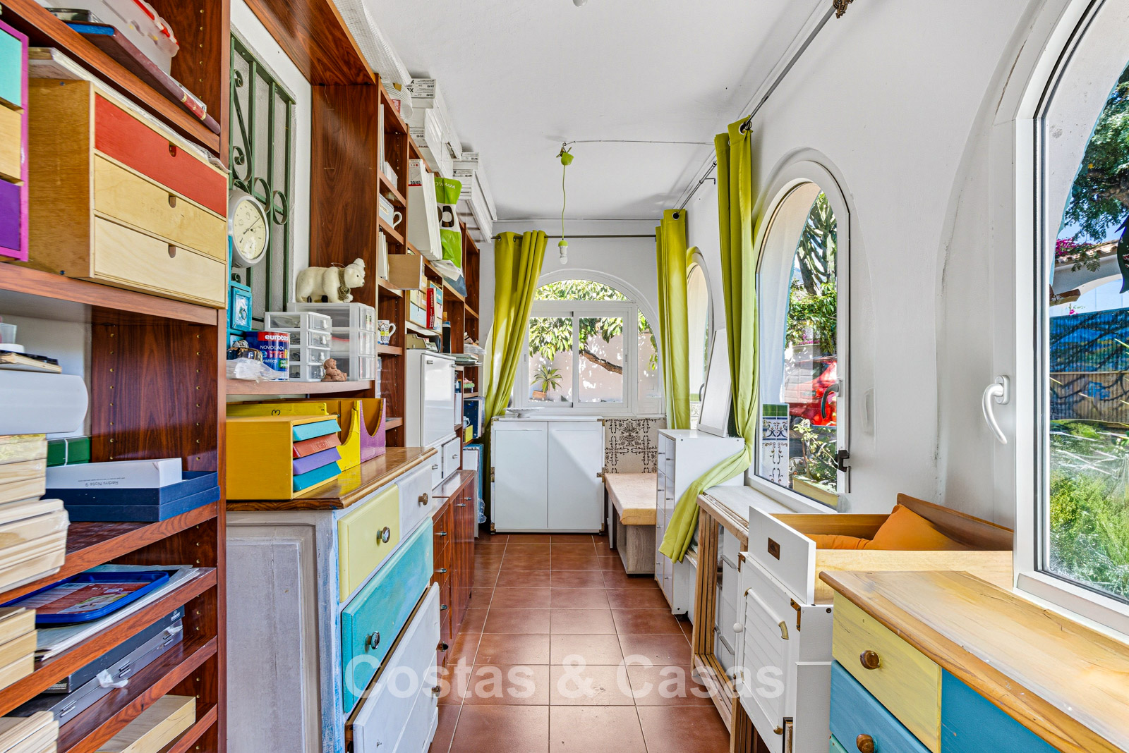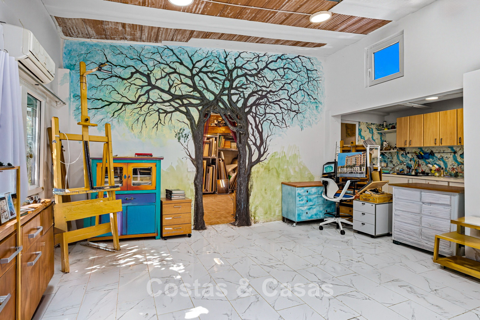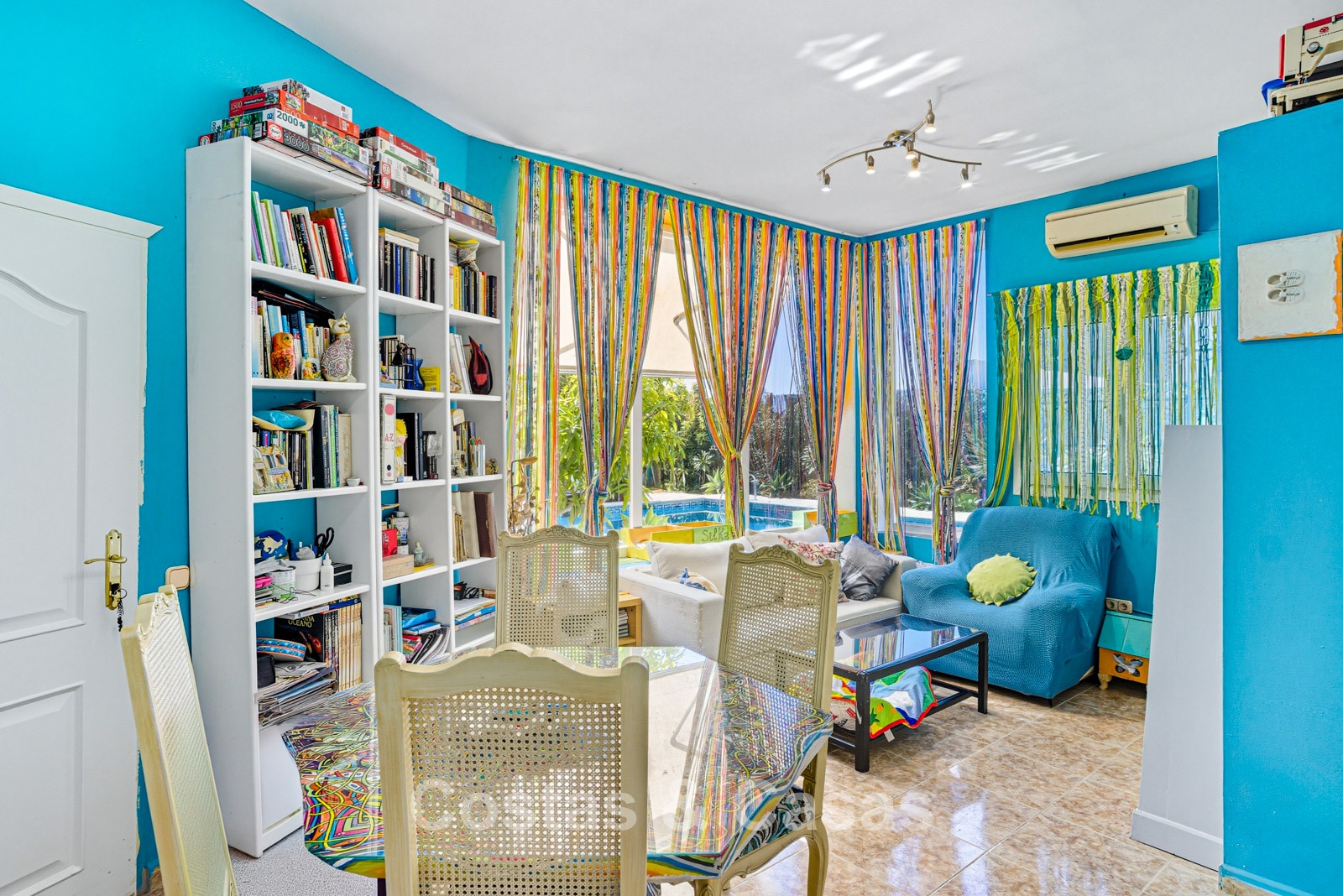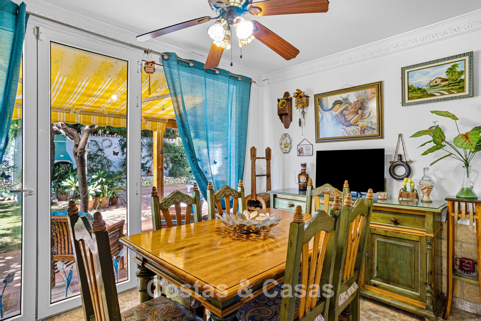 Single-story, detached house with a charming Mediterranean architectural style. The interior is artistically and creatively decorated. TV lounge with adjoining dining room. Separate, fully equipped kitchen. 5 bedrooms, 3 bathrooms. Independent guest house with its own kitchen and bathroom. Laundry room. Parking for 2 cars on the property.