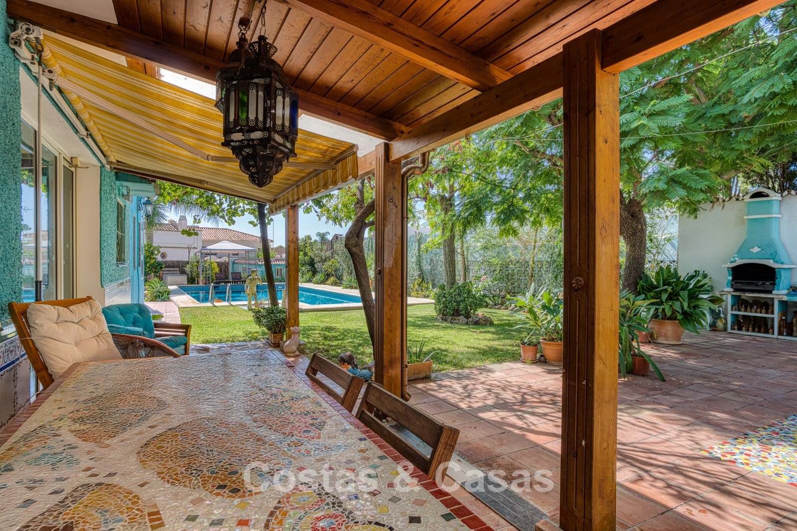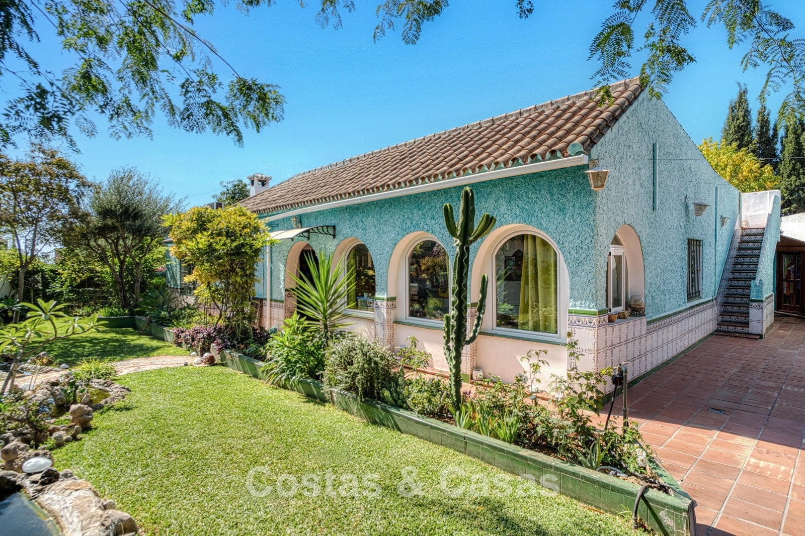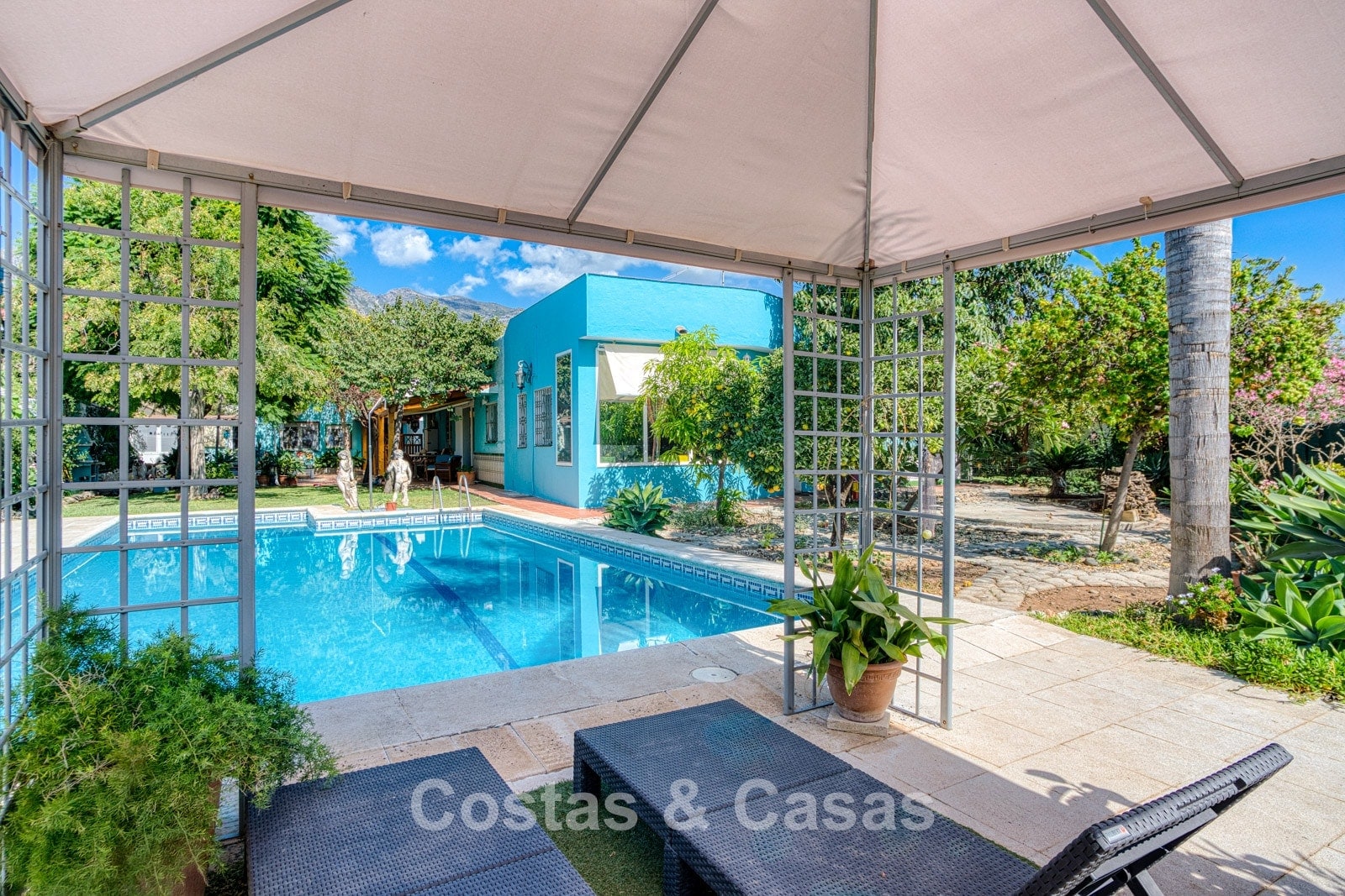 Single-story, detached house with a charming Mediterranean architectural style. The interior is artistically and creatively decorated. TV lounge with adjoining dining room. Separate, fully equipped kitchen. 5 bedrooms, 3 bathrooms. Independent guest house with its own kitchen and bathroom. Laundry room. Parking for 2 cars on the property.