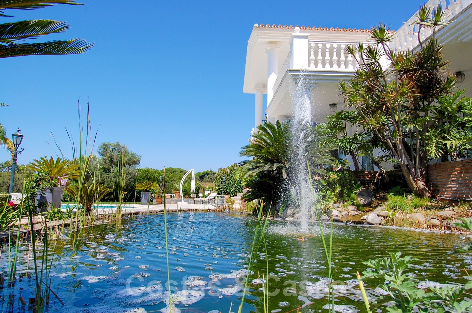Very large mature and landscaped garden with fruit trees and water features like a pond with fishes and plenty of green area covered by grass and palm trees.