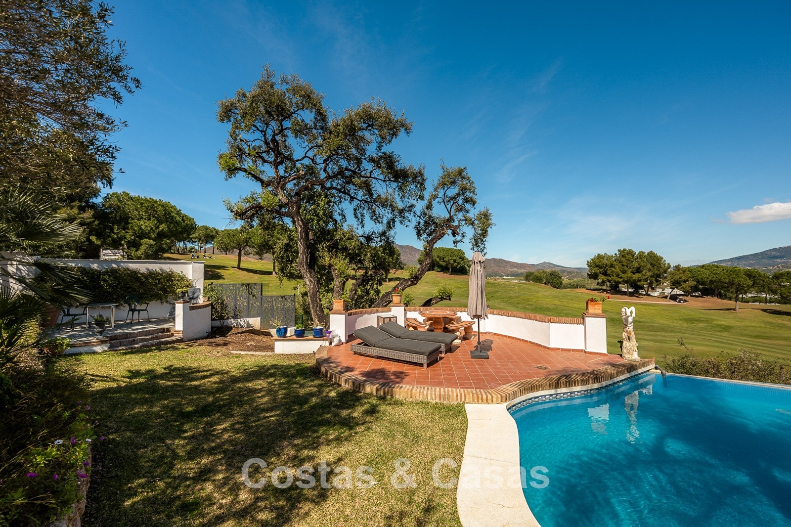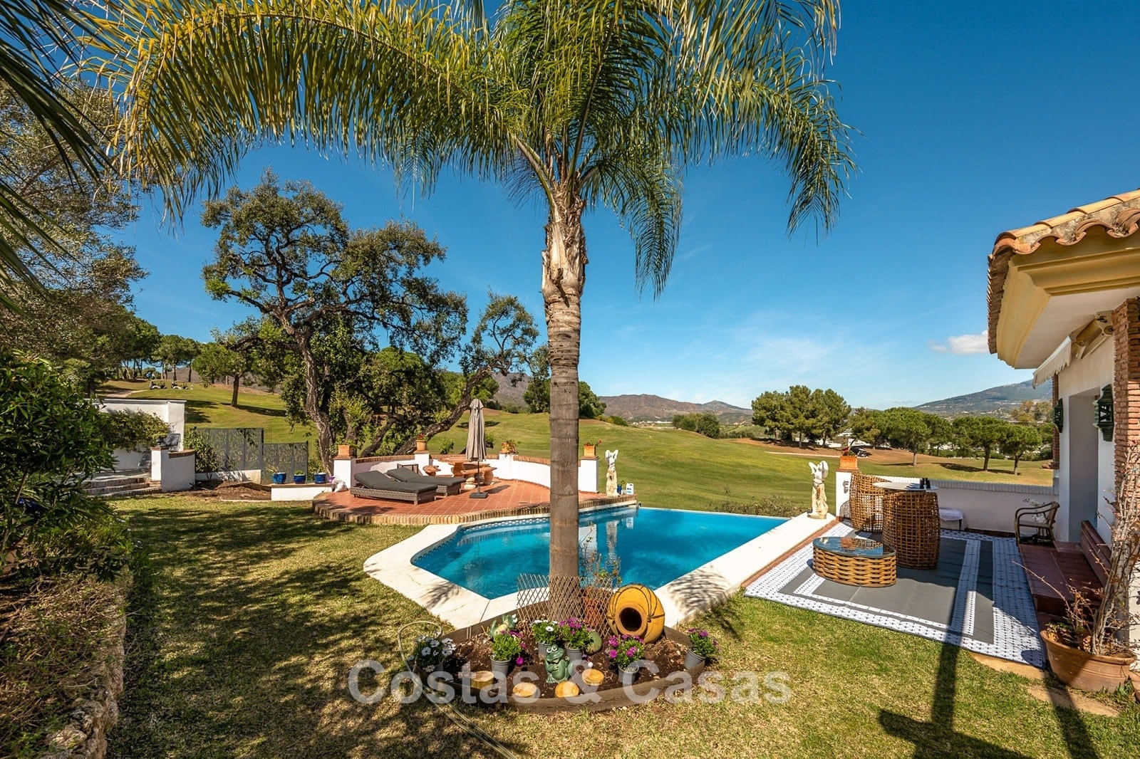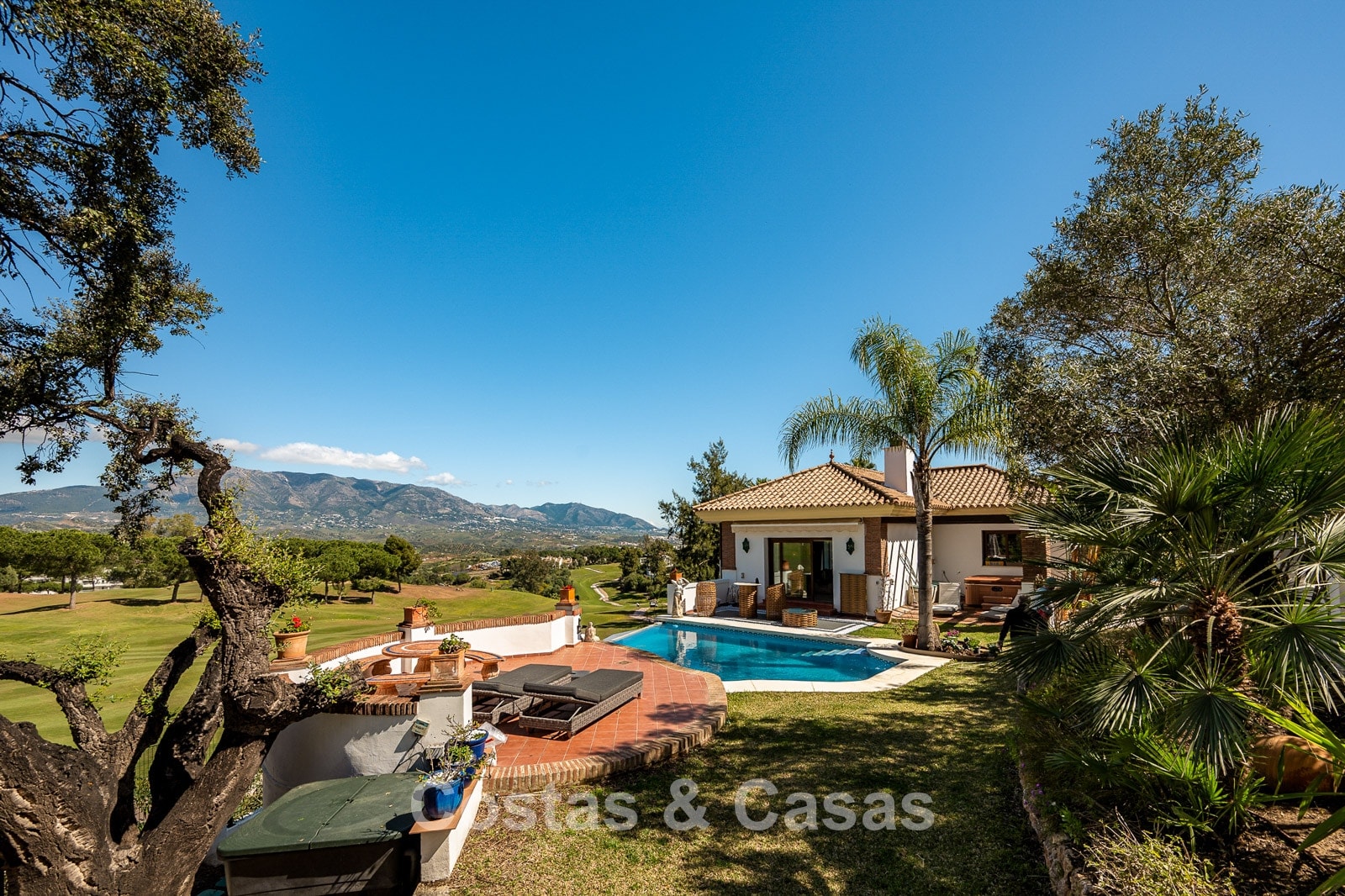 Spacious, fully fenced plot of over 1,100 m² Beautifully landscaped gardens and multiple terraces Stunning private swimming pool with direct golf views Optimally oriented to enjoy sunshine throughout the day Panoramic views of the mountains, golf course, and garden