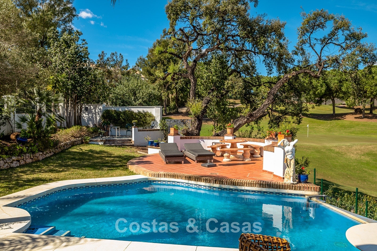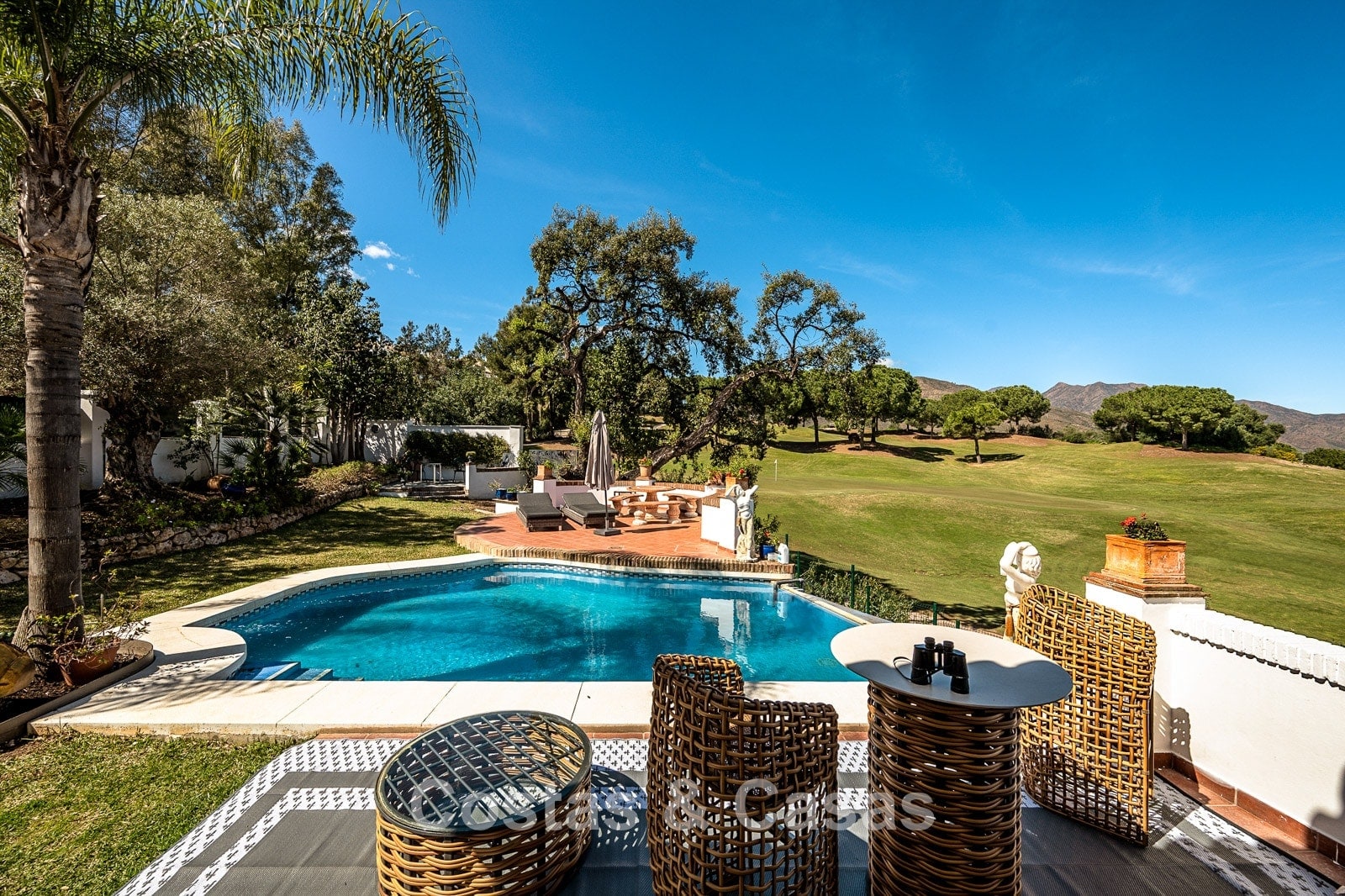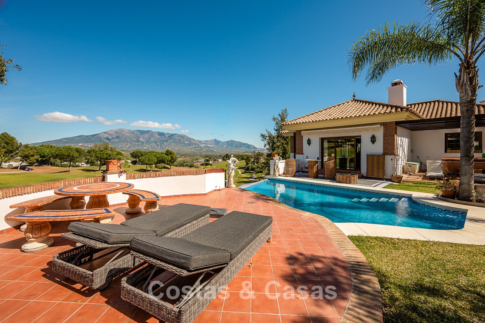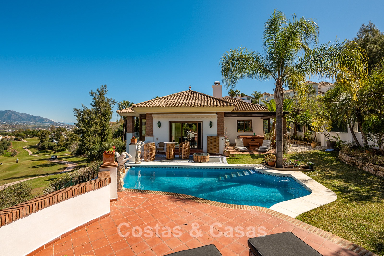 Spacious, fully fenced plot of over 1,100 m² Beautifully landscaped gardens and multiple terraces Stunning private swimming pool with direct golf views Optimally oriented to enjoy sunshine throughout the day Panoramic views of the mountains, golf course, and garden